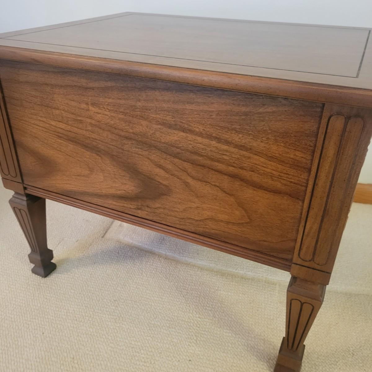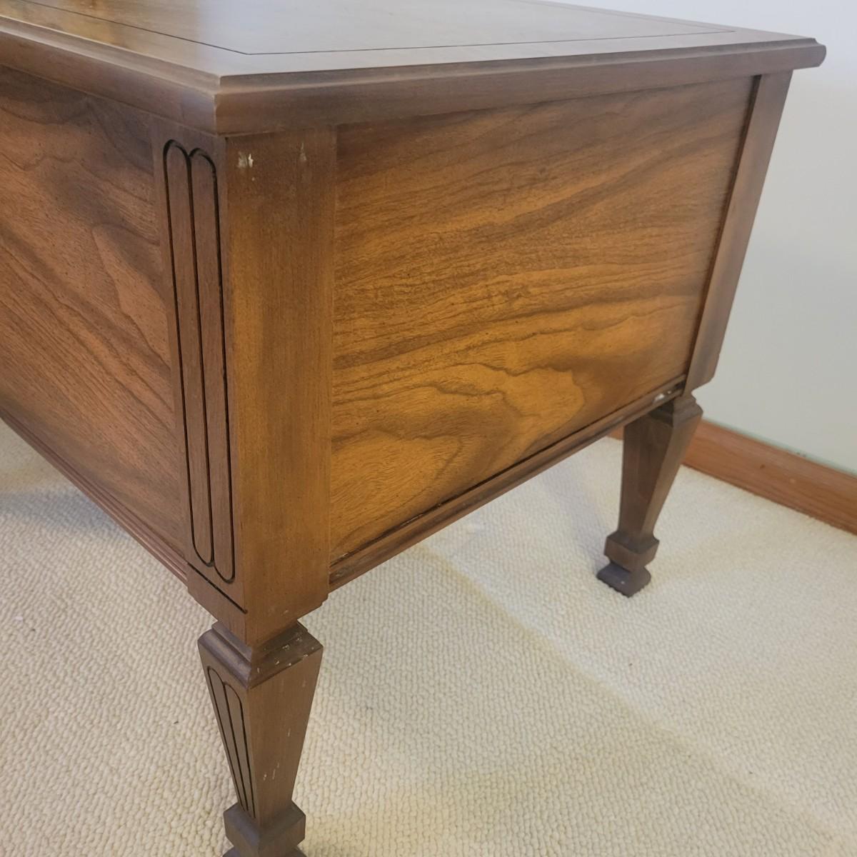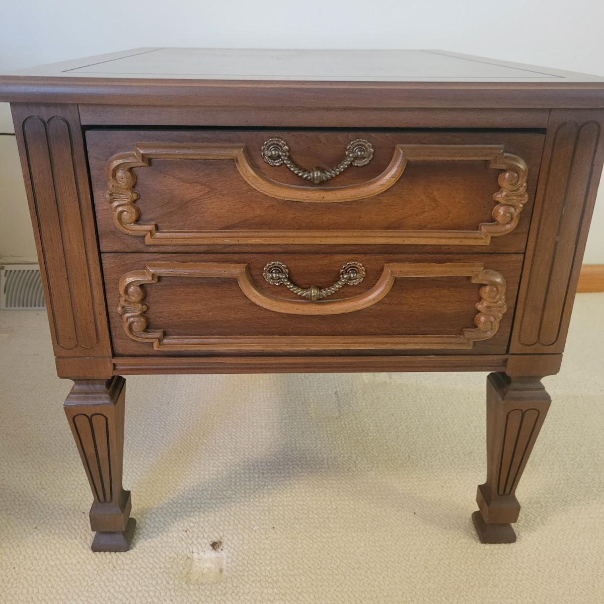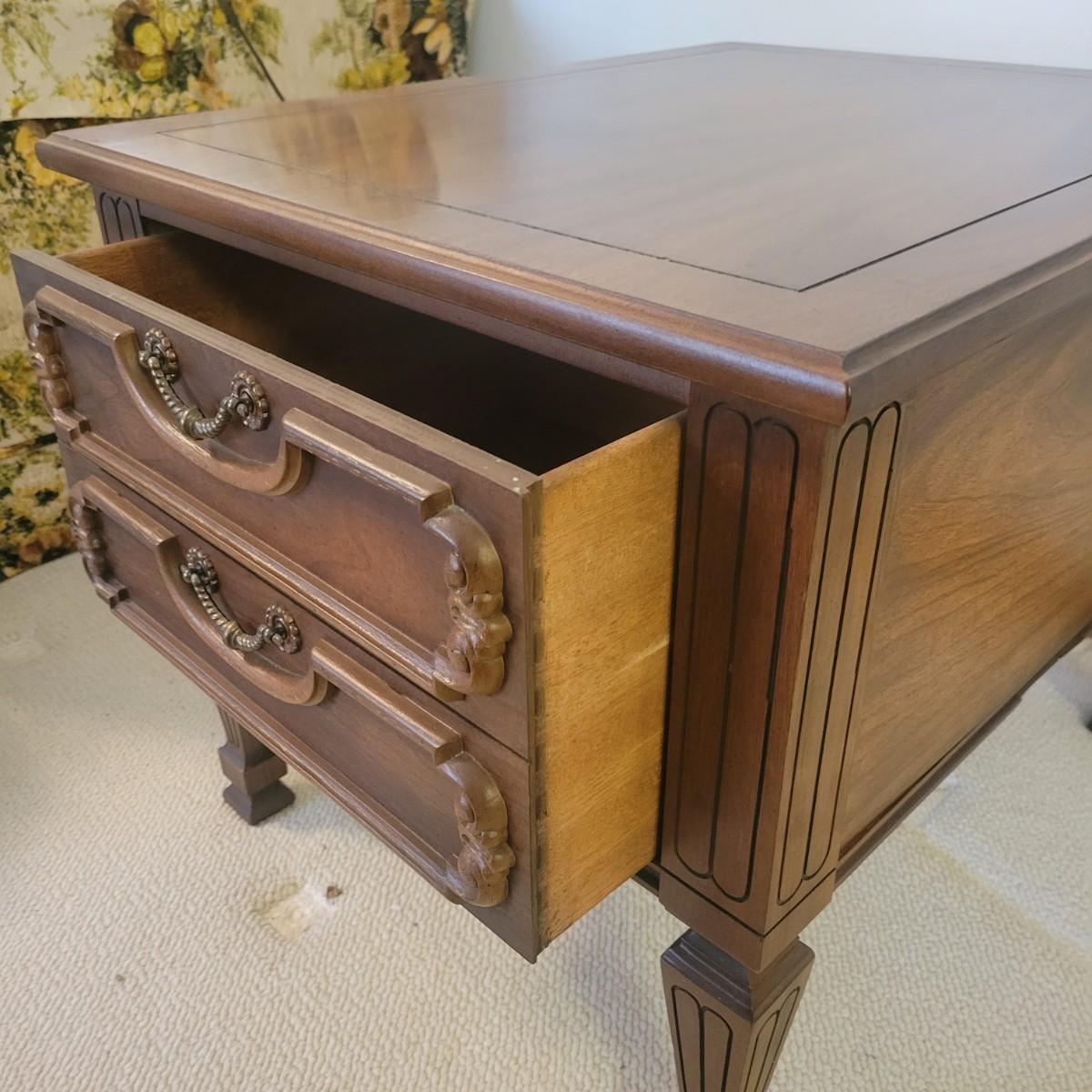 A vintage wooden side table that features one dovetailed drawer with brass hardware and decorative wood accents. There are decorative designs on the legs and corners. This piece measures approximately 22" x 27" x 21". The table is in good condition with a few minor blemishes. A matching coffee table is found in this auction in lot #231. Local pickup only