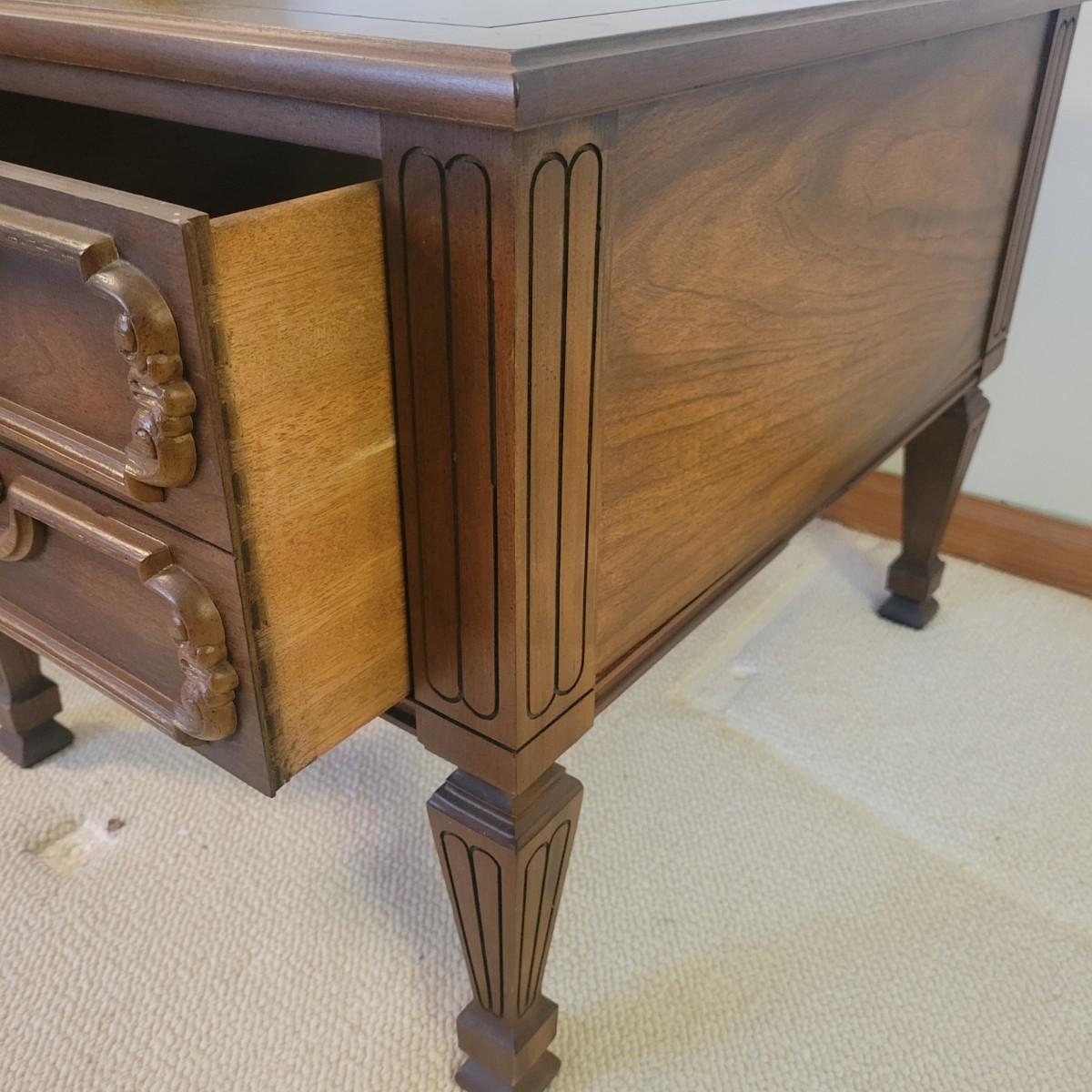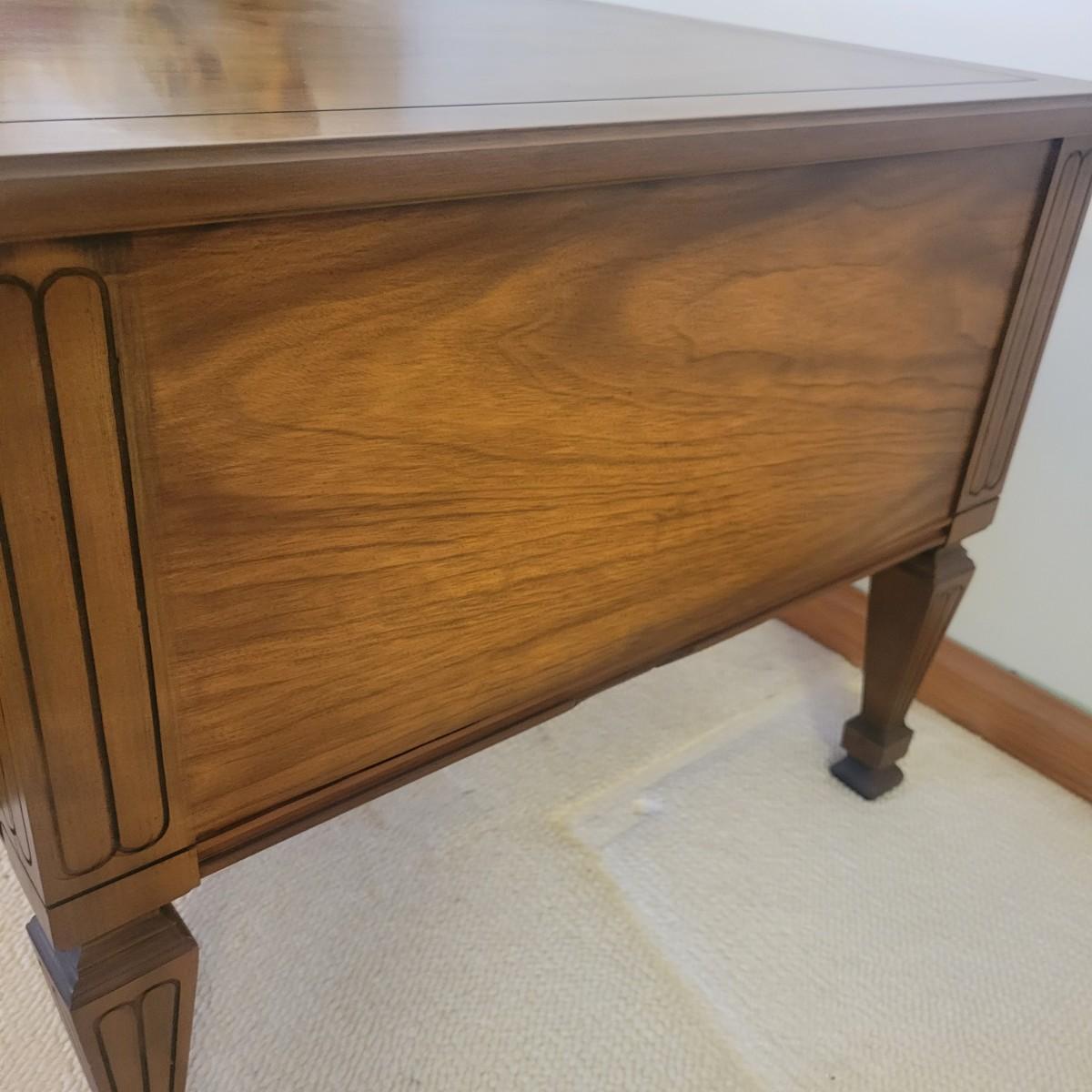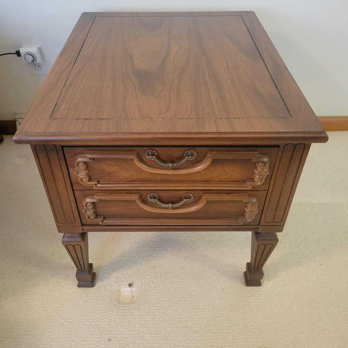 A vintage wooden side table that features one dovetailed drawer with brass hardware and decorative wood accents. There are decorative designs on the legs and corners. This piece measures approximately 22" x 27" x 21". The table is in good condition with a few minor blemishes. A matching coffee table is found in this auction in lot #231. Local pickup only