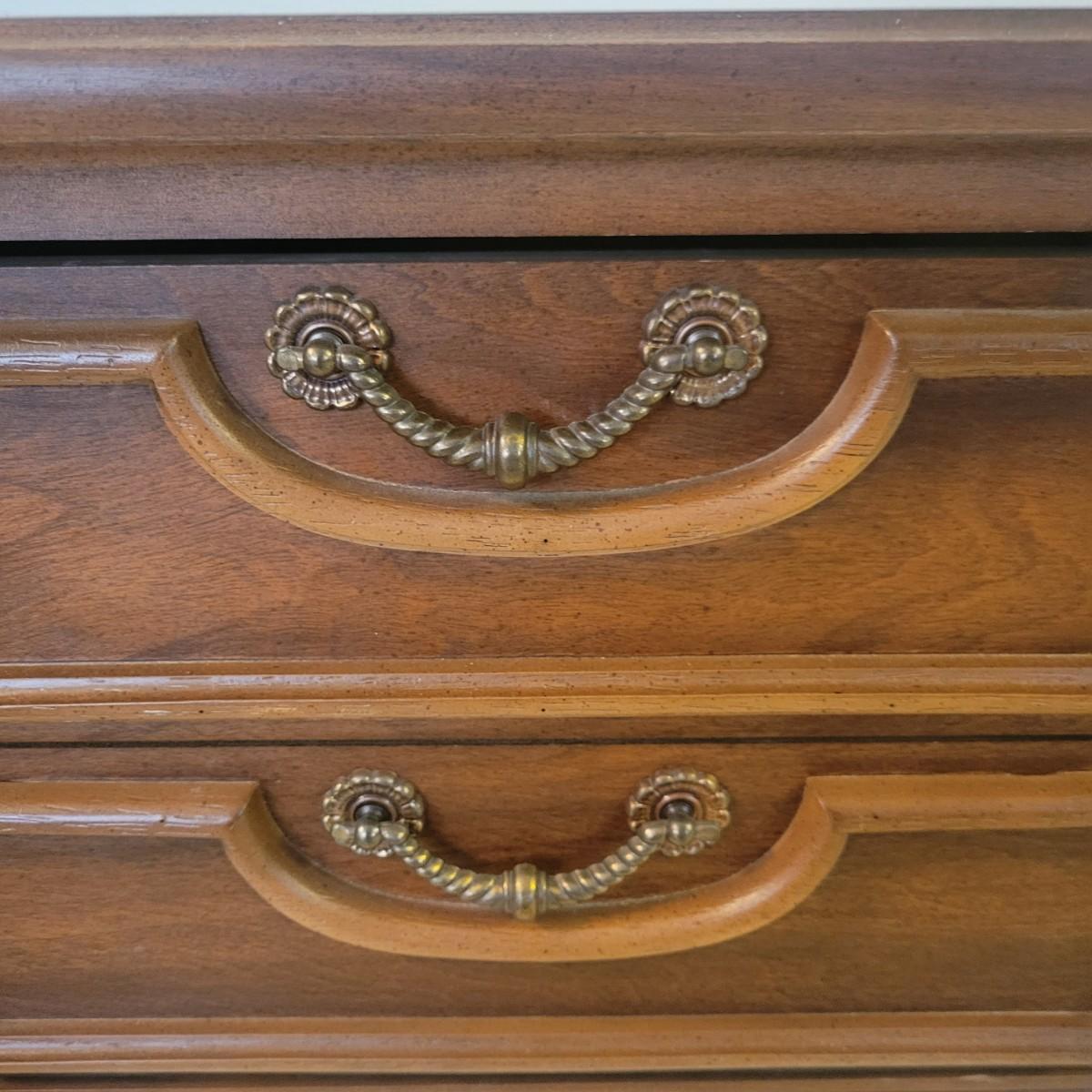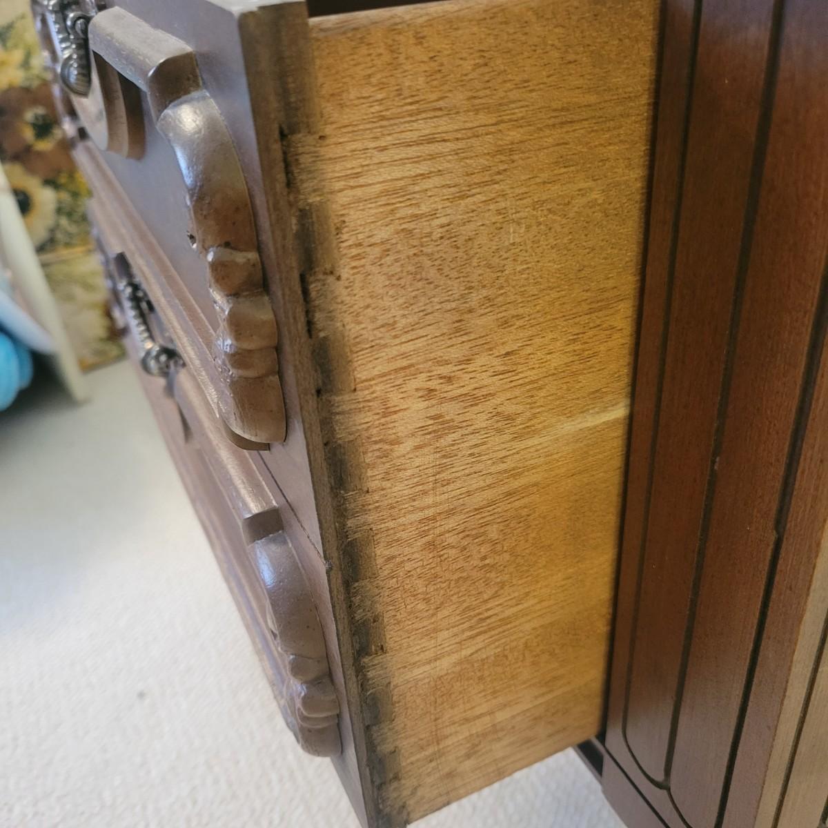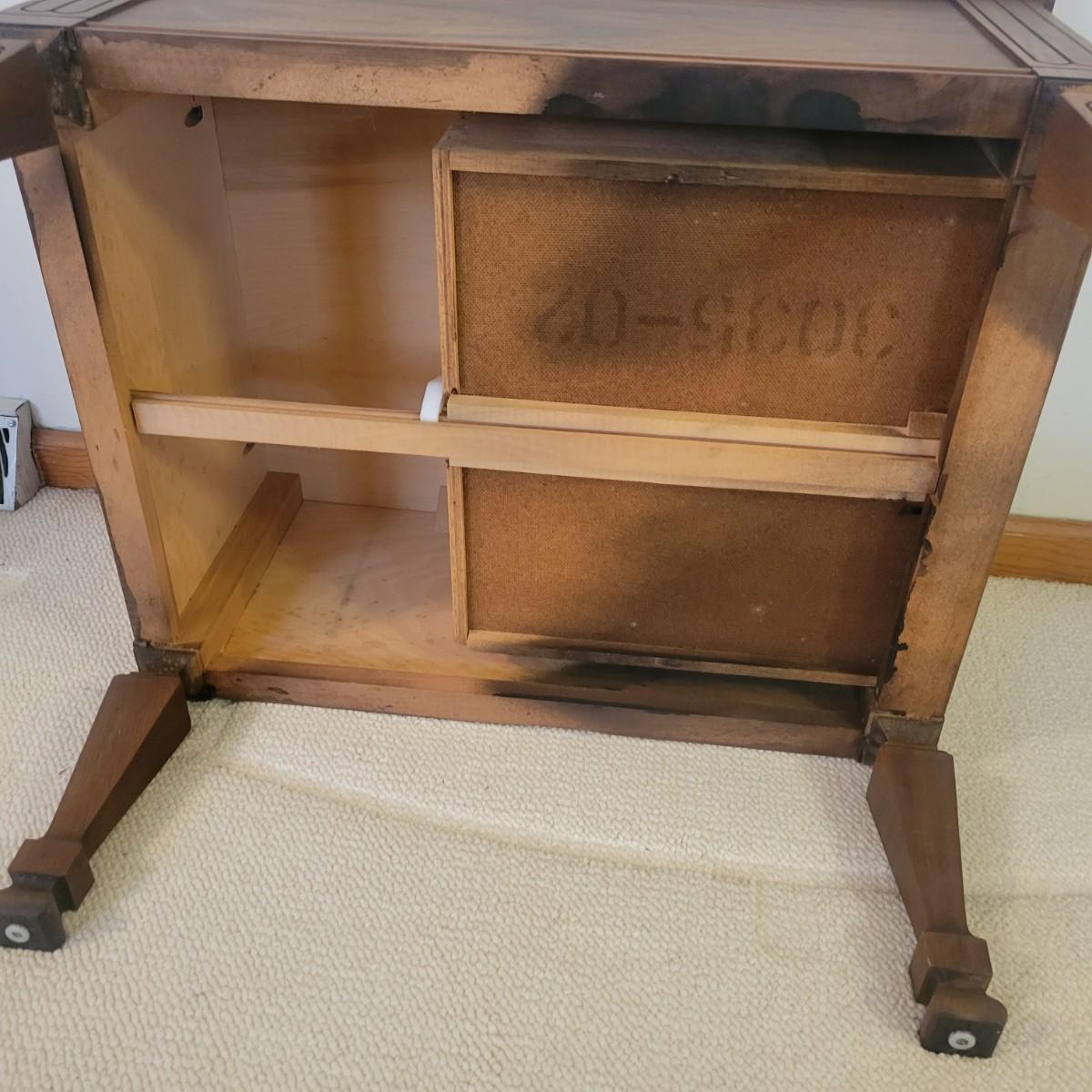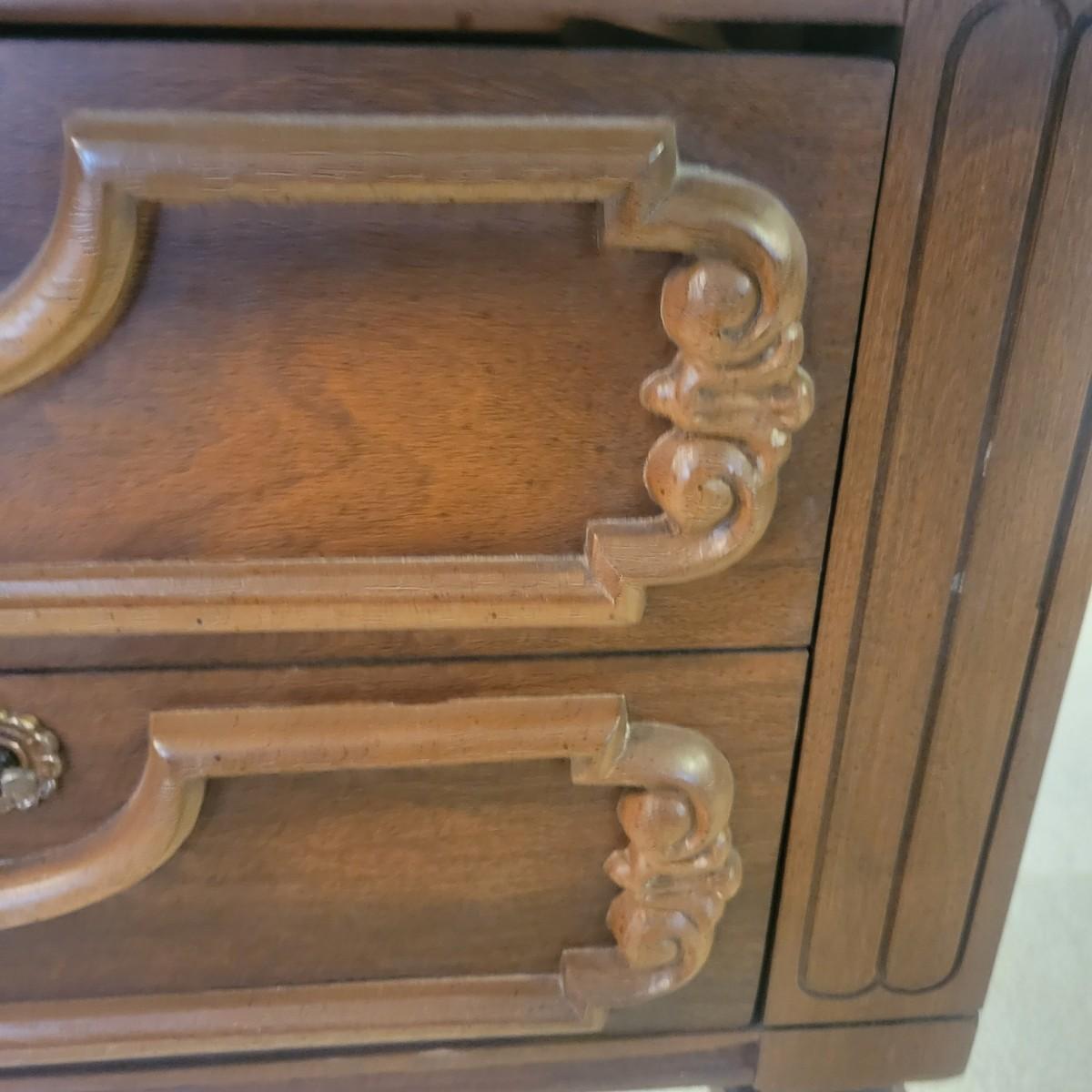 A vintage wooden side table that features one dovetailed drawer with brass hardware and decorative wood accents. There are decorative designs on the legs and corners. This piece measures approximately 22" x 27" x 21". The table is in good condition with a few minor blemishes. A matching coffee table is found in this auction in lot #231. Local pickup only