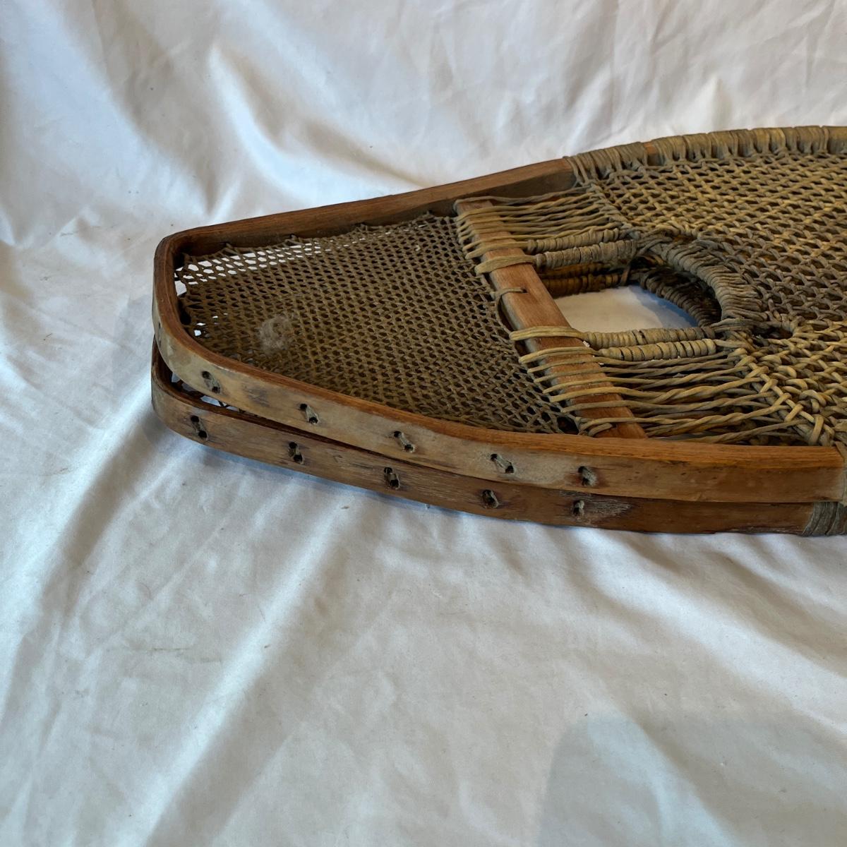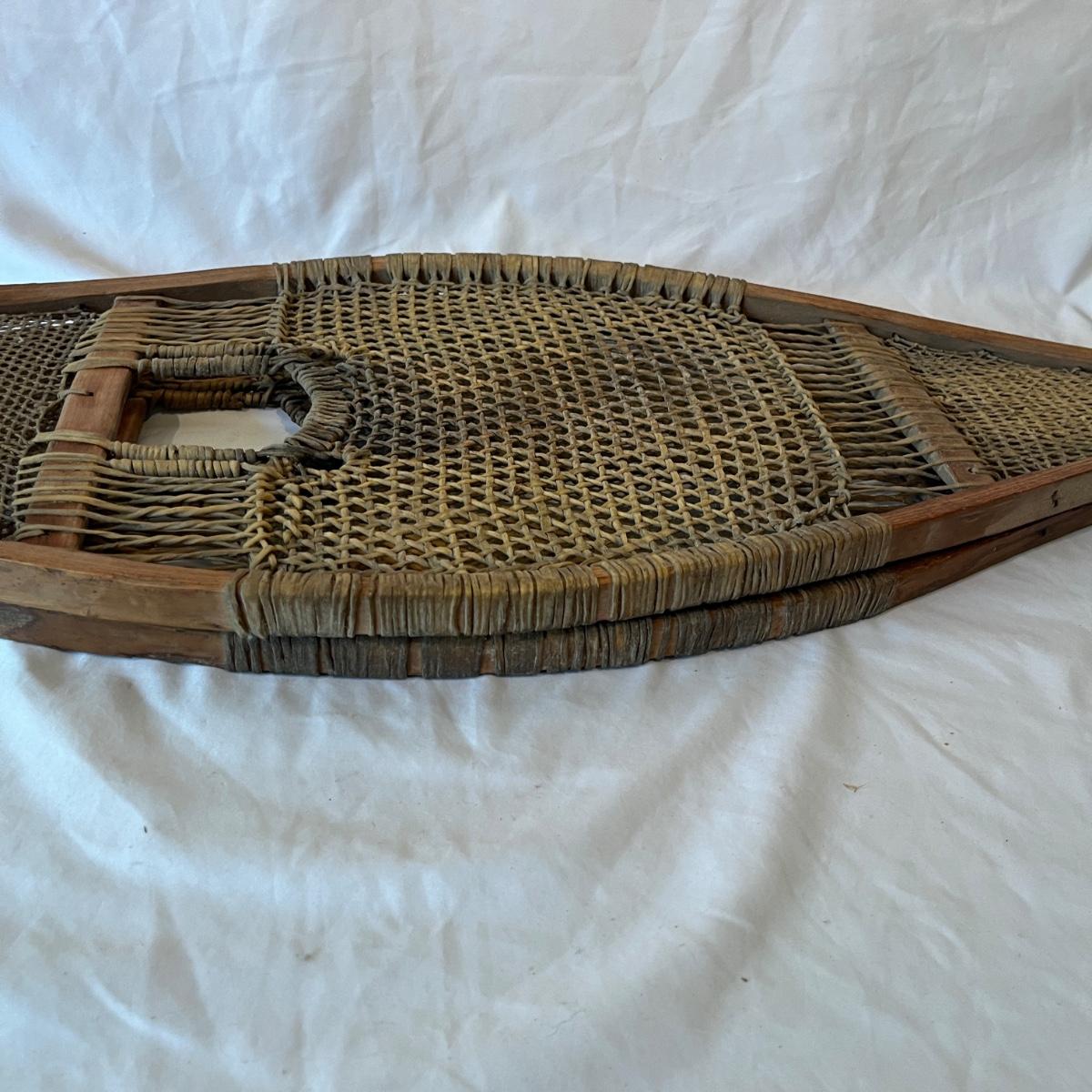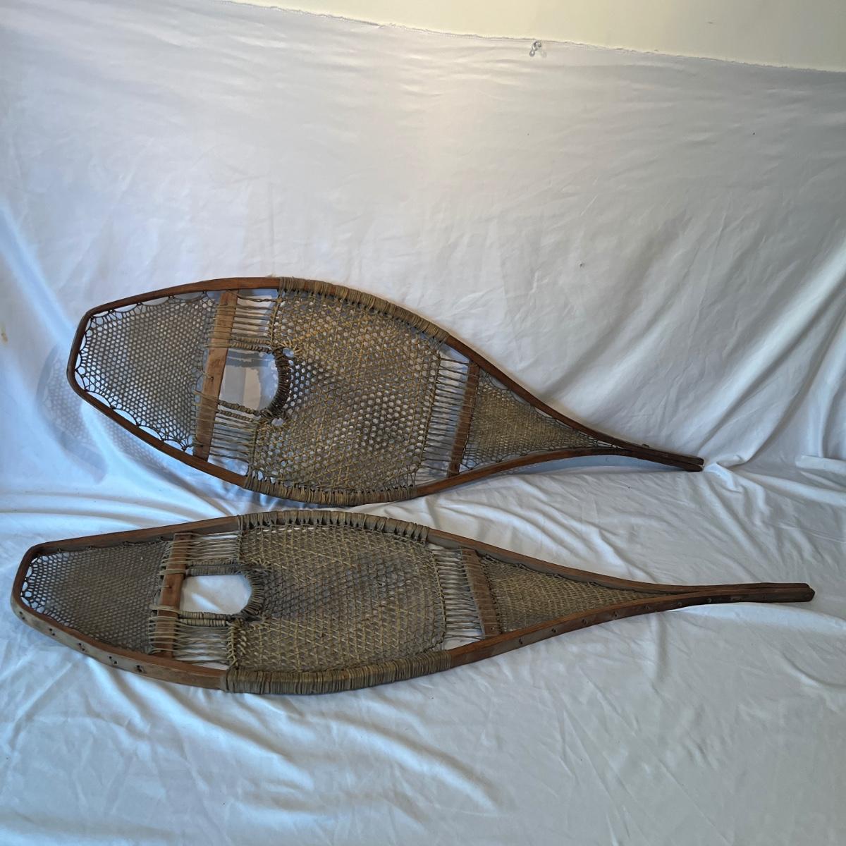 Lot includes a pair of vintage wooden snow shoes that measure 13” x .75” x 42”long.