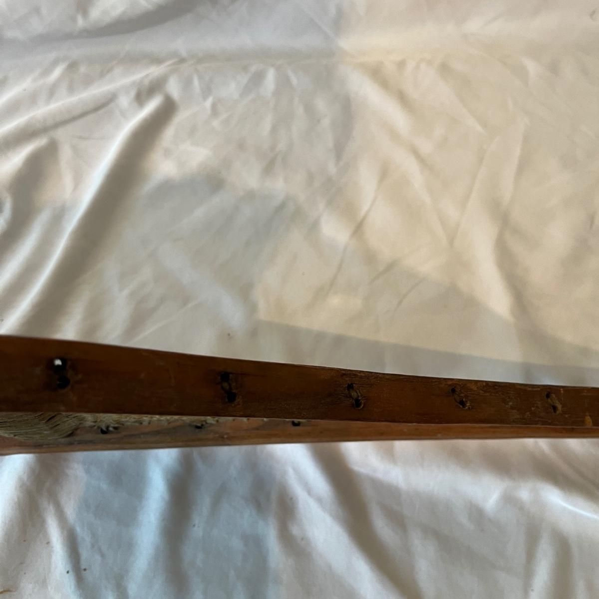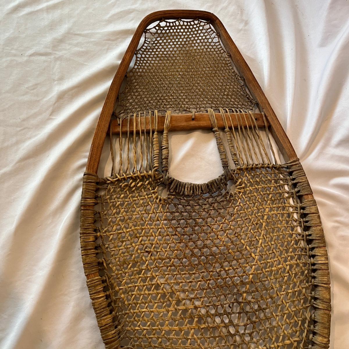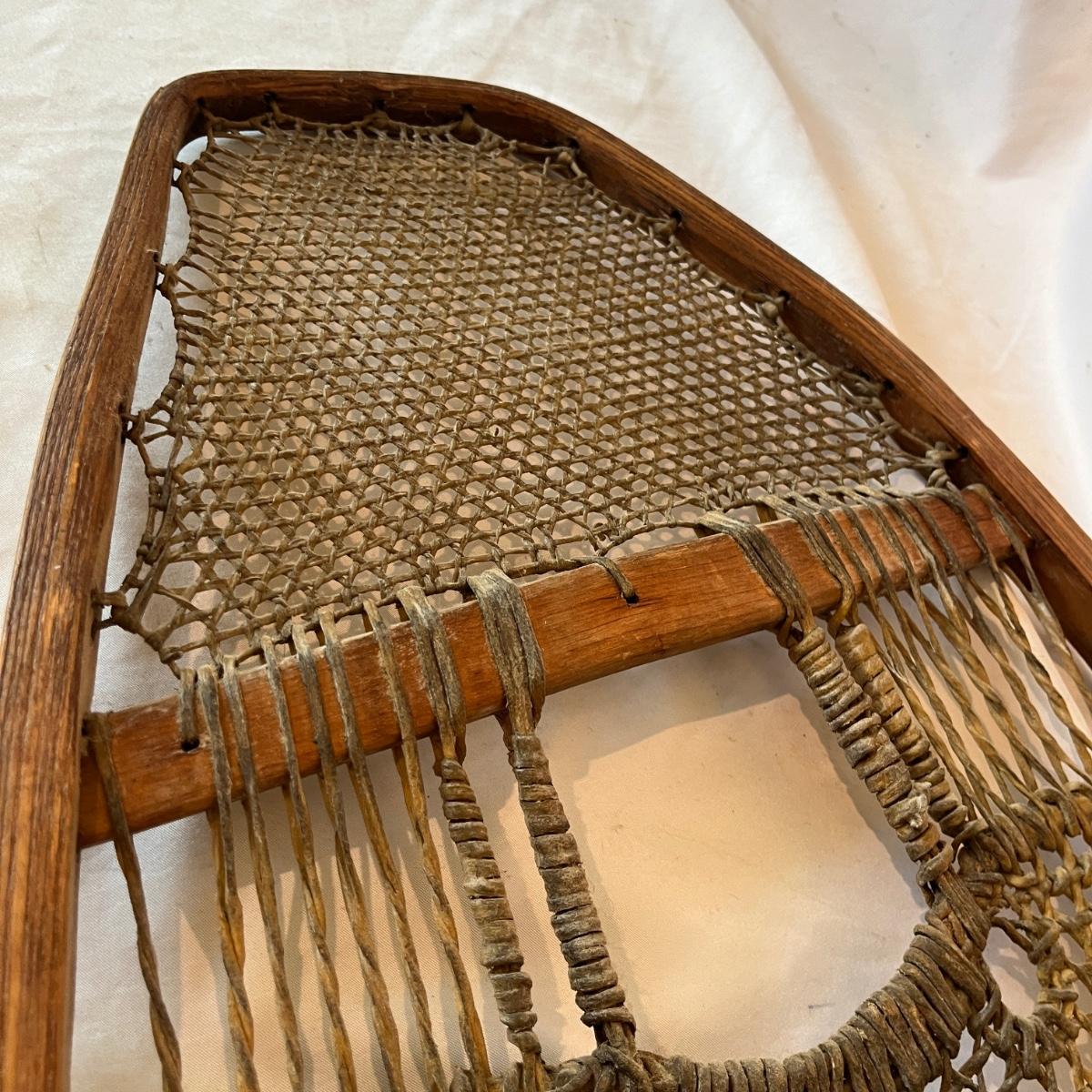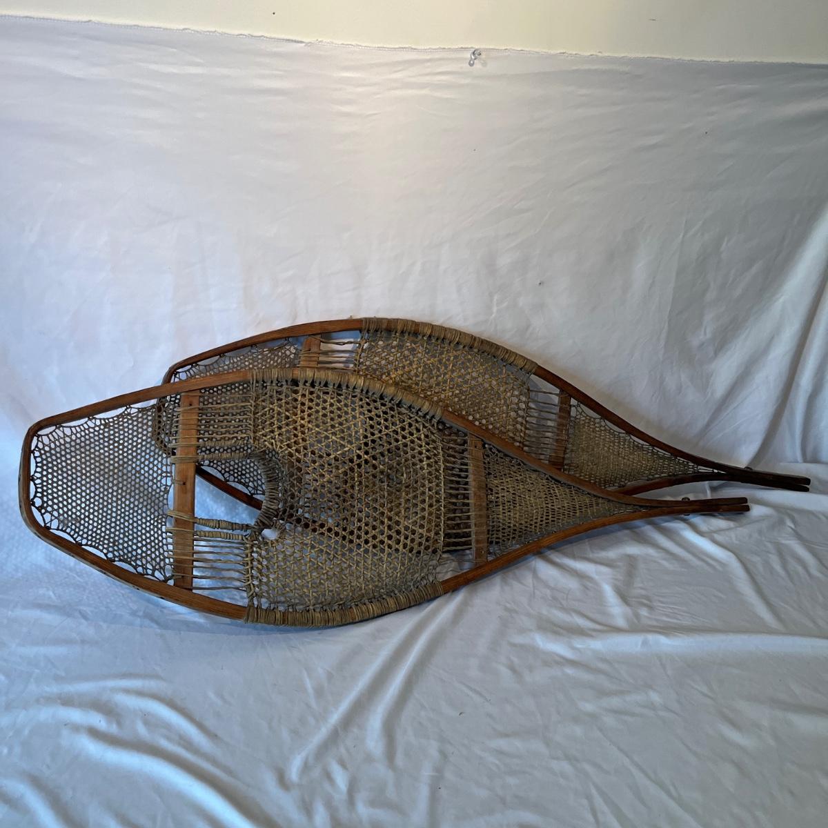 Lot includes a pair of vintage wooden snow shoes that measure 13” x .75” x 42”long.
