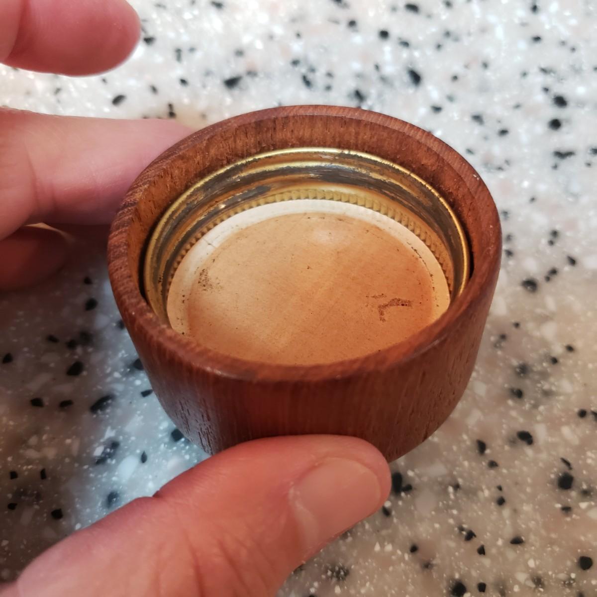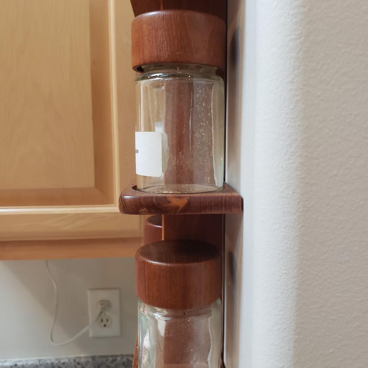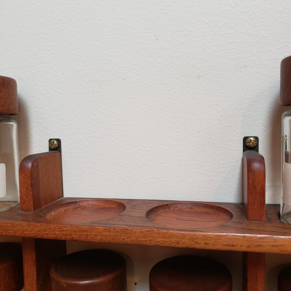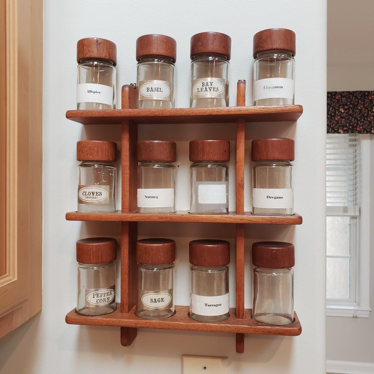 This lot features a vintage wooden spice rack that hangs on the wall with two screws. There are 12 glass jars with wooden lids. The rack measures 13" x 3" x 17"H. Some jars have a variety of stickers and one has no sticker. Winning bidder will be responsible for removing from the wall. Please see photos for details.