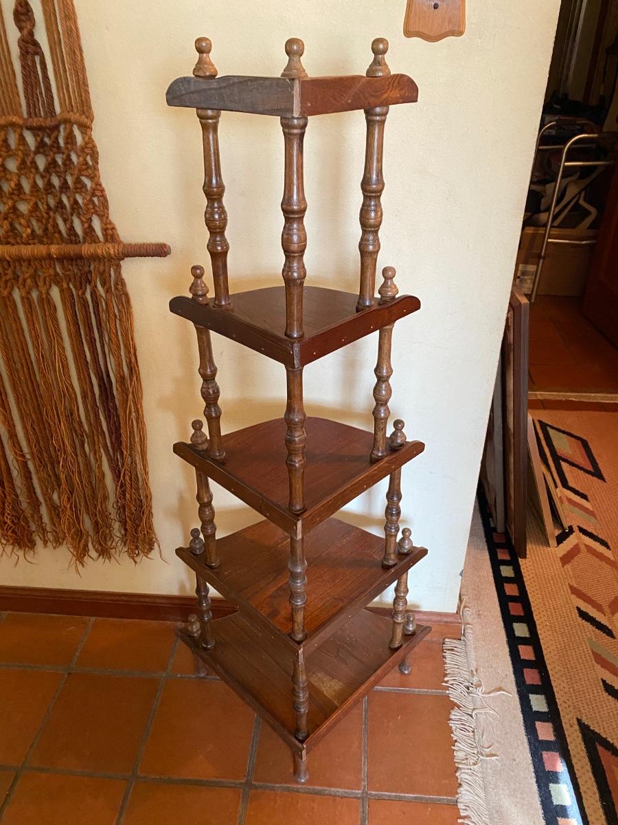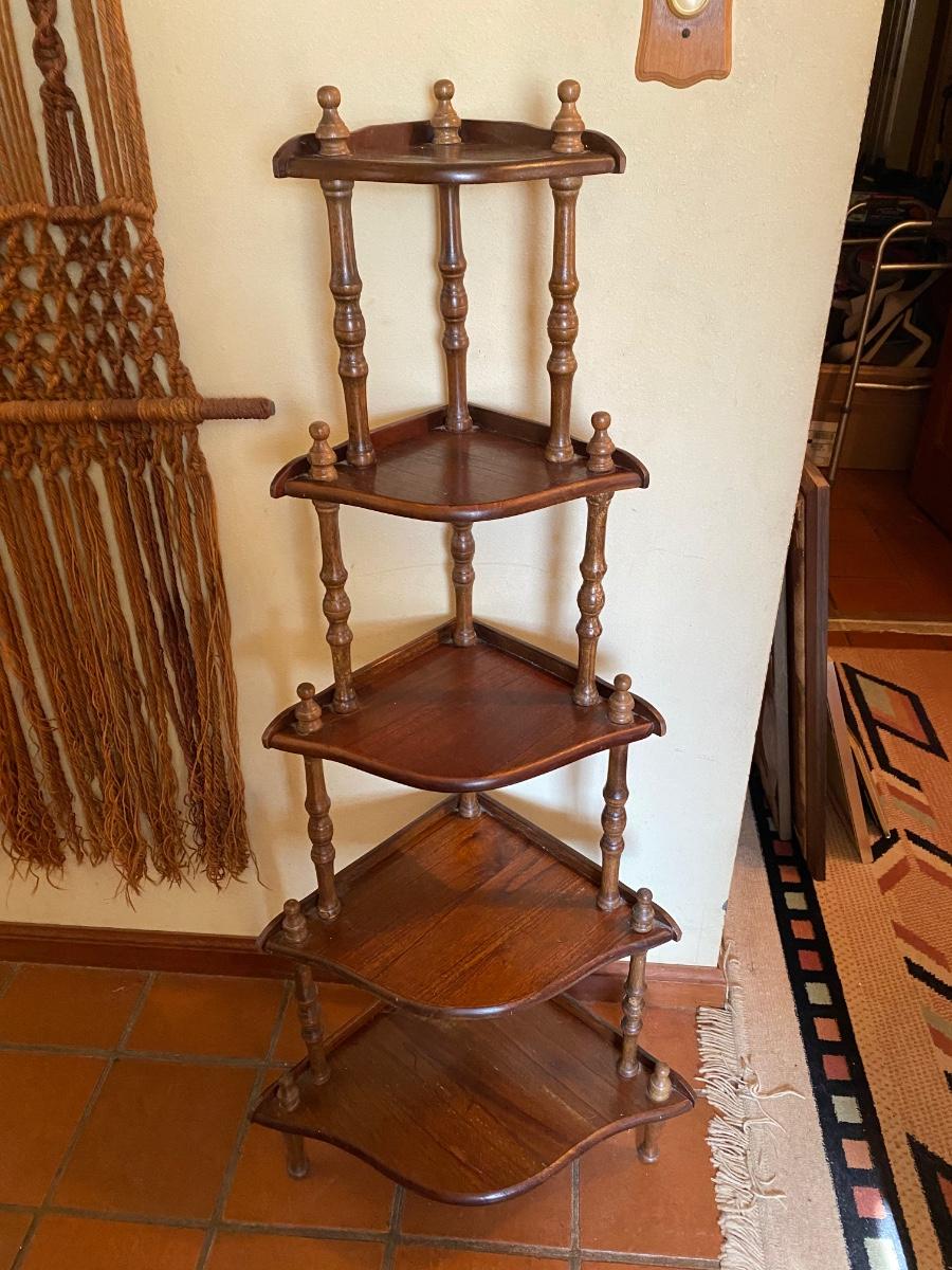 Vintage wooden spindle corner shelf, approx 49 x 14. Good condition with some scratches