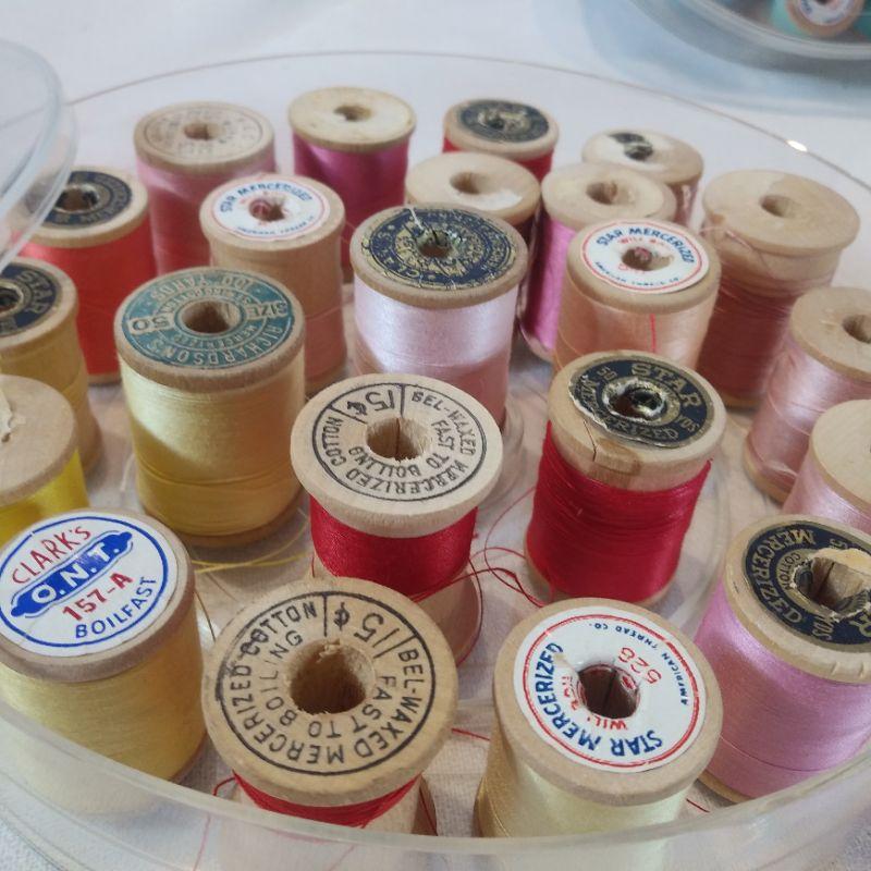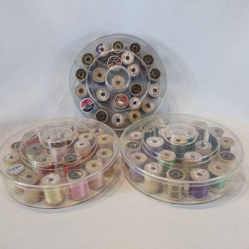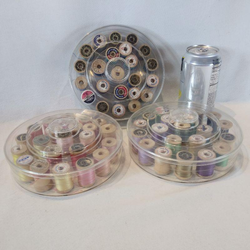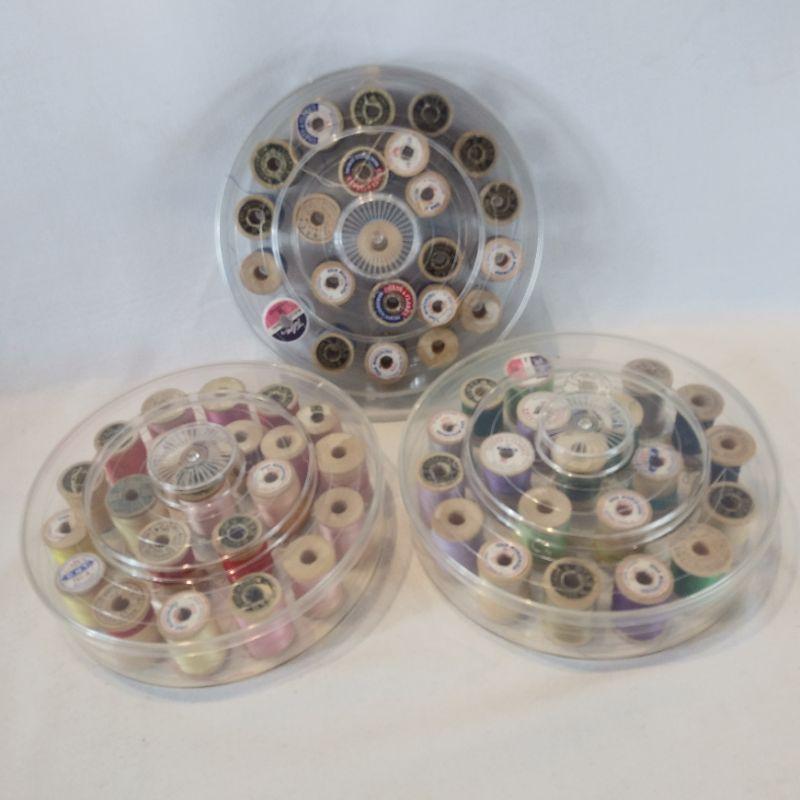 Three very nice older plastic spool holders filled with wooden spools of thread. Each container hold 21 spools and they are full. Each measures 7-inches in diameter. All are in very good shape, no cracks.