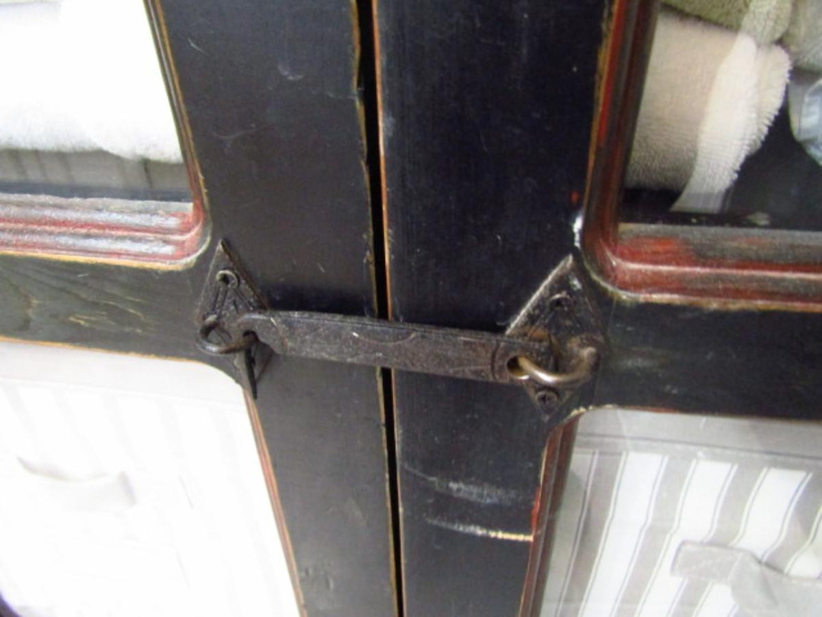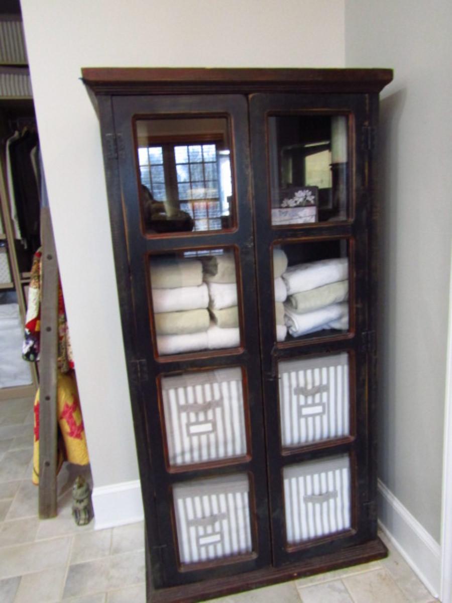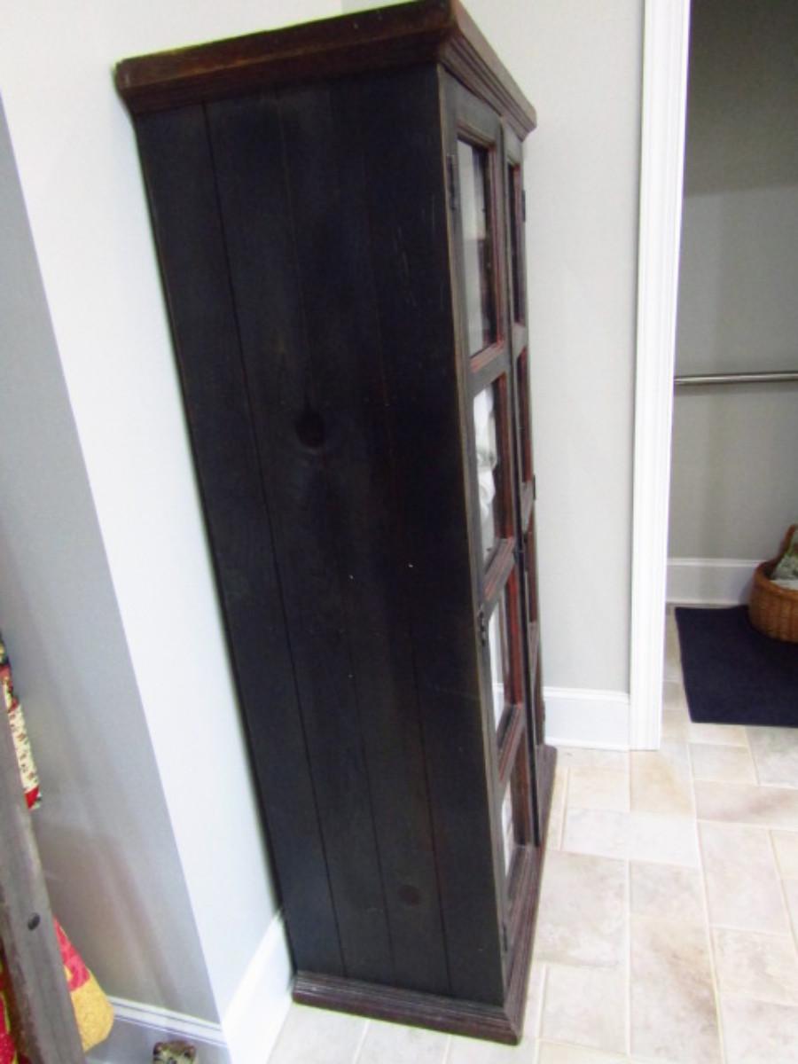 Vintage Wooden Storage Cabinet with Glass Panel Doors- Contents Not Included. Measures approx 33" across, 17" deep, 67" tall. For large furniture items we partner with the following moving companies. Please feel free to call for rates. Carolina PacknGo 828-489-9773 or Beaty Bros. 828-201-2982