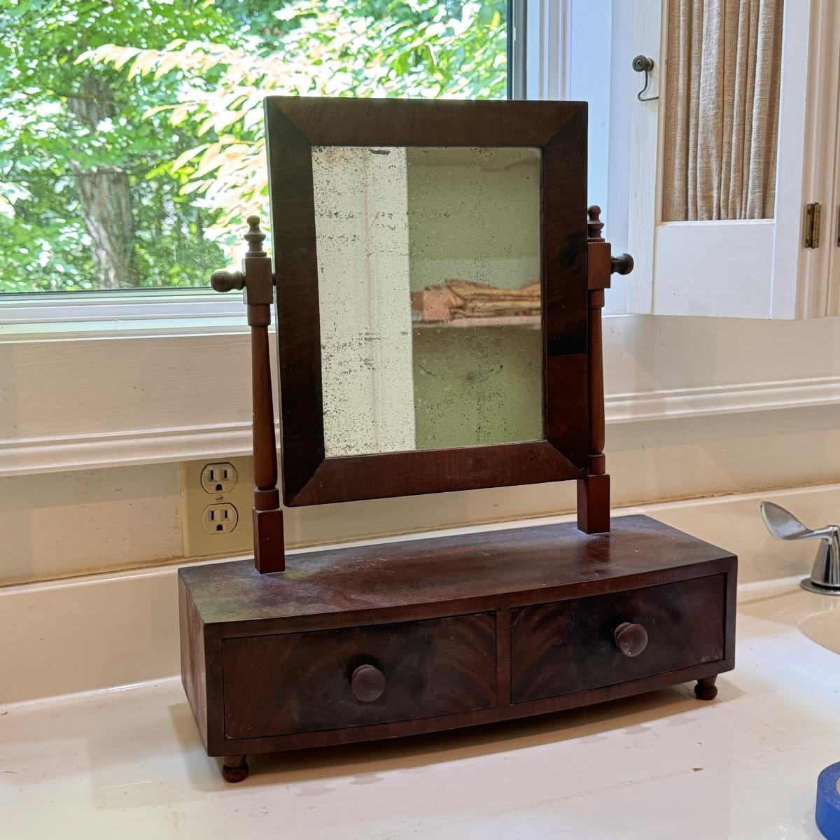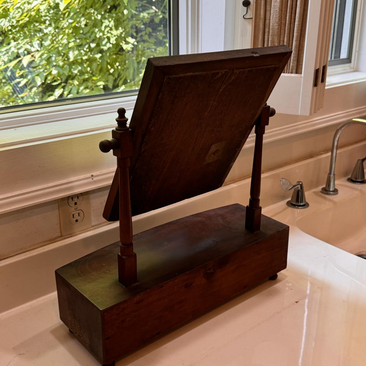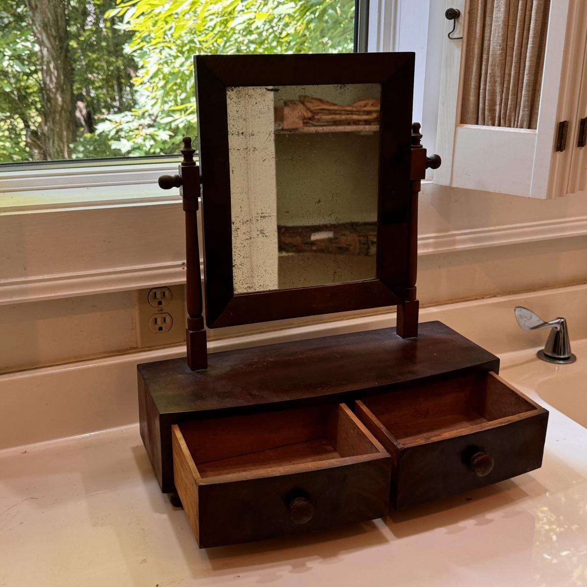This lot includes one vintage wooden vanity that can be placed on any surface. The mirror has a few foggy spots on it - see pictures included. The vanity measures 18” x 6” x 21”H. Shipping available.