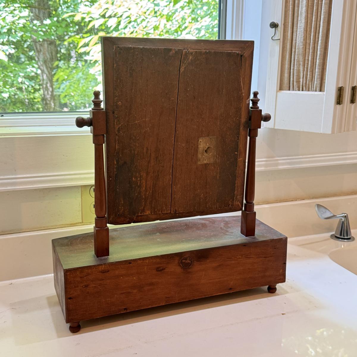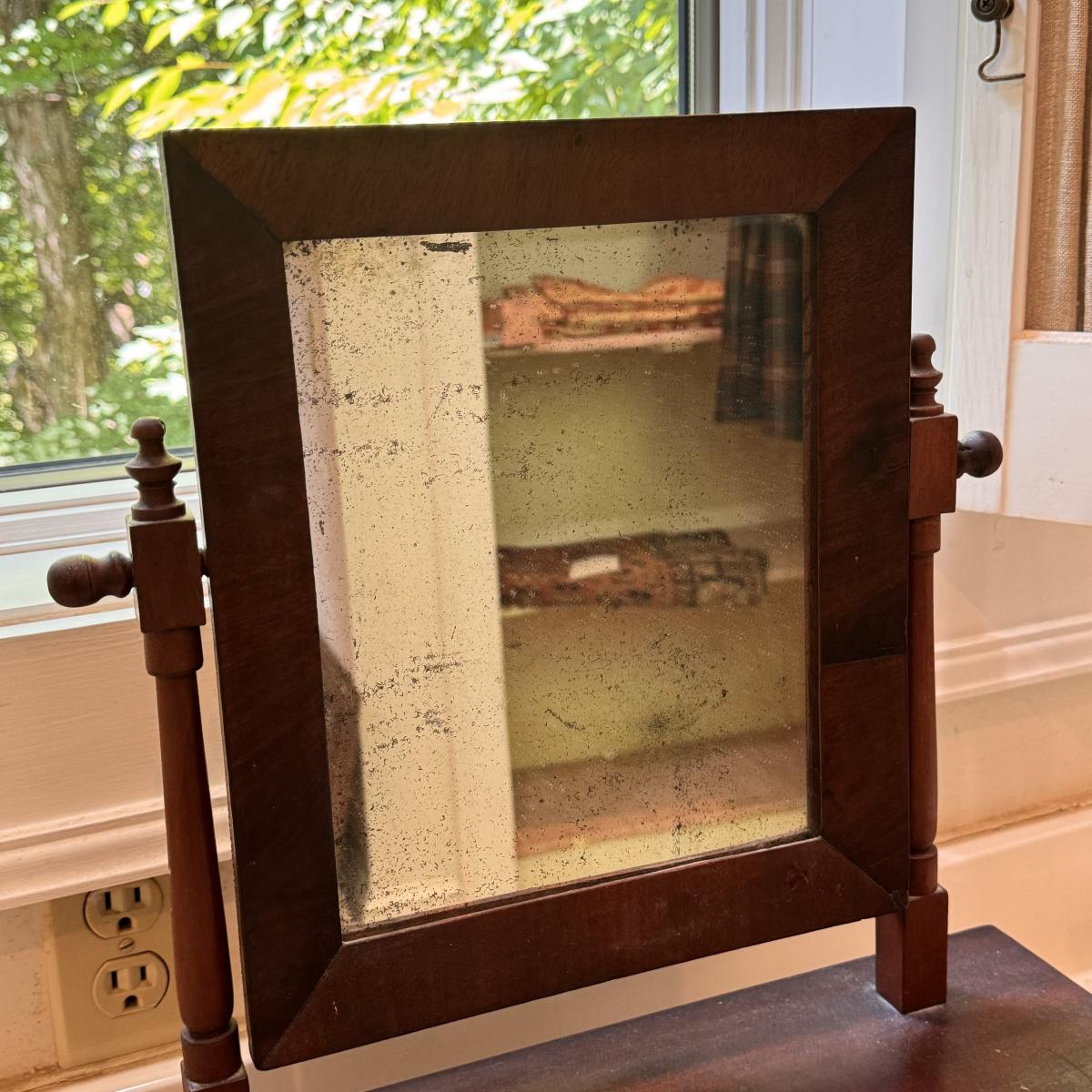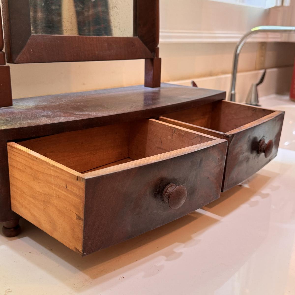 This lot includes one vintage wooden vanity that can be placed on any surface. The mirror has a few foggy spots on it - see pictures included. The vanity measures 18” x 6” x 21”H. Shipping available.