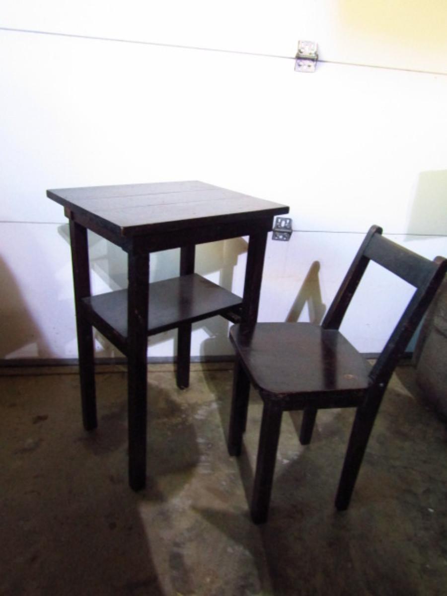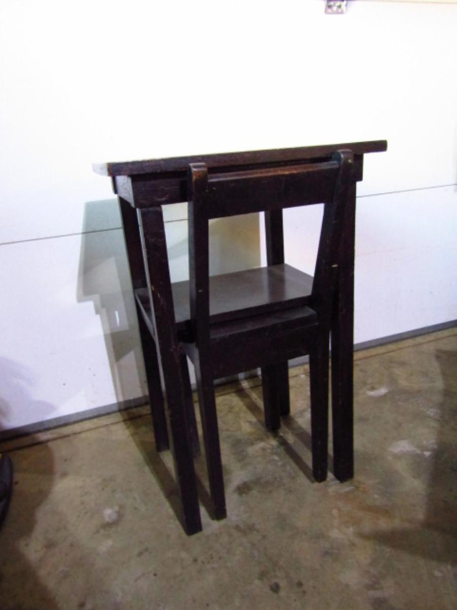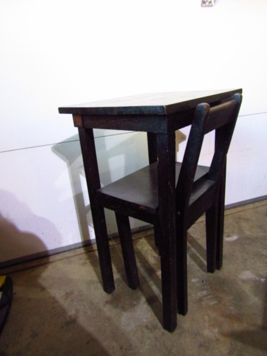 Vintage Wooden Table With Chair (G). Chair is stored under table. Legs are a loose and need to be tightened.