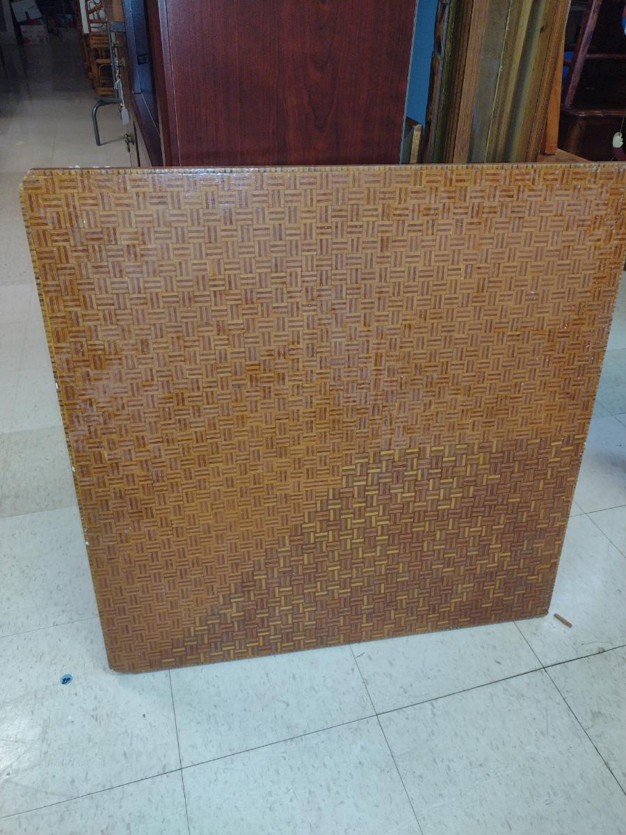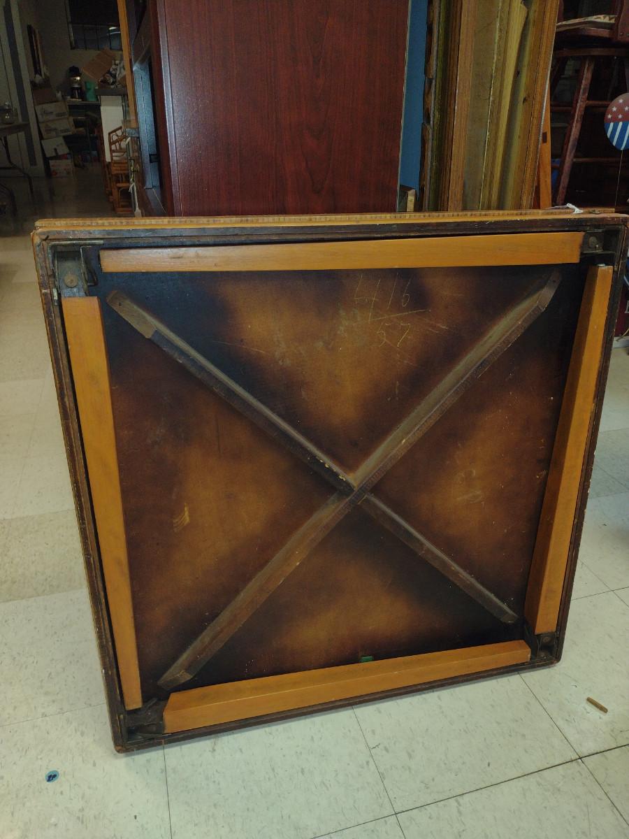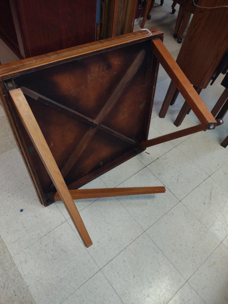 Vintage Wooden Table with Folding Legs- Approx 30" Square. Corners are damaged- please see all pictures for condition.