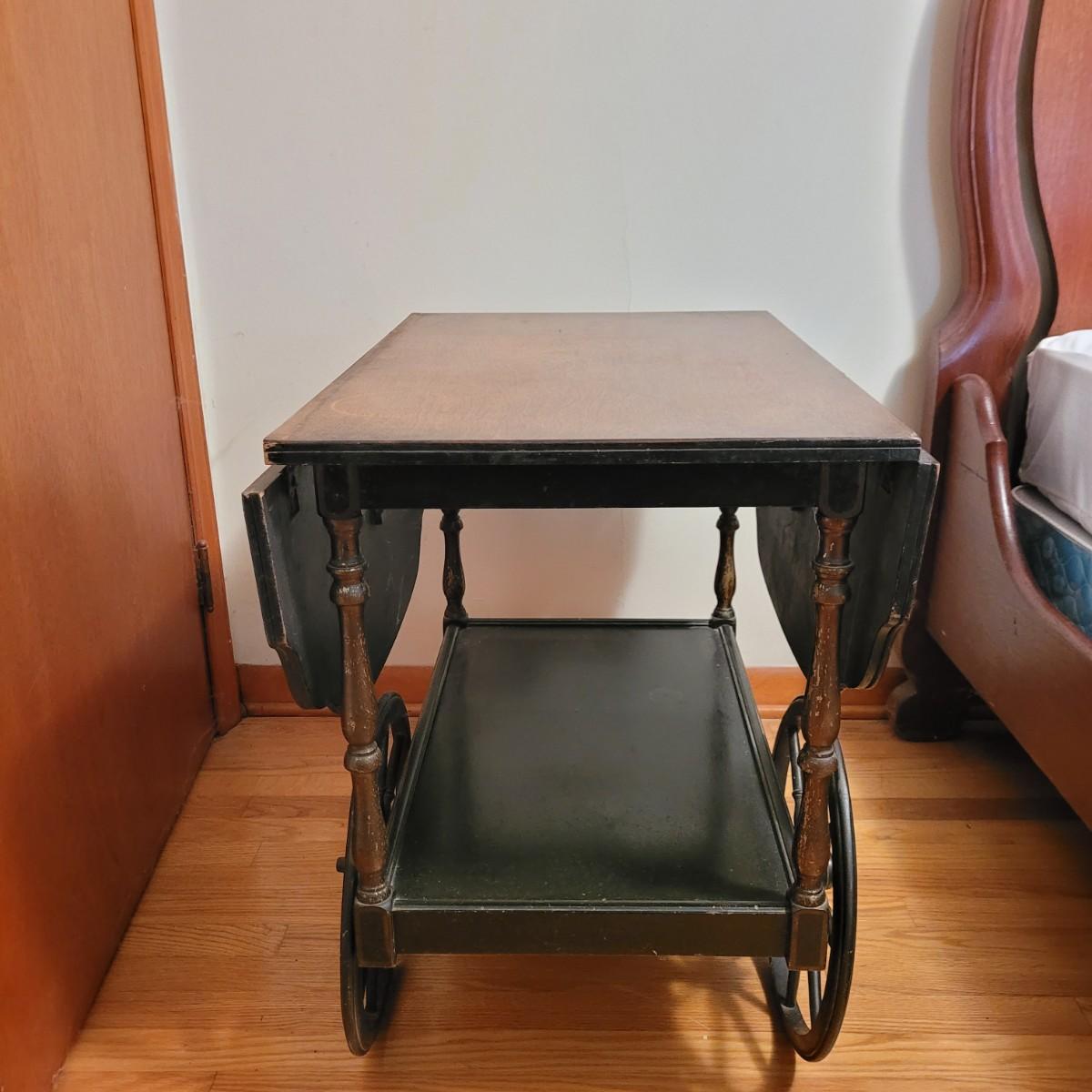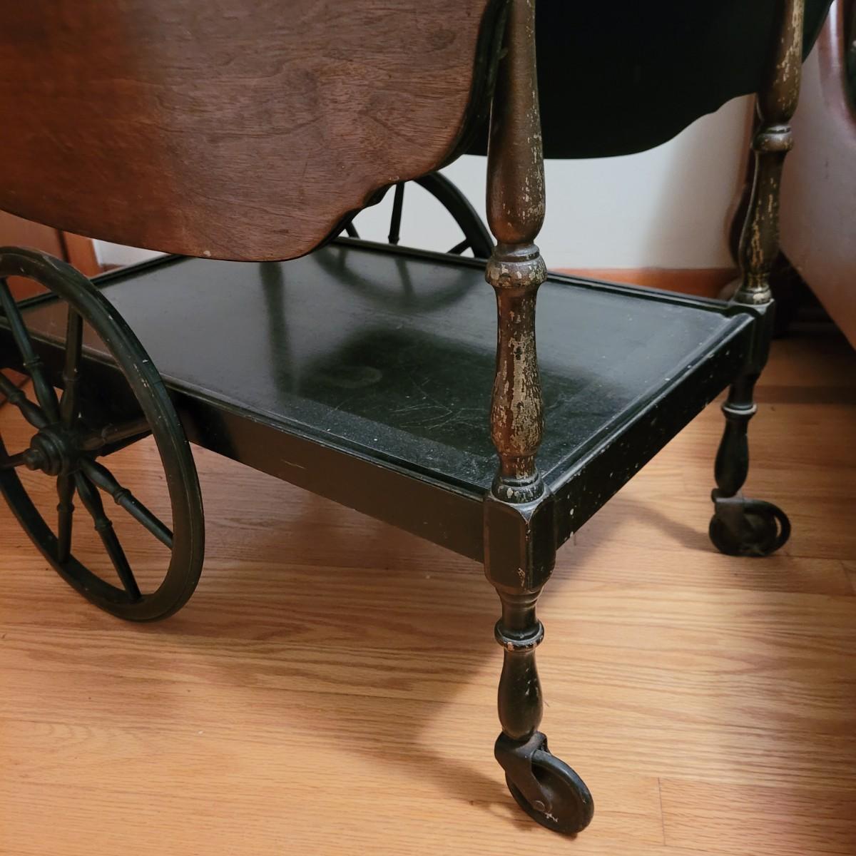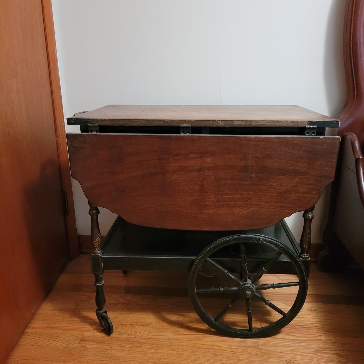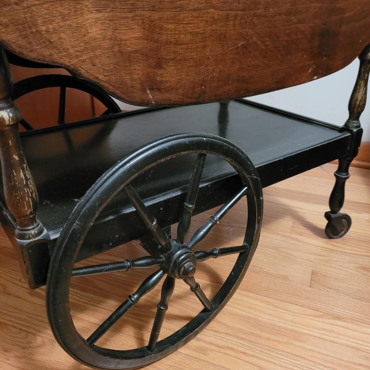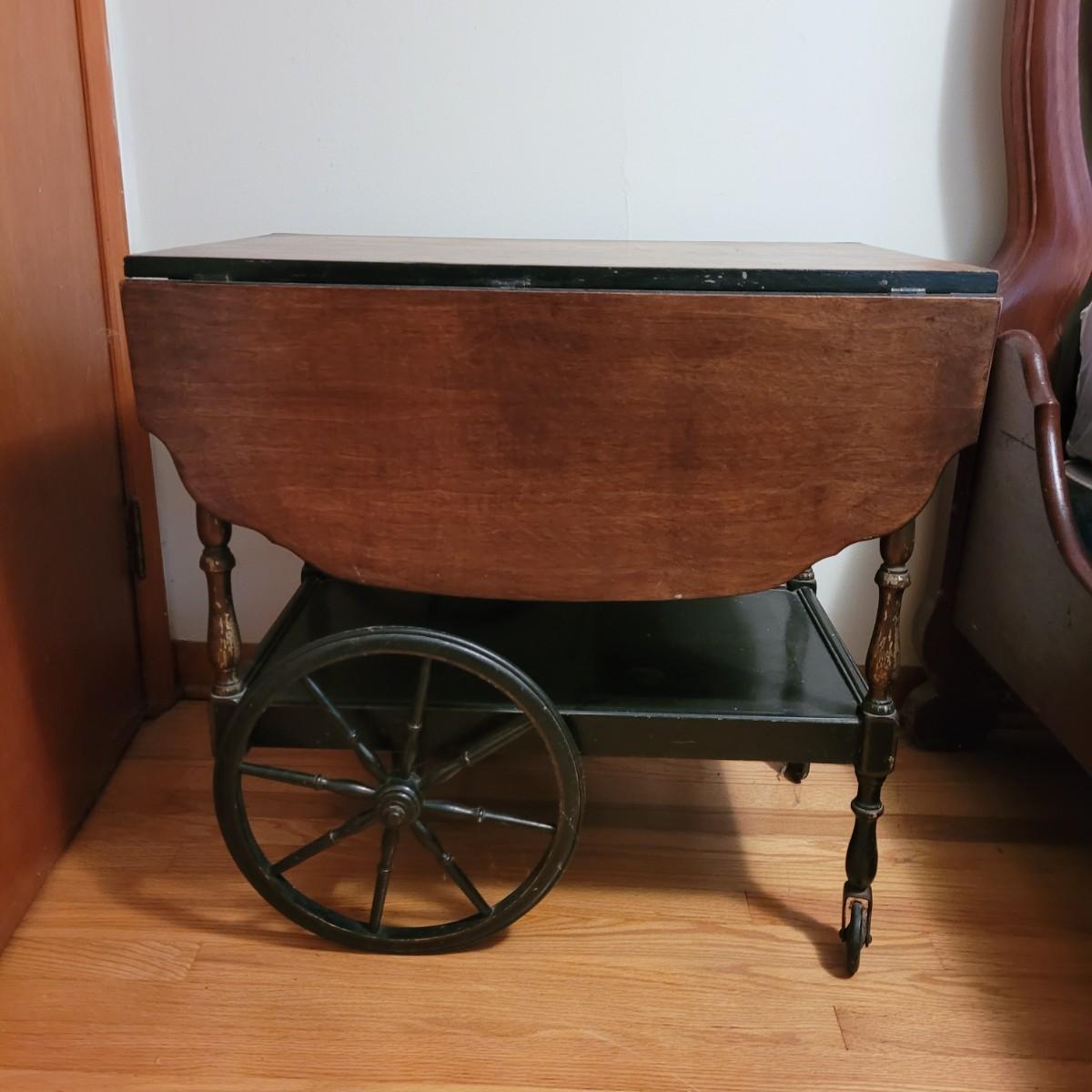 Wooden tea cart in fair condition. Some water stains and scratches, and one leaf has loose and detached hinges, appears to be easily reparable (see photos). Wheels do not roll easily. Measures approximately 28"L x20"W x27"H (41"W with open leaves). Local pickup only.