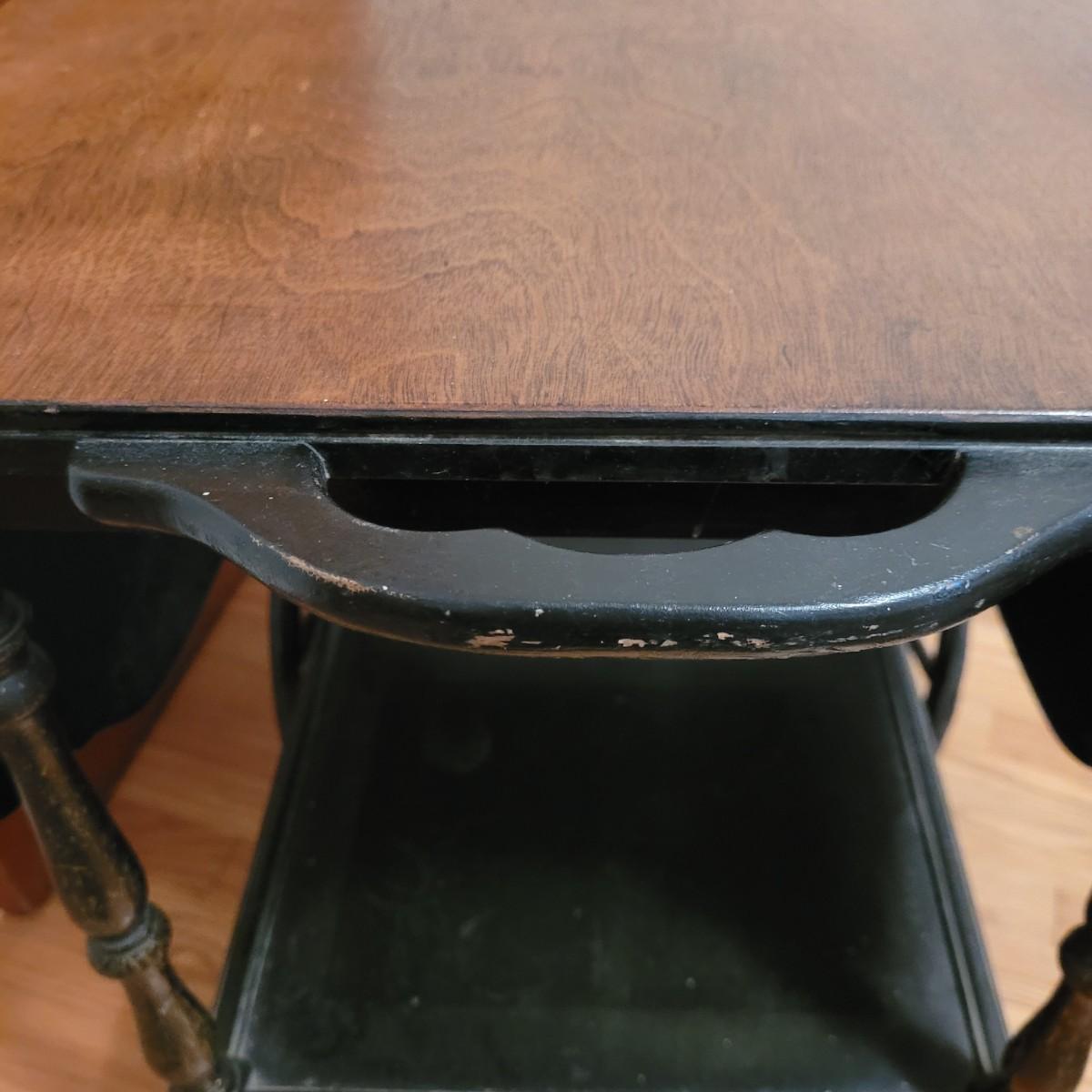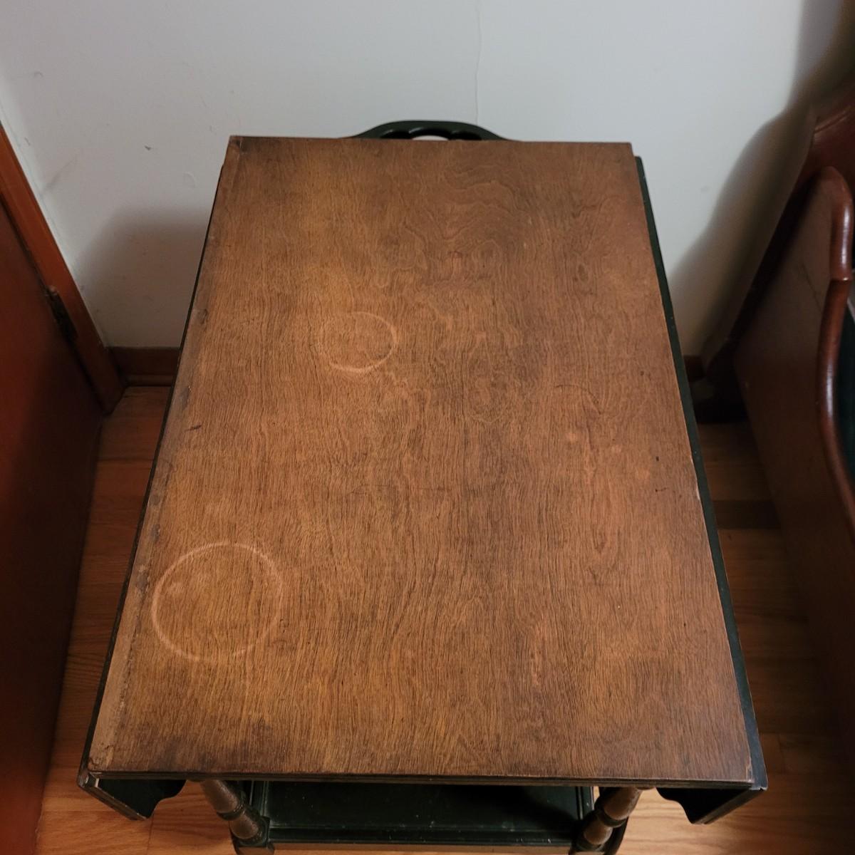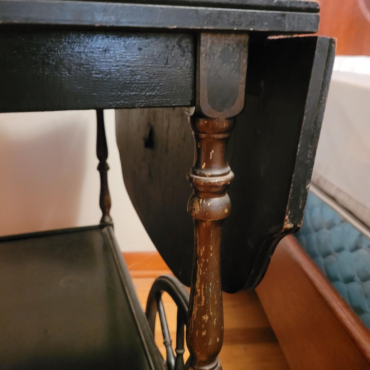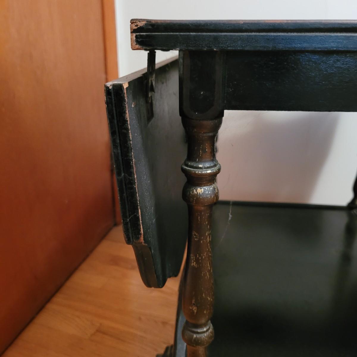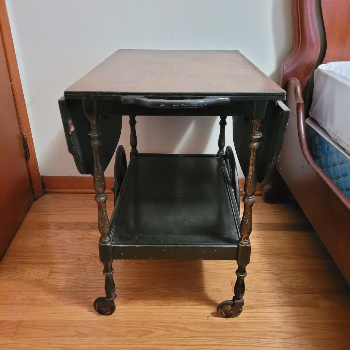 Wooden tea cart in fair condition. Some water stains and scratches, and one leaf has loose and detached hinges, appears to be easily reparable (see photos). Wheels do not roll easily. Measures approximately 28"L x20"W x27"H (41"W with open leaves). Local pickup only.