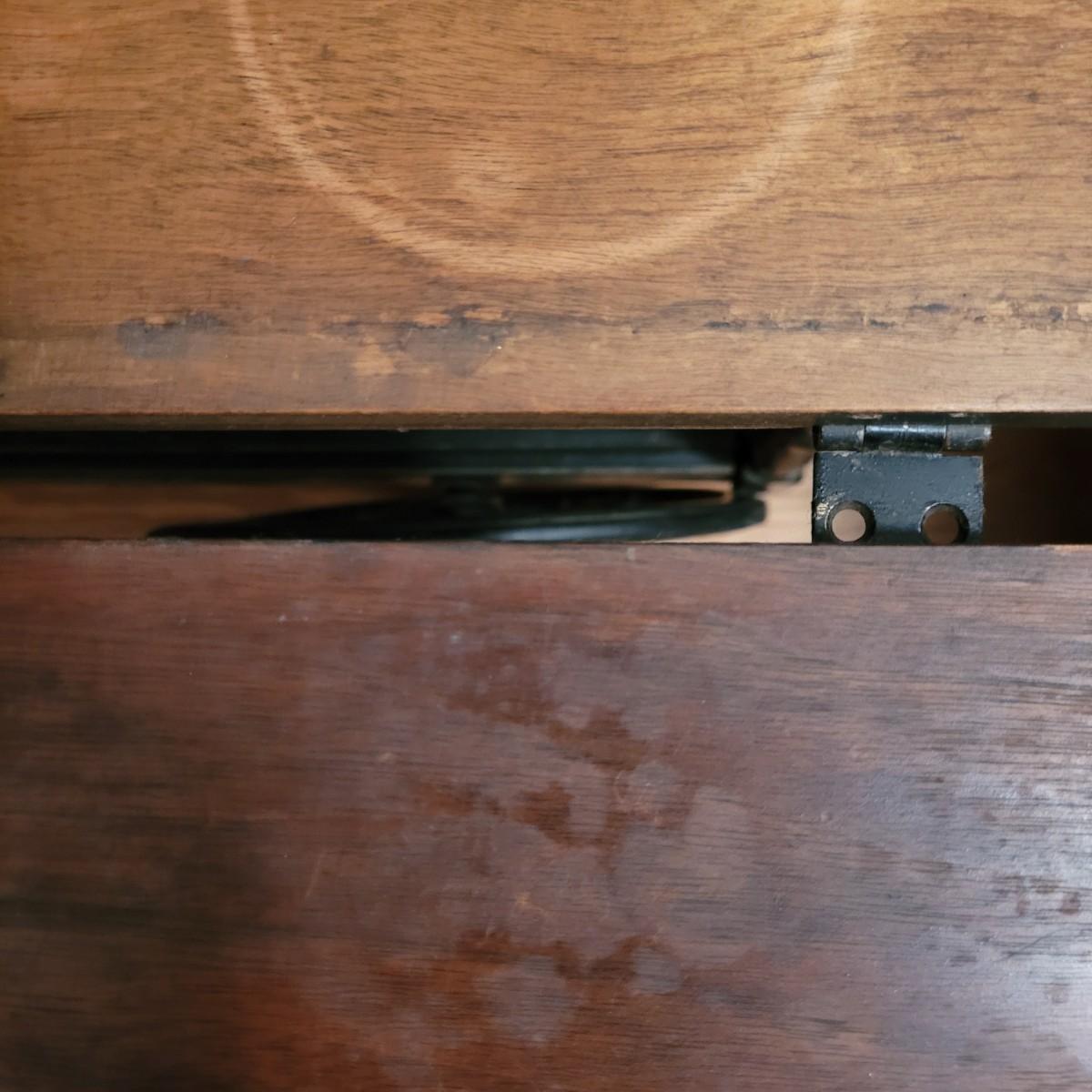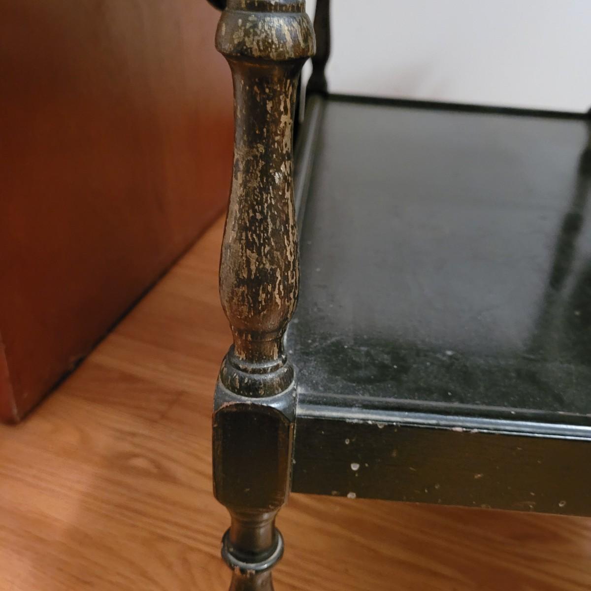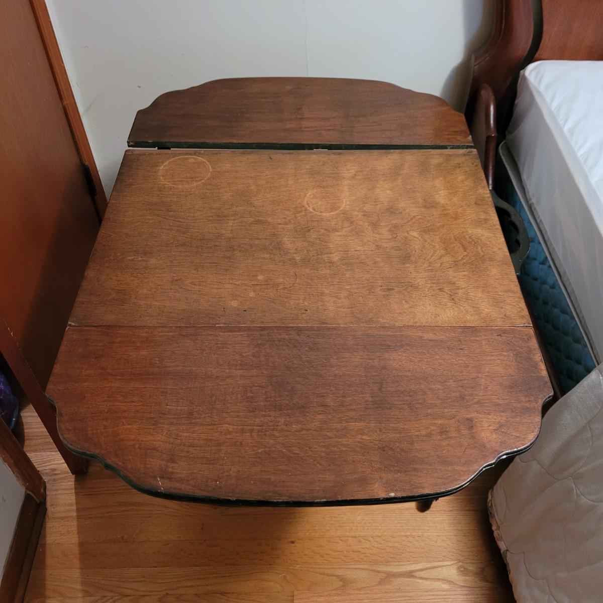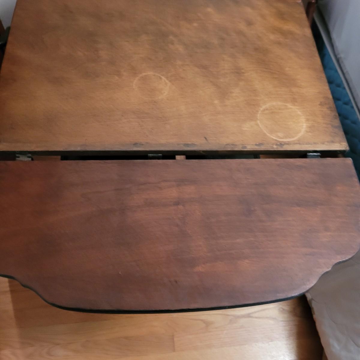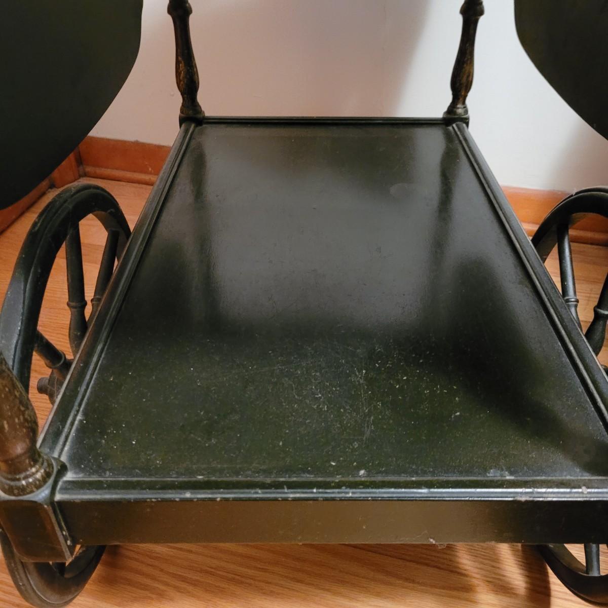 Wooden tea cart in fair condition. Some water stains and scratches, and one leaf has loose and detached hinges, appears to be easily reparable (see photos). Wheels do not roll easily. Measures approximately 28"L x20"W x27"H (41"W with open leaves). Local pickup only.
