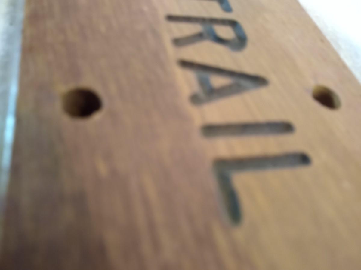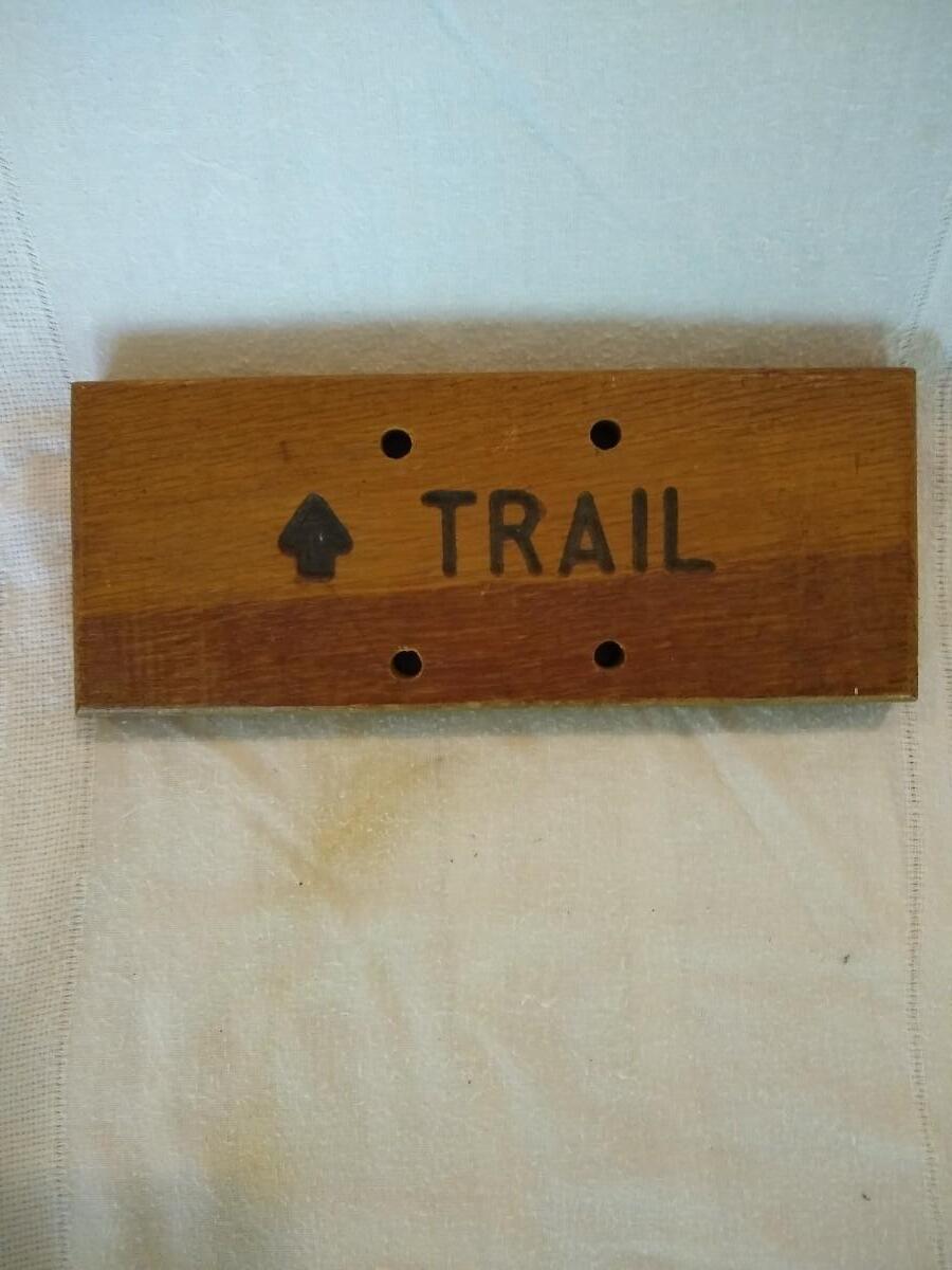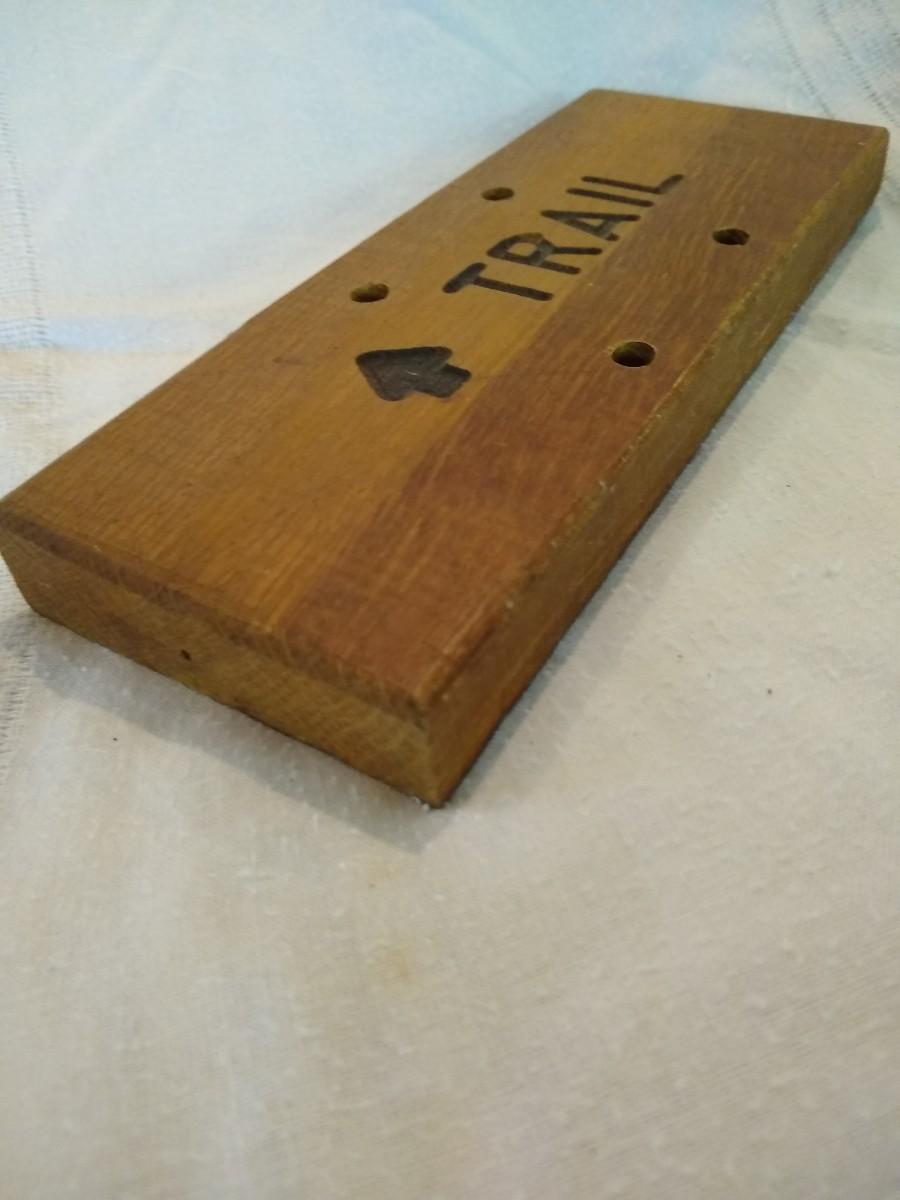 This vintage Trail marker is made in wood with indented words 9 in Long by 3 1/2 in wide.