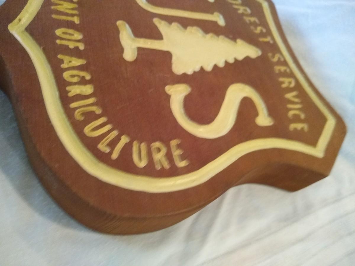 Vintage wooden Forest Service sign. 9x10" x1.5 in thick. Insized dremeled words hand-painted.