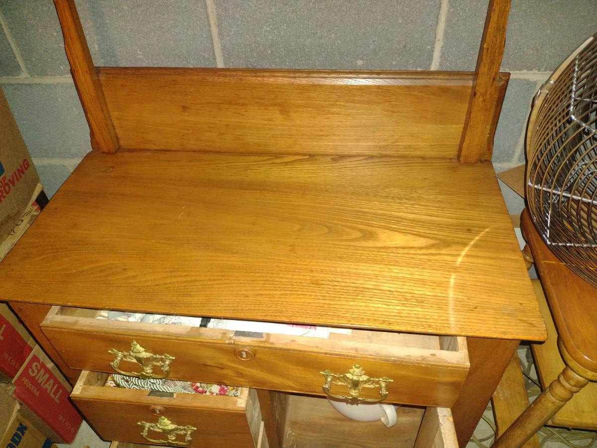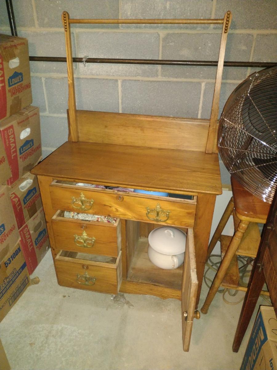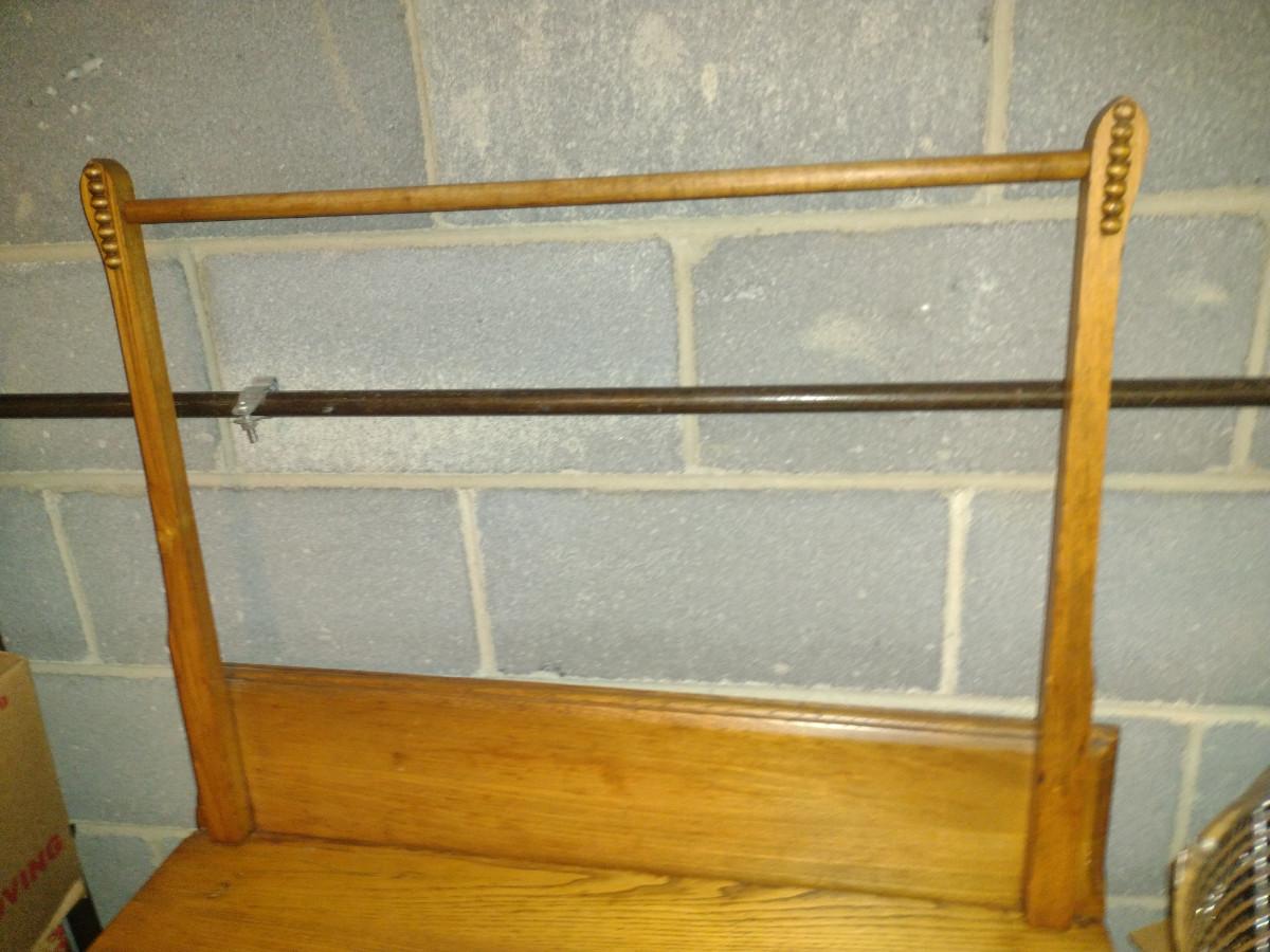Vintage Wooden Wash Stand with Towel Rack- Approx 31" Wide. No contents included. Item is located downstairs and must be brought up a flight of stairs. Please bring help for safe removal.