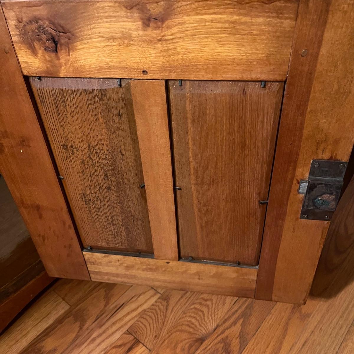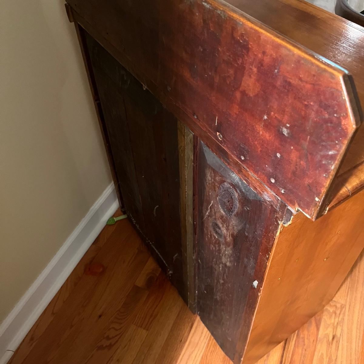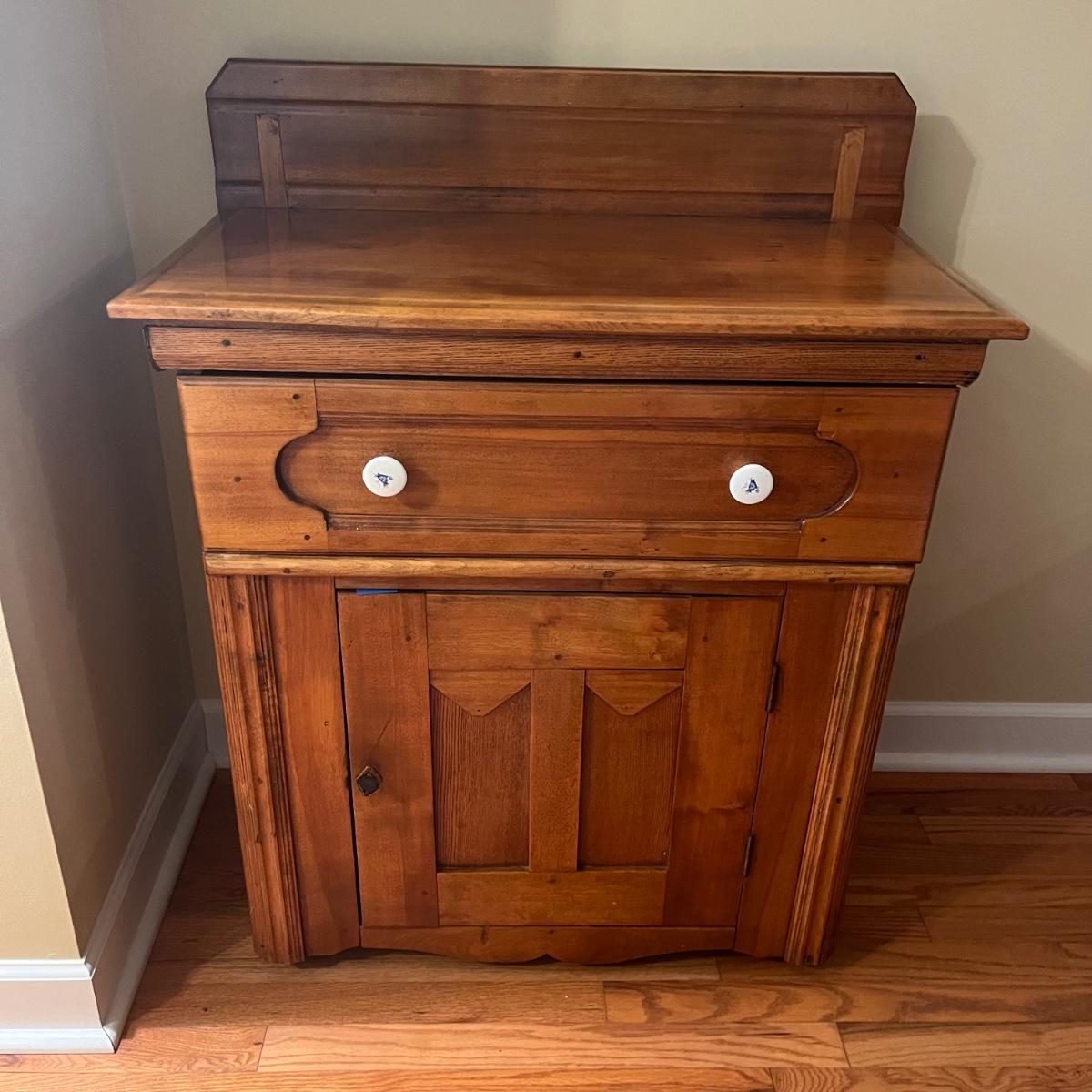 Lot includes a vintage primitive style wooden washstand with a dovetailed drawer and ceramic knobs with a floral detail. There is a locking cabinet underneath with key. Stand is on casters. Washstand measures 15” x 29” x 37”H. Local Pickup Only. Winning bidder must bring assistance to help move and load this item due to its weight and/or size.