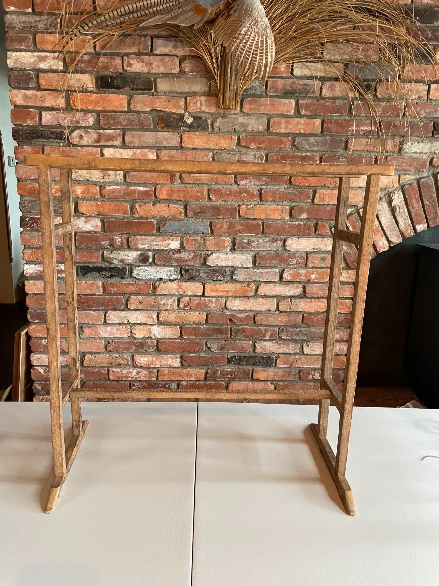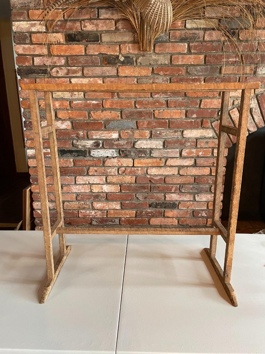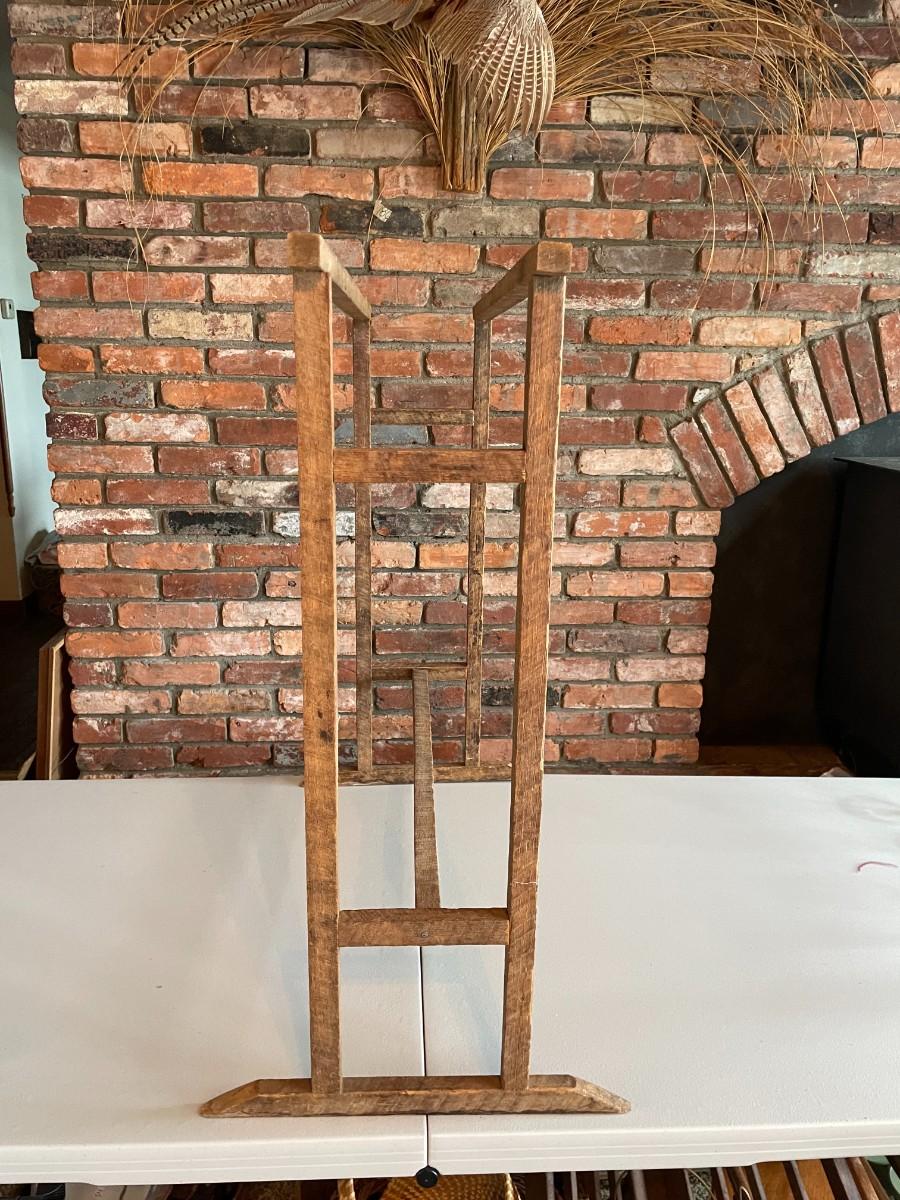 Beautiful wooden quilt rack. The rack is a little shaky due to previous use. 30L x 8 1/2w x 30H