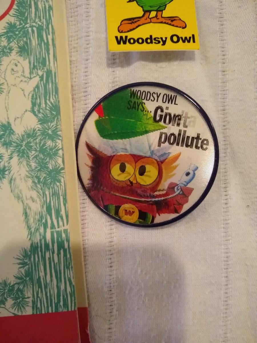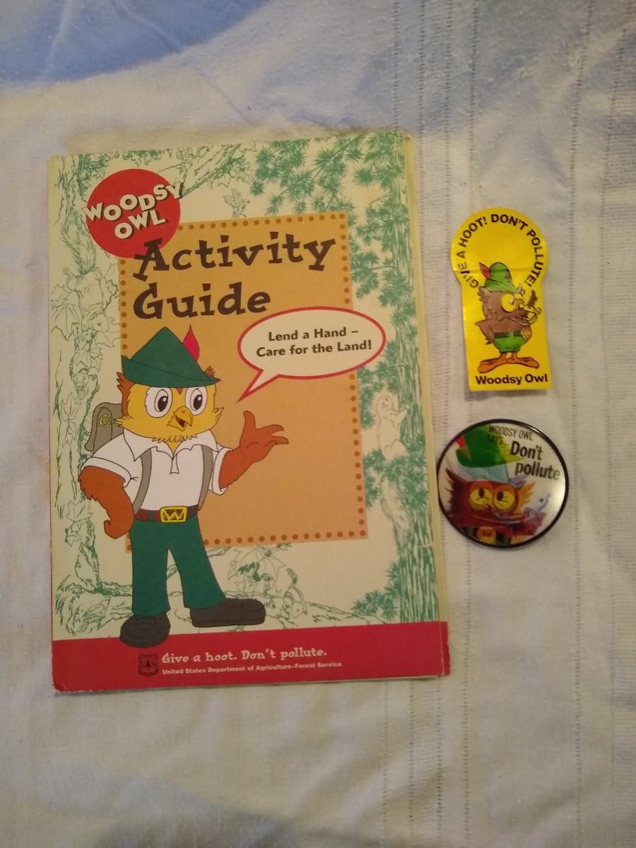 Vintage Woodsy Owl Activity Guide and Flicker Pin and Bookmark