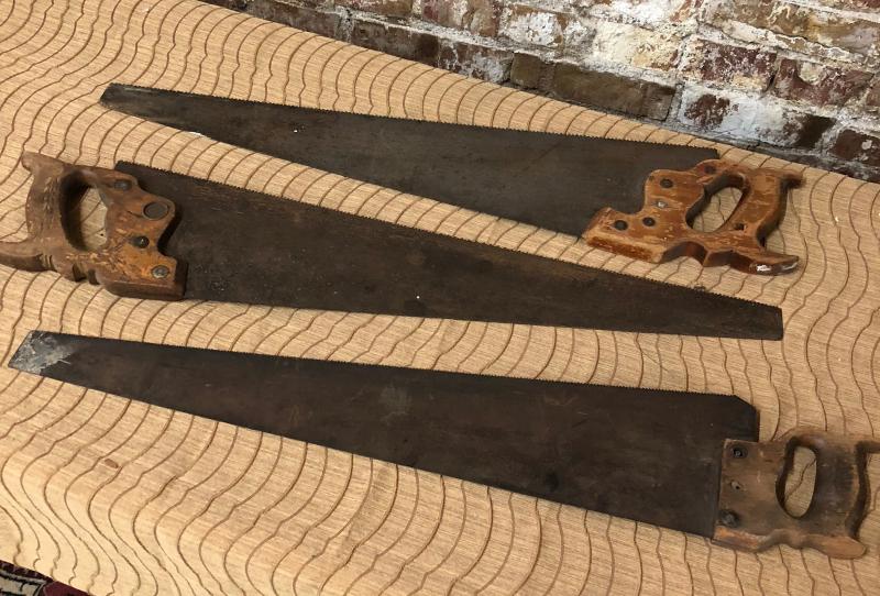 Here are three vintage saws...a lot of three carpenter's tools...Used condition...30in long...