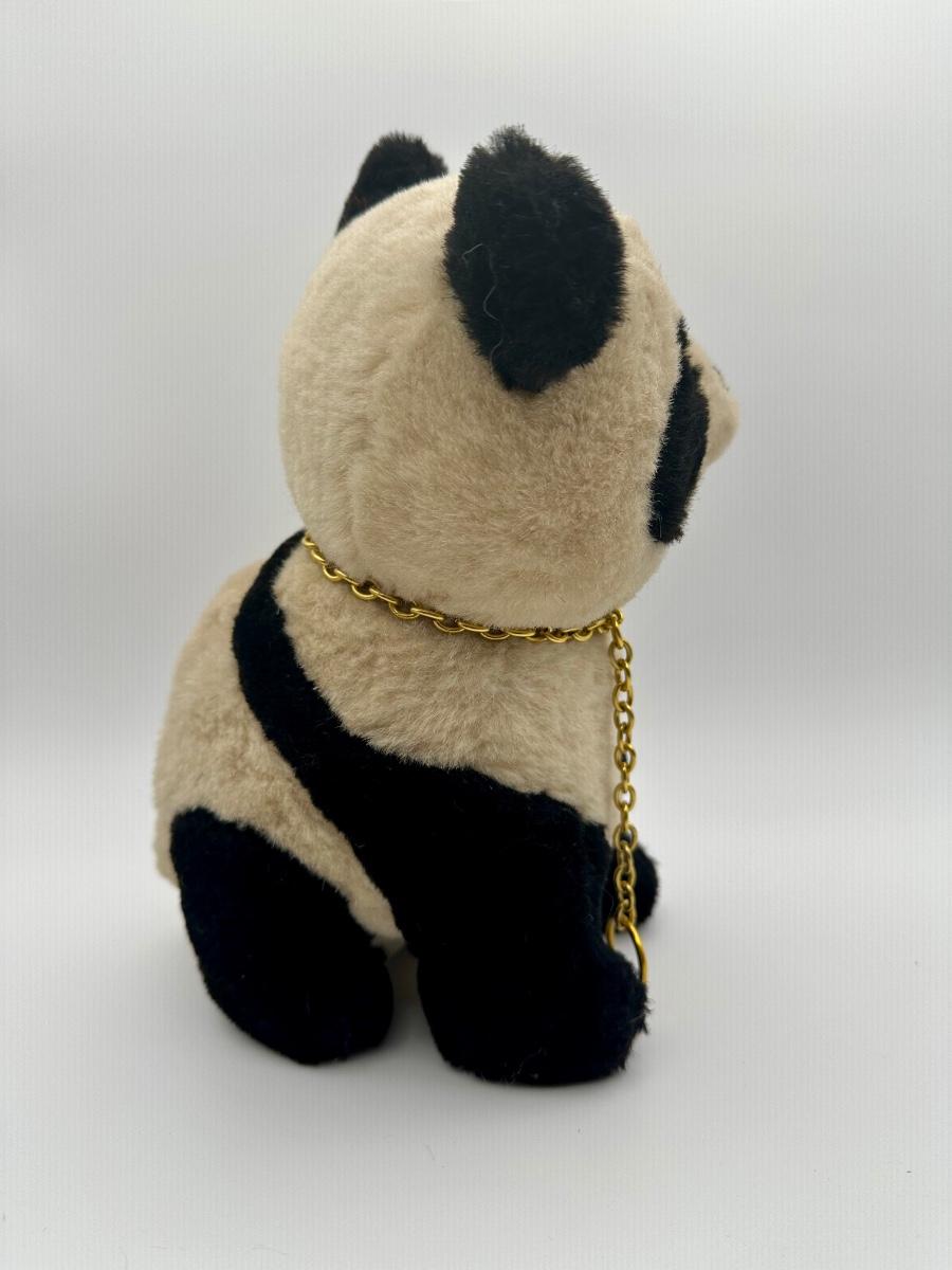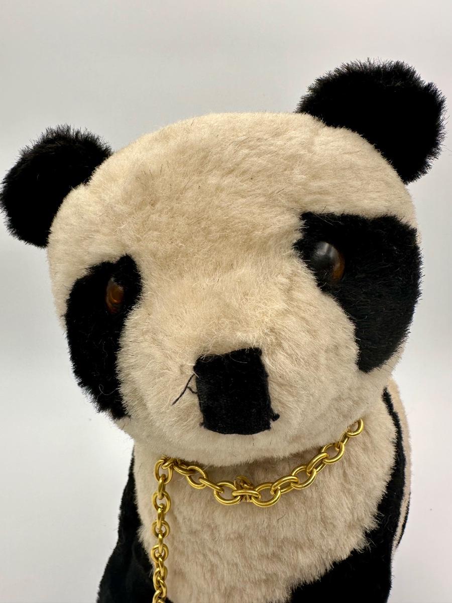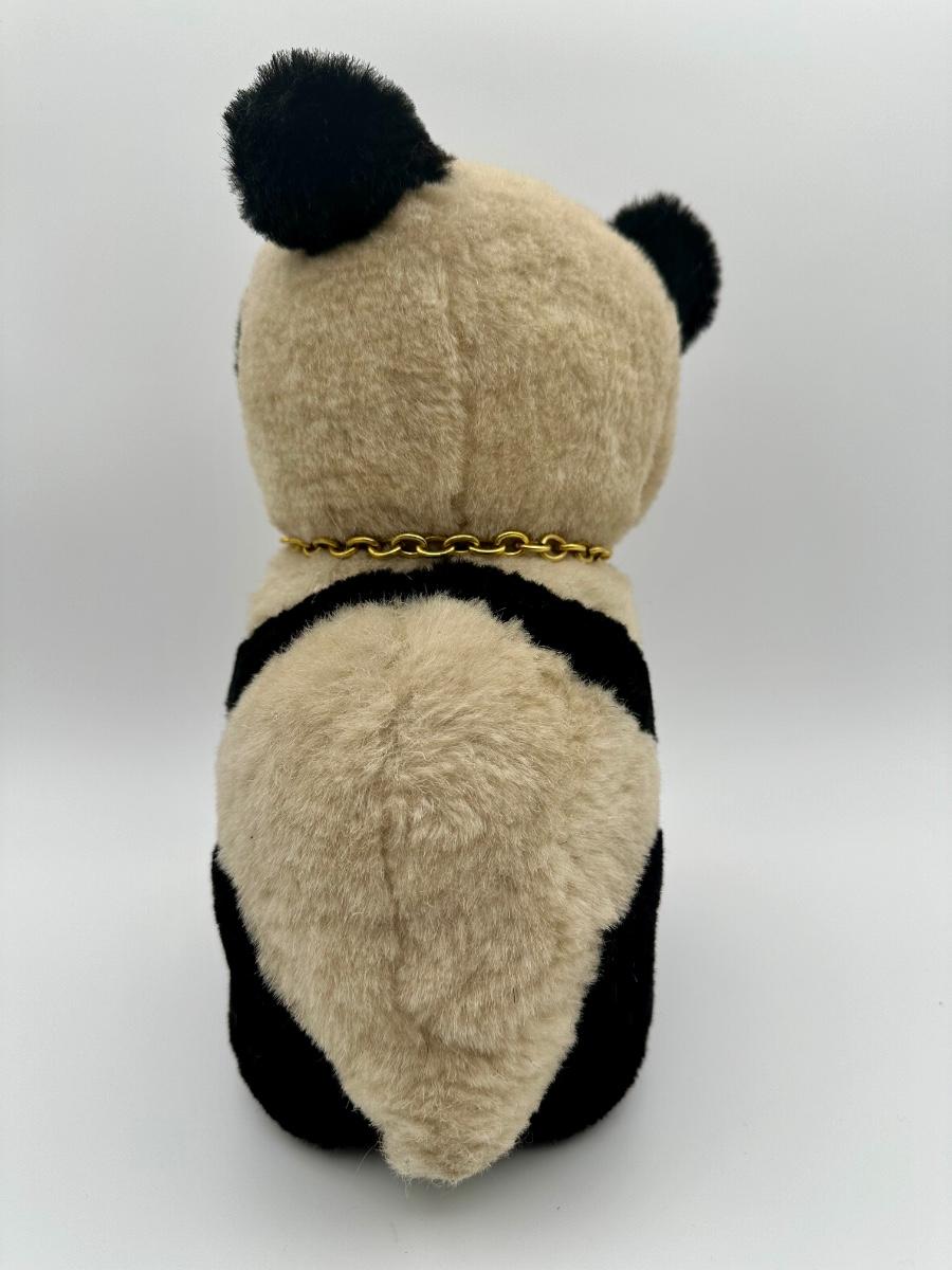 Sweet faced early wool bear, stoutly stuffed with soft “velvet” nose. Gold chain included but is missing the pendant. 10 ½” tall