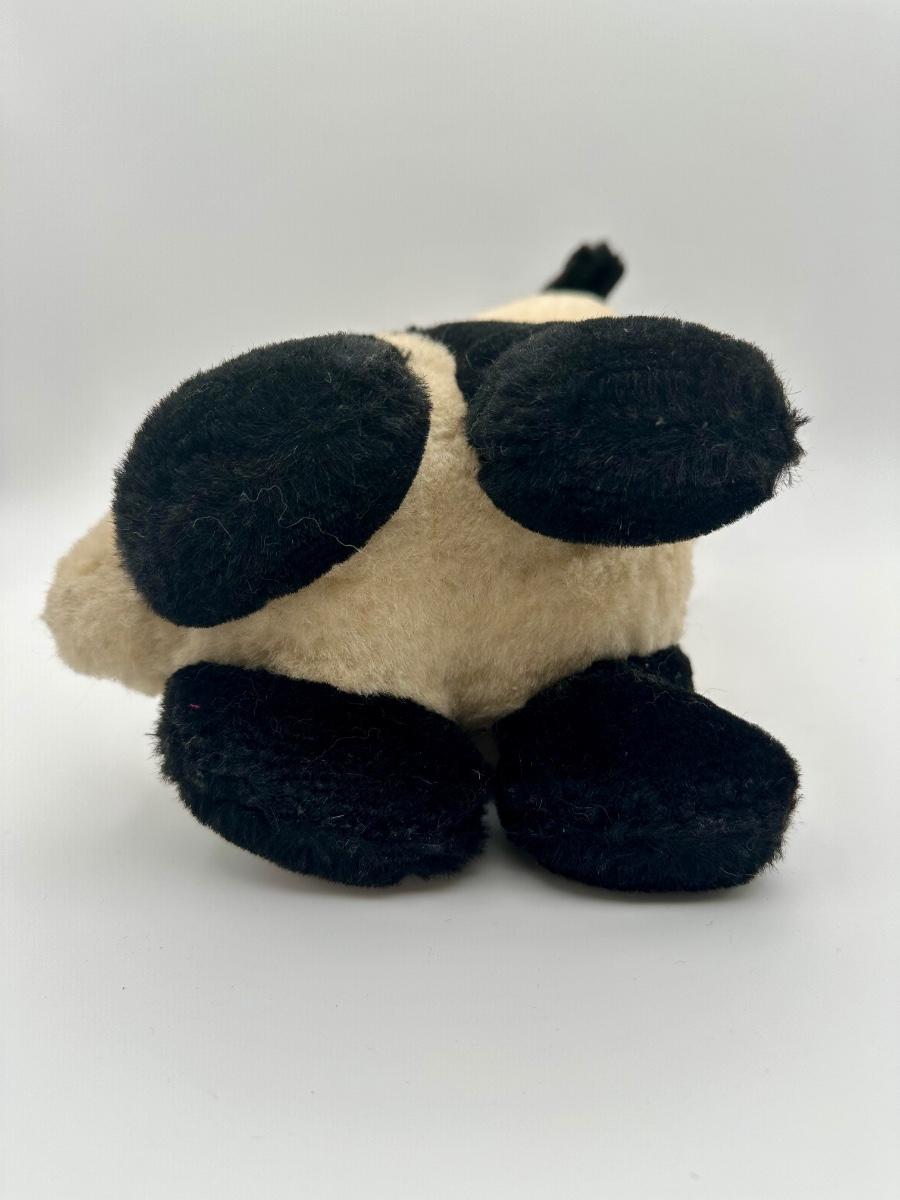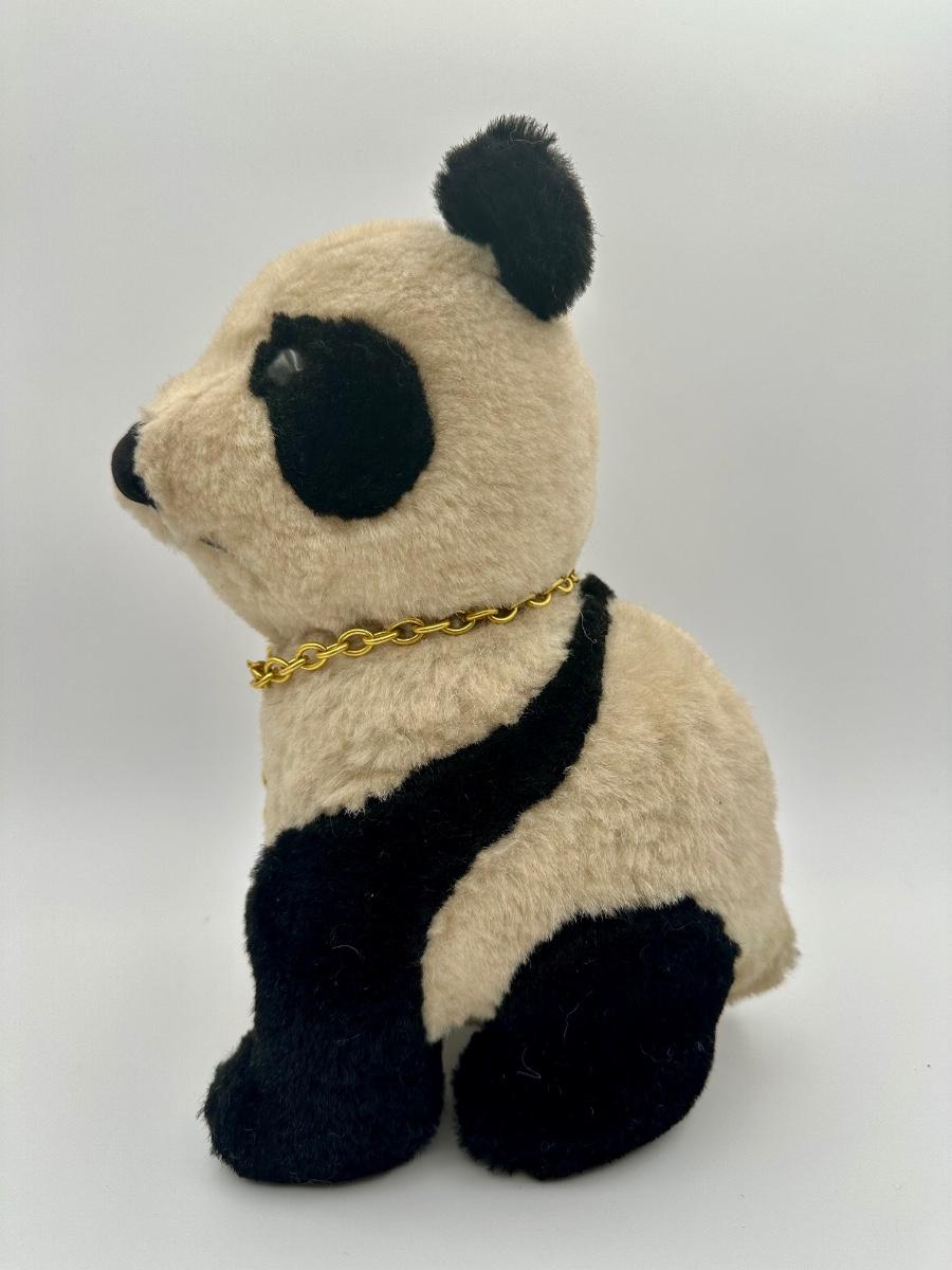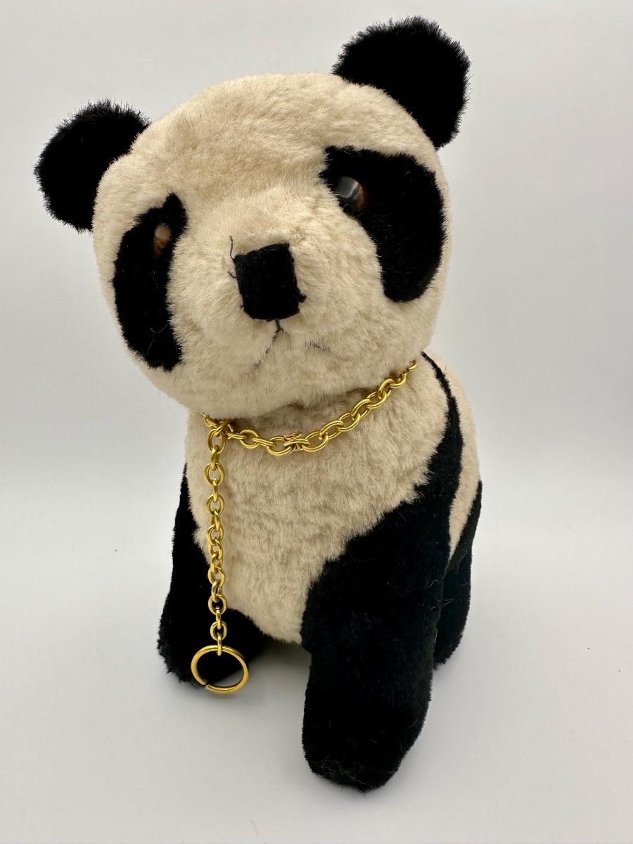 Sweet faced early wool bear, stoutly stuffed with soft “velvet” nose. Gold chain included but is missing the pendant. 10 ½” tall