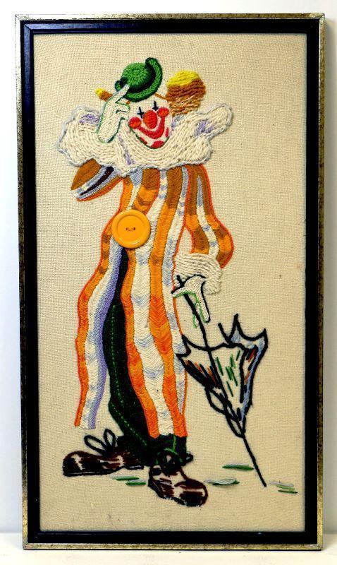 Vintage Wool Needlepoint Art Work Clown with Umbrella Folk Art - A 036