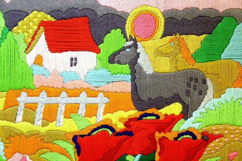 Vintage Wool Tapestry Art on Board Folk Art - Framed 23 x 28 - A-008