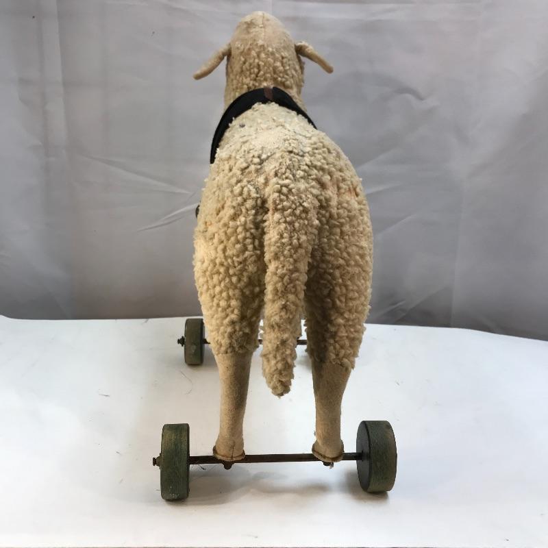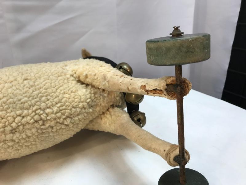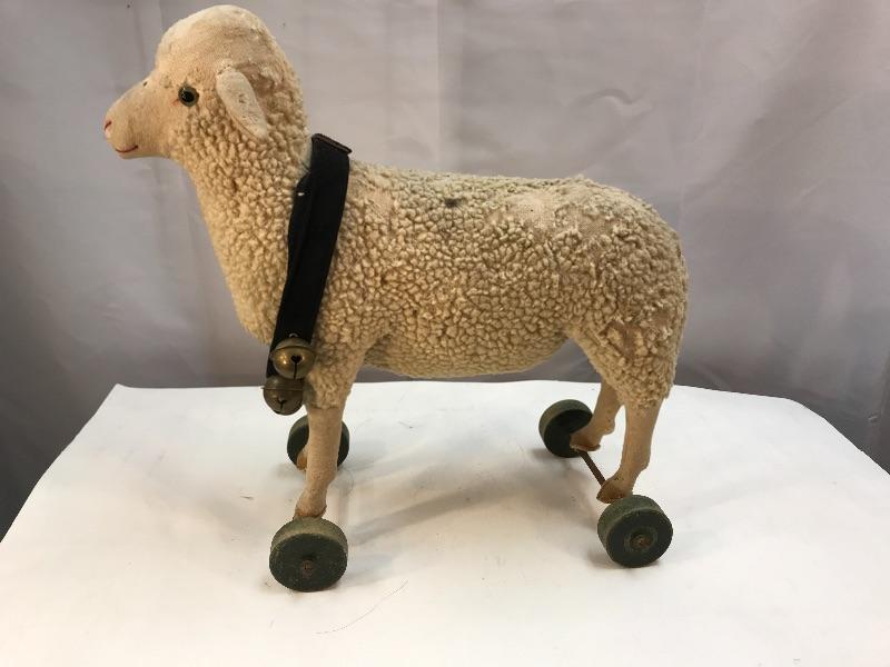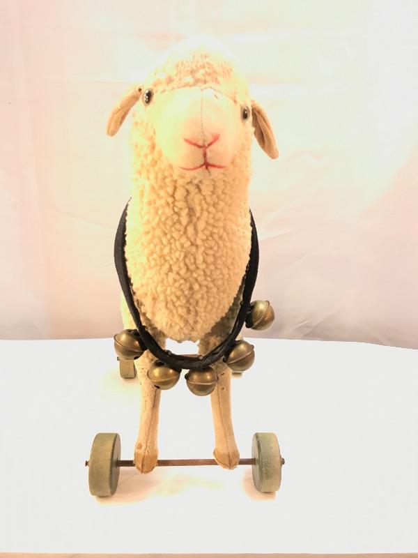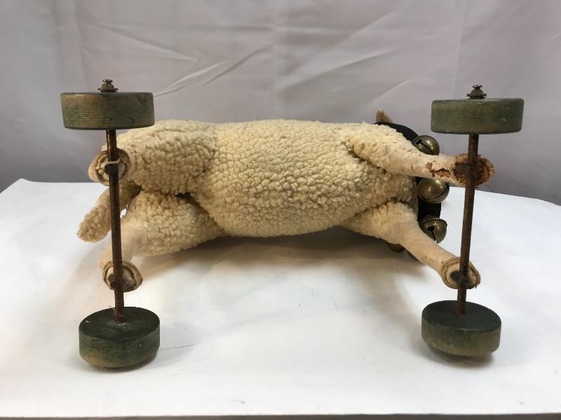 Cute rustic farmhouse decor wooly sheep. Wooly sheep on wheels, bells around his neck. Plush has signs of age and wear, moth holes. Displays nicely, not recommended as a child's toy.