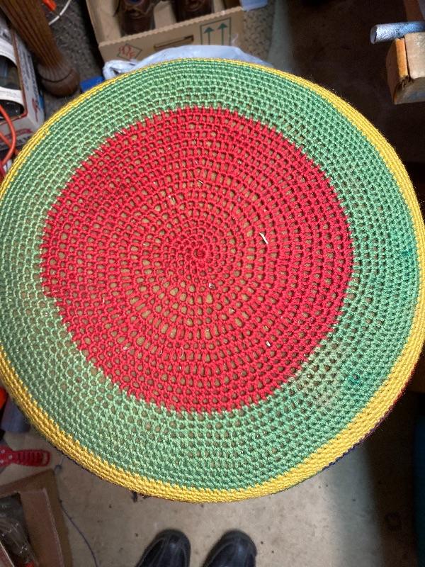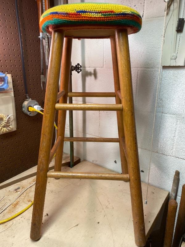 Vintage Work Stool 30 1/2” Oak with Vintage Knitted Cushion