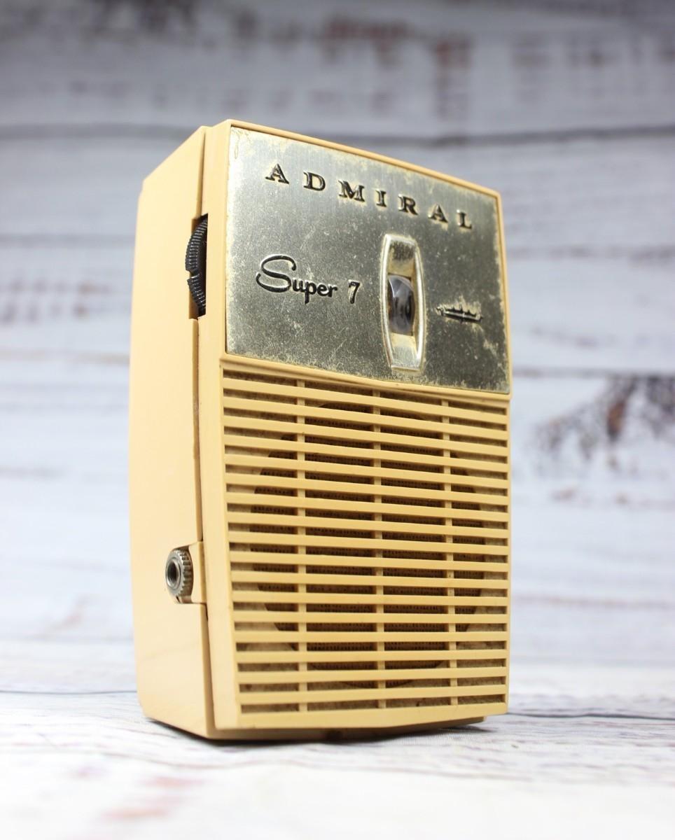 Vintage Admiral Super 7. Portable Transistor Radio, there are no significant cracks or chips to the piece and is in good vintage condition. Has been tested and works perfectly, tunes into a few radio stations successfully. Check pictures for more details and for sizing.