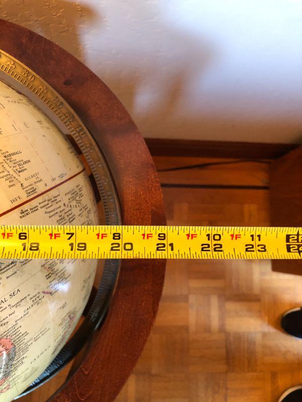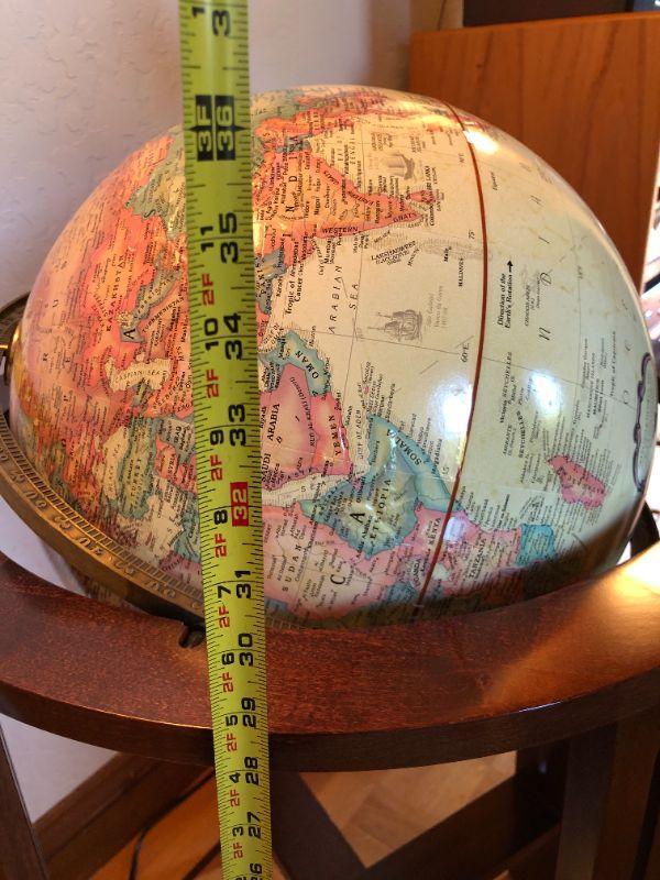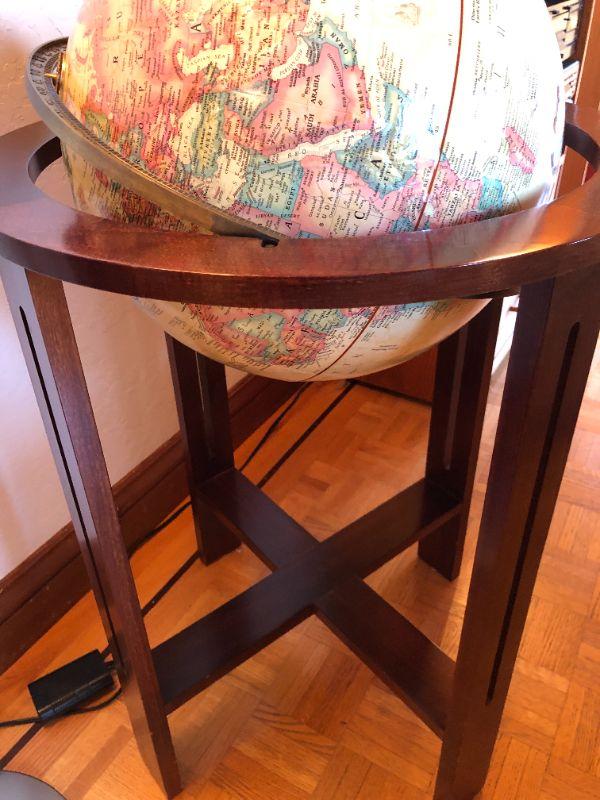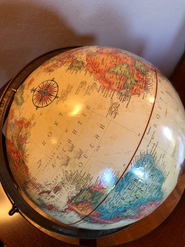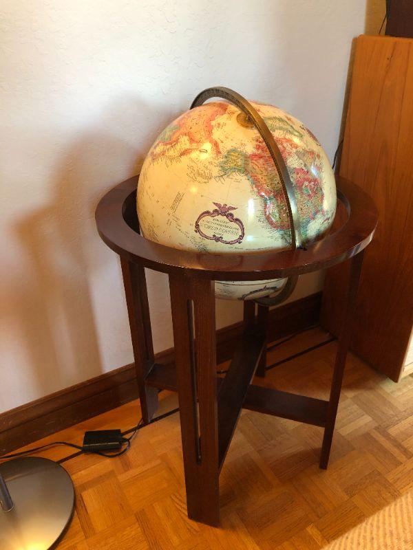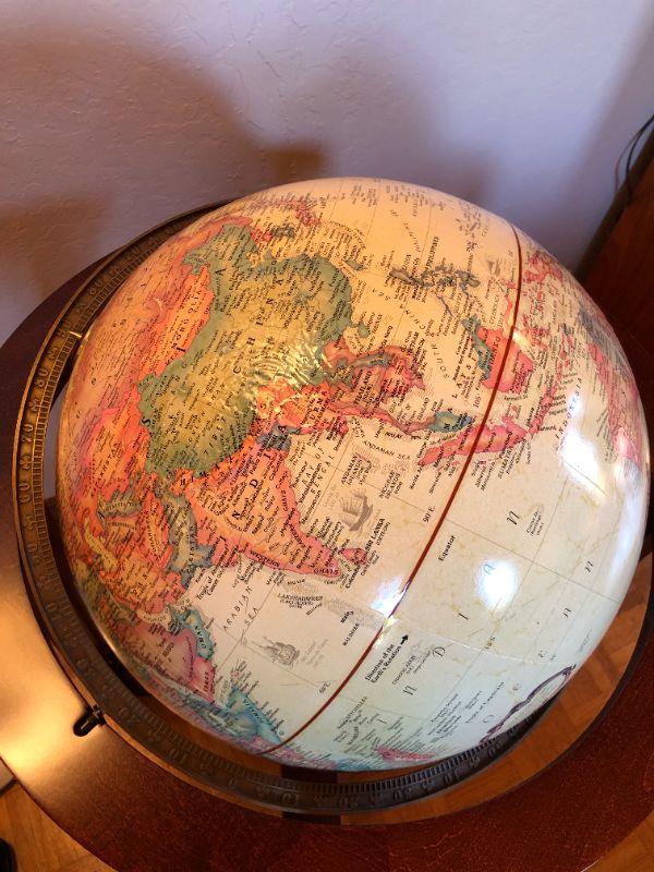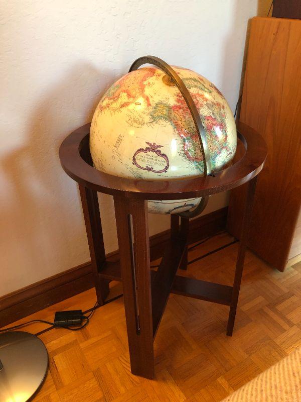 A beautiful vintage globe in a purpose built wood stand. Spins easily and sturdy built. In very good condition.
