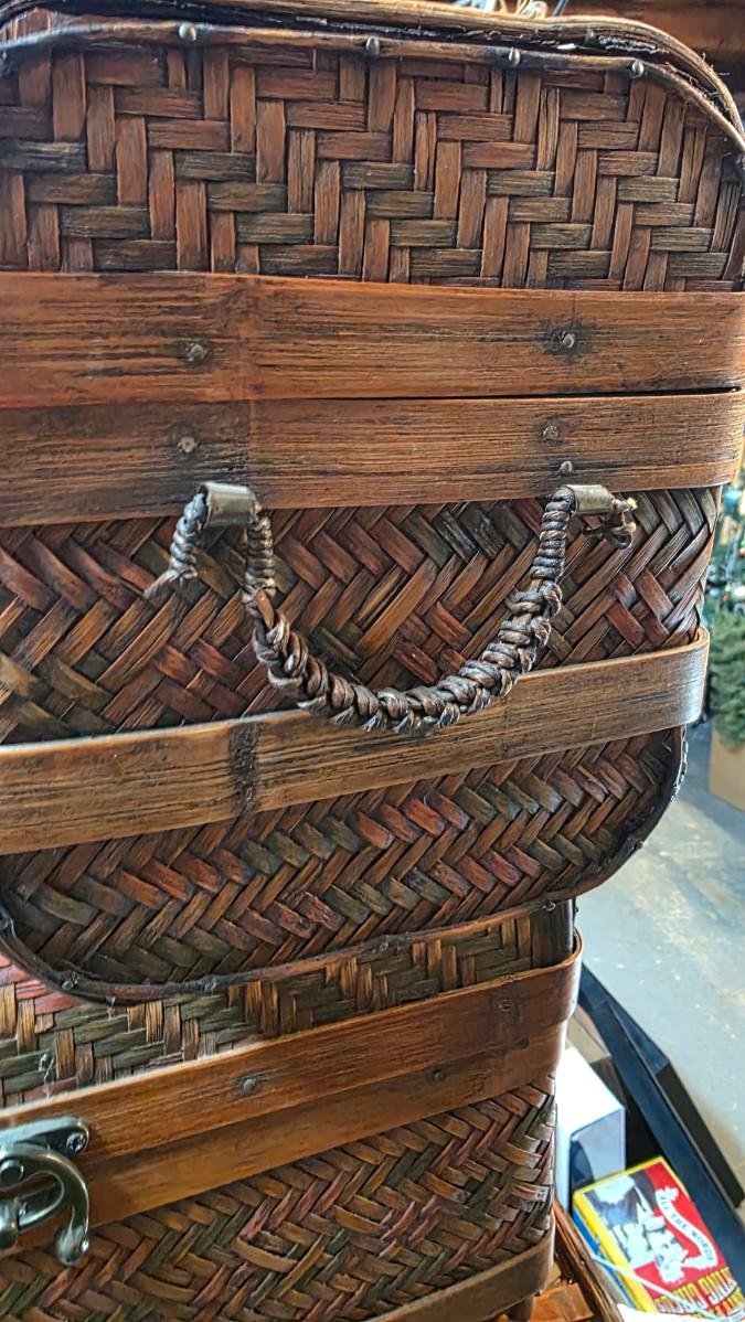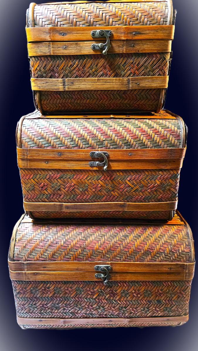 This three-piece vintage woven bamboo trunk set presents a beautifully coordinated display of traditional craftsmanship and timeless design. Each chest is formed with a domed, hinged lid and a tightly woven geometric pattern that creates depth, texture, and visual rhythm across the surface. The natural variation in the bamboo tones gives the set a warm, organic presence that feels both collected and intentional.
