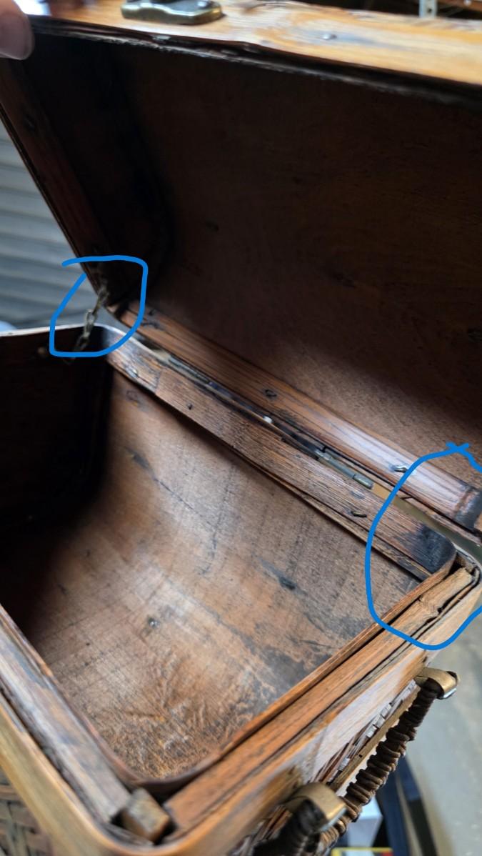 The trunks are constructed with structured wooden framing, reinforced bands, and classic brass-tone latch closures that provide a refined finishing touch. Side handles add balance to the silhouette while enhancing the set’s visual authenticity. Together, the three graduated sizes nest seamlessly, offering a layered presentation that works equally well styled together or separated throughout a space. The smallest trunk is missing the chain on the right side, as shown in pics. It does not affect it's opening or closing, or utility in any way.