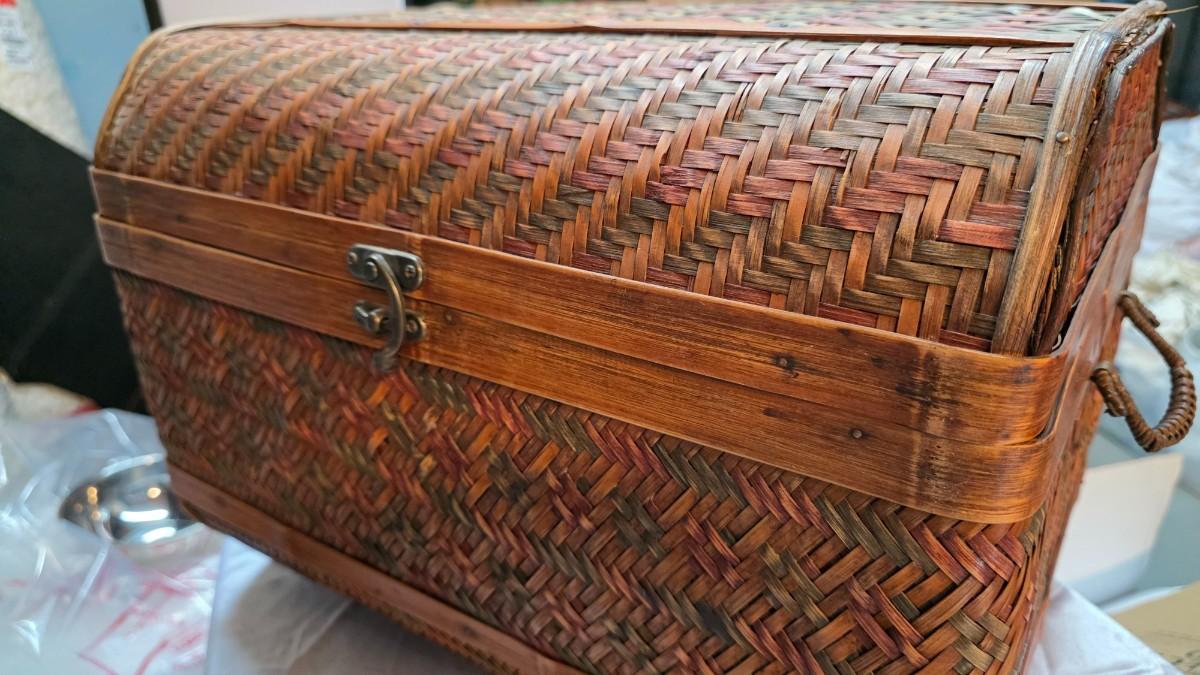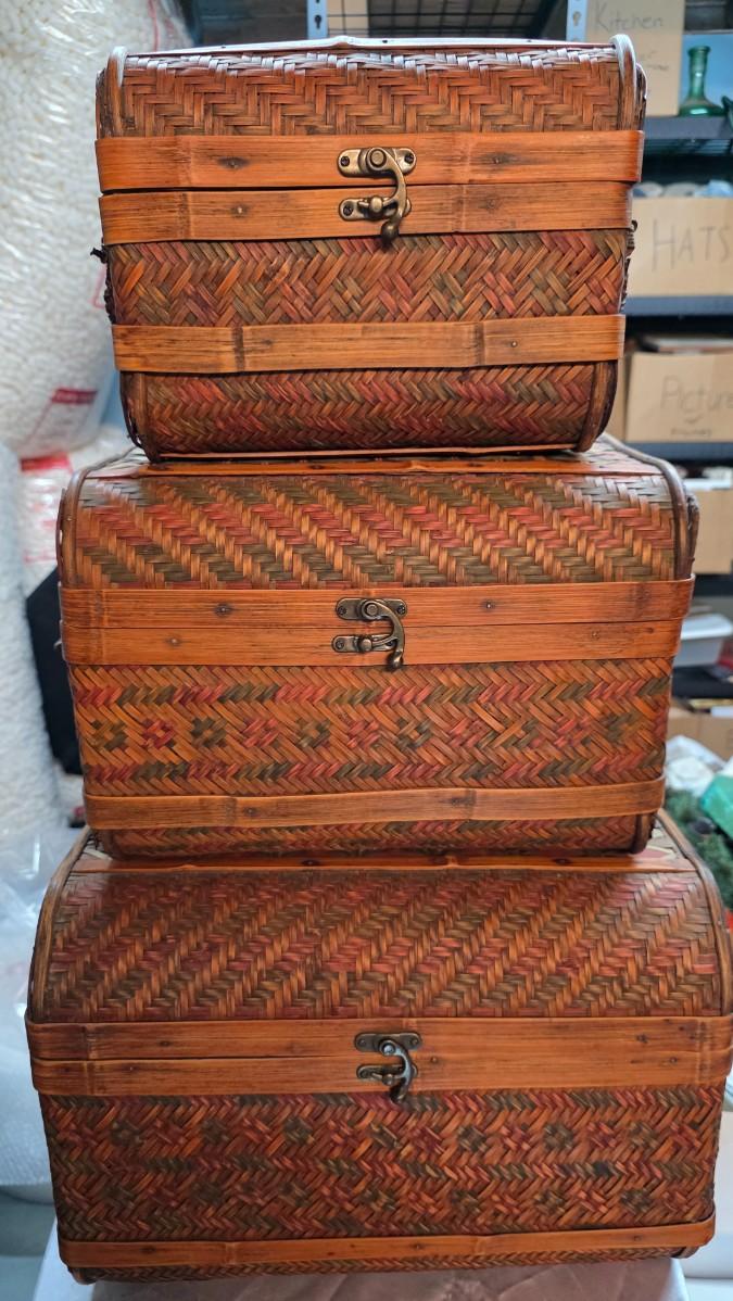 Vintage Woven Bamboo Nesting Trunk Set (3-Piece) with Domed Lids & Brass Latches