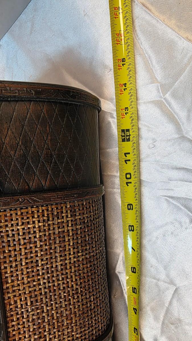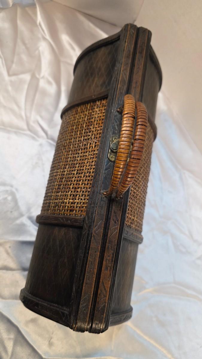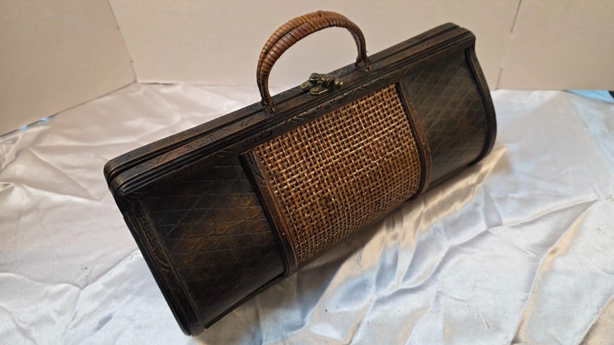 Vintage Woven Cane & Carved Wood Handled Storage Case Decorative Box