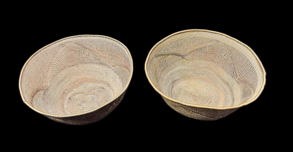 Two pieces. These reticulated, or woven, copper baskets have a light patina. There is age related wear. Measurement: 3”H x 7” Diameter (each), [CS]