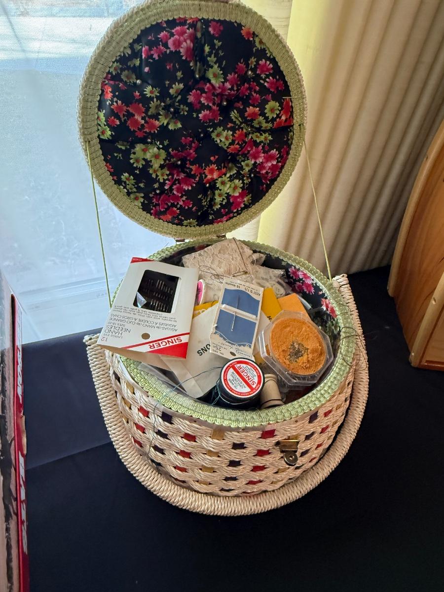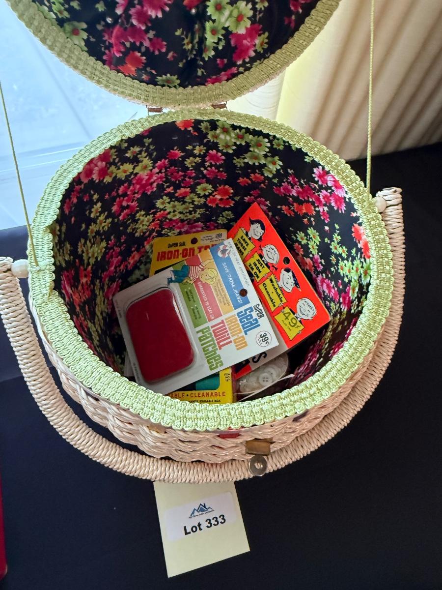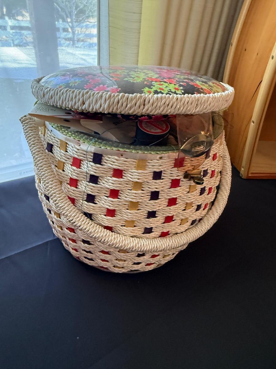 Vintage woven Sewing Basket with accessories