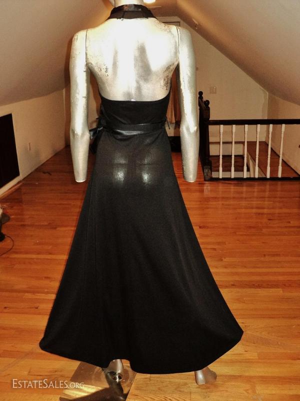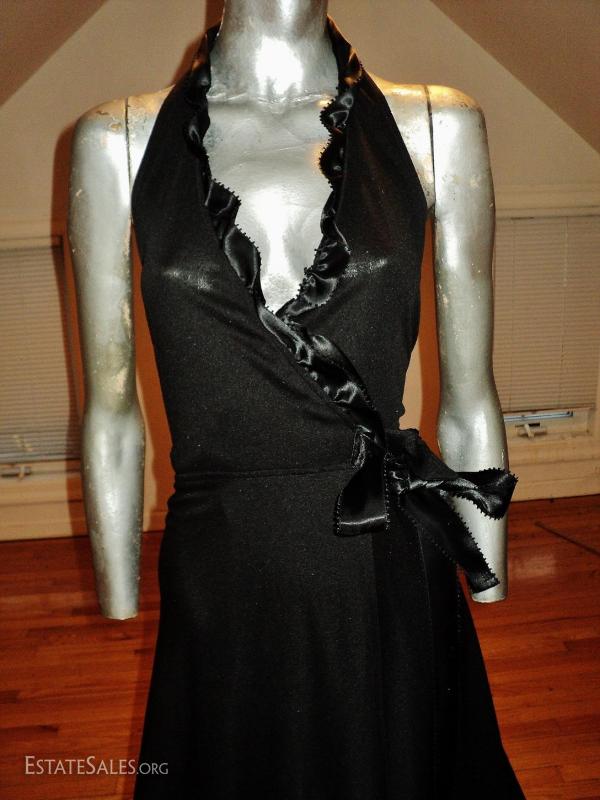 Beautiful wrap gown 1970-80's Statuesque knit fine jersey with ruffle satin ribbon trim around a plunged neckline with a side tie.. A wrap is hard to measure this one will fit a size 7 or a small