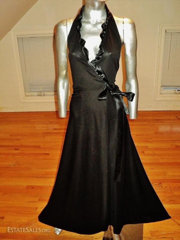 Beautiful wrap gown 1970-80's Statuesque knit fine jersey with ruffle satin ribbon trim around a plunged neckline with a side tie.. A wrap is hard to measure this one will fit a size 7 or a small