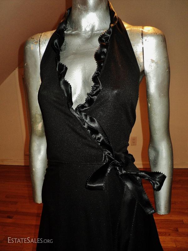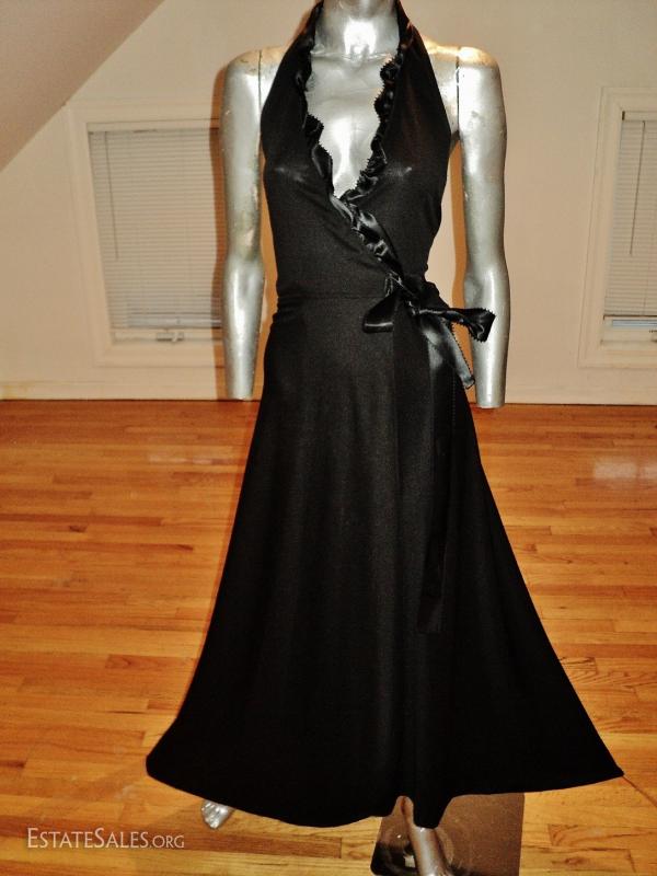 Beautiful wrap gown 1970-80's Statuesque knit fine jersey with ruffle satin ribbon trim around a plunged neckline with a side tie.. A wrap is hard to measure this one will fit a size 7 or a small