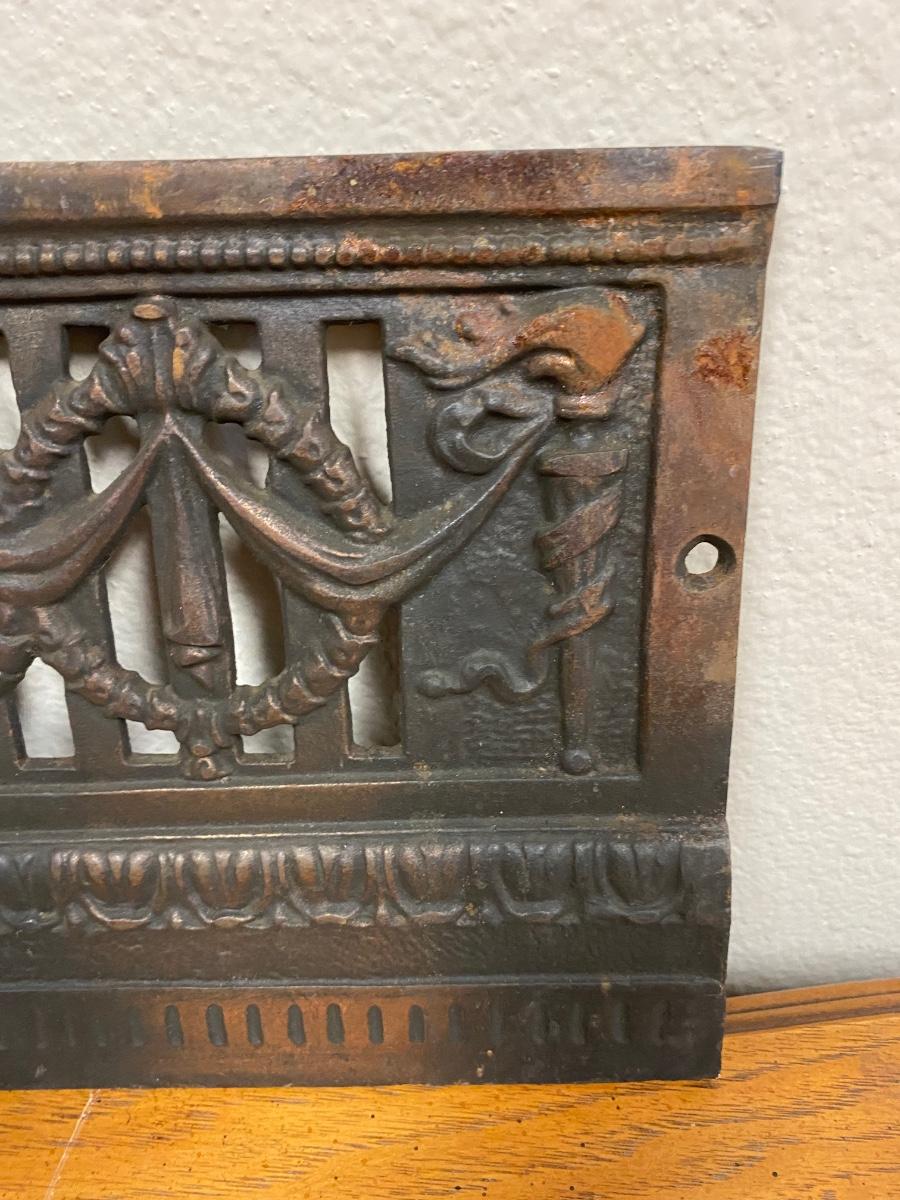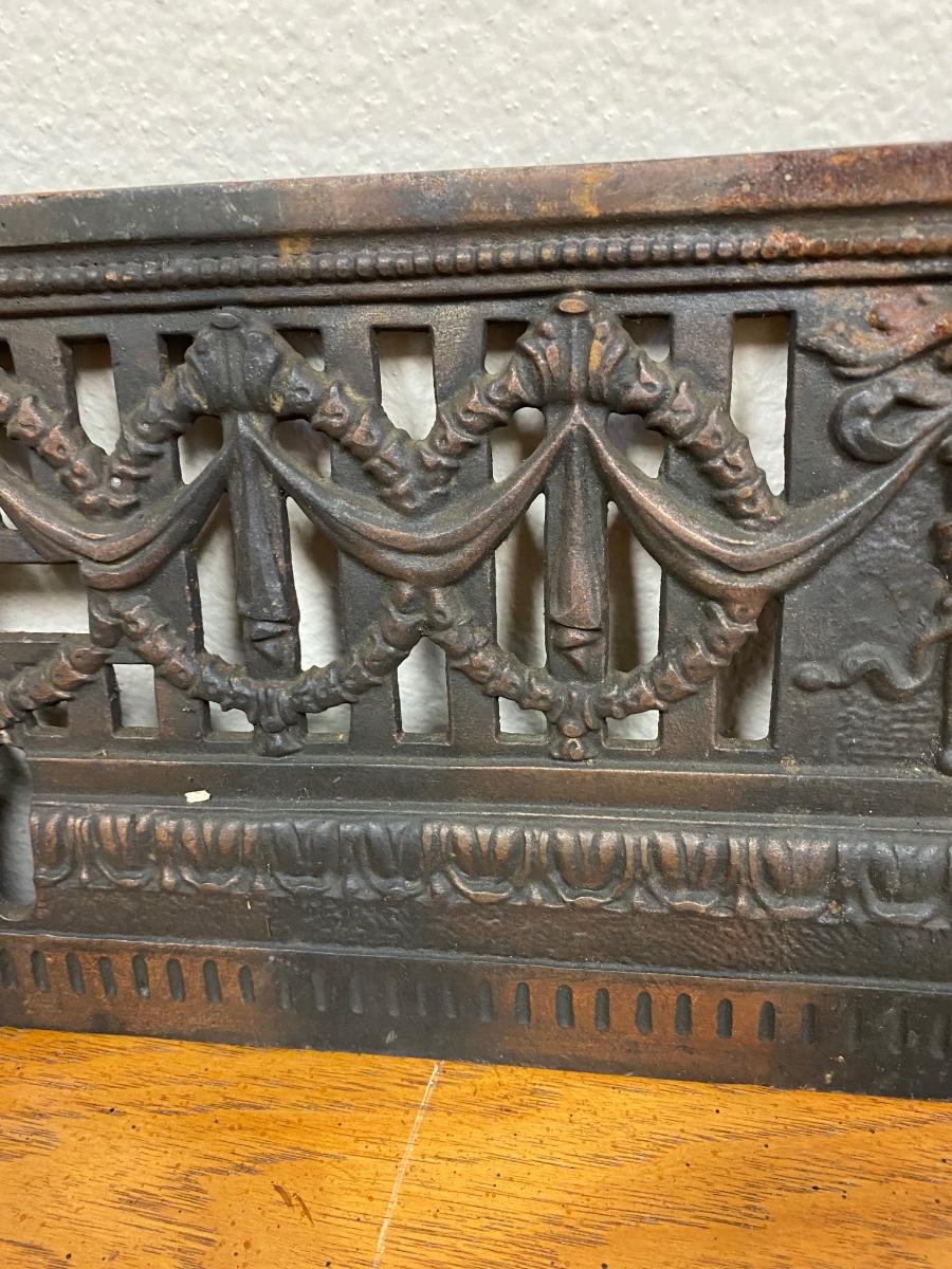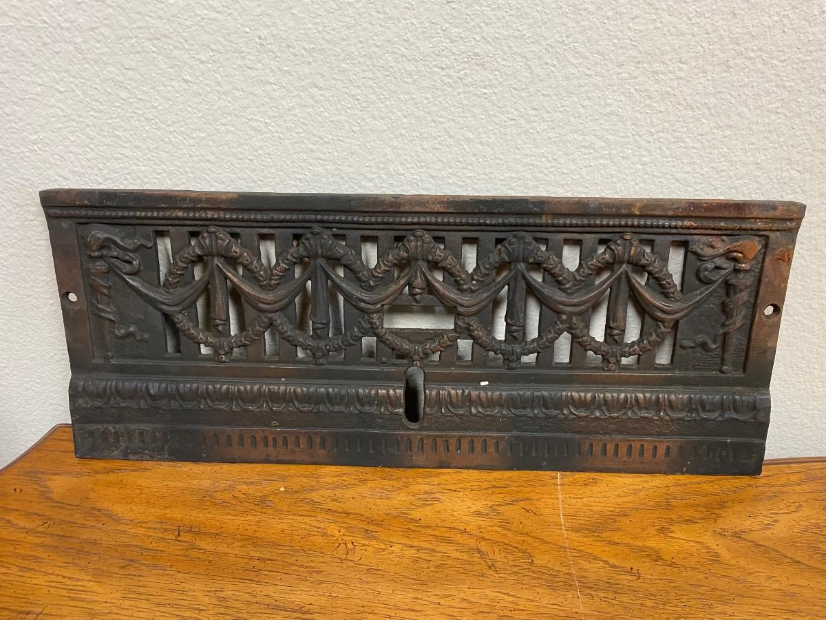 Vintage Wreath Patterned Cast Iron Fireplace Grill. Believe it goes at the front of fireplace, may have had more parts originally. Heavy and soot covered.