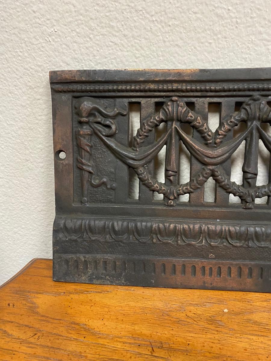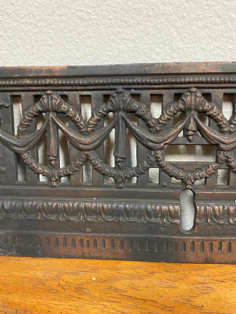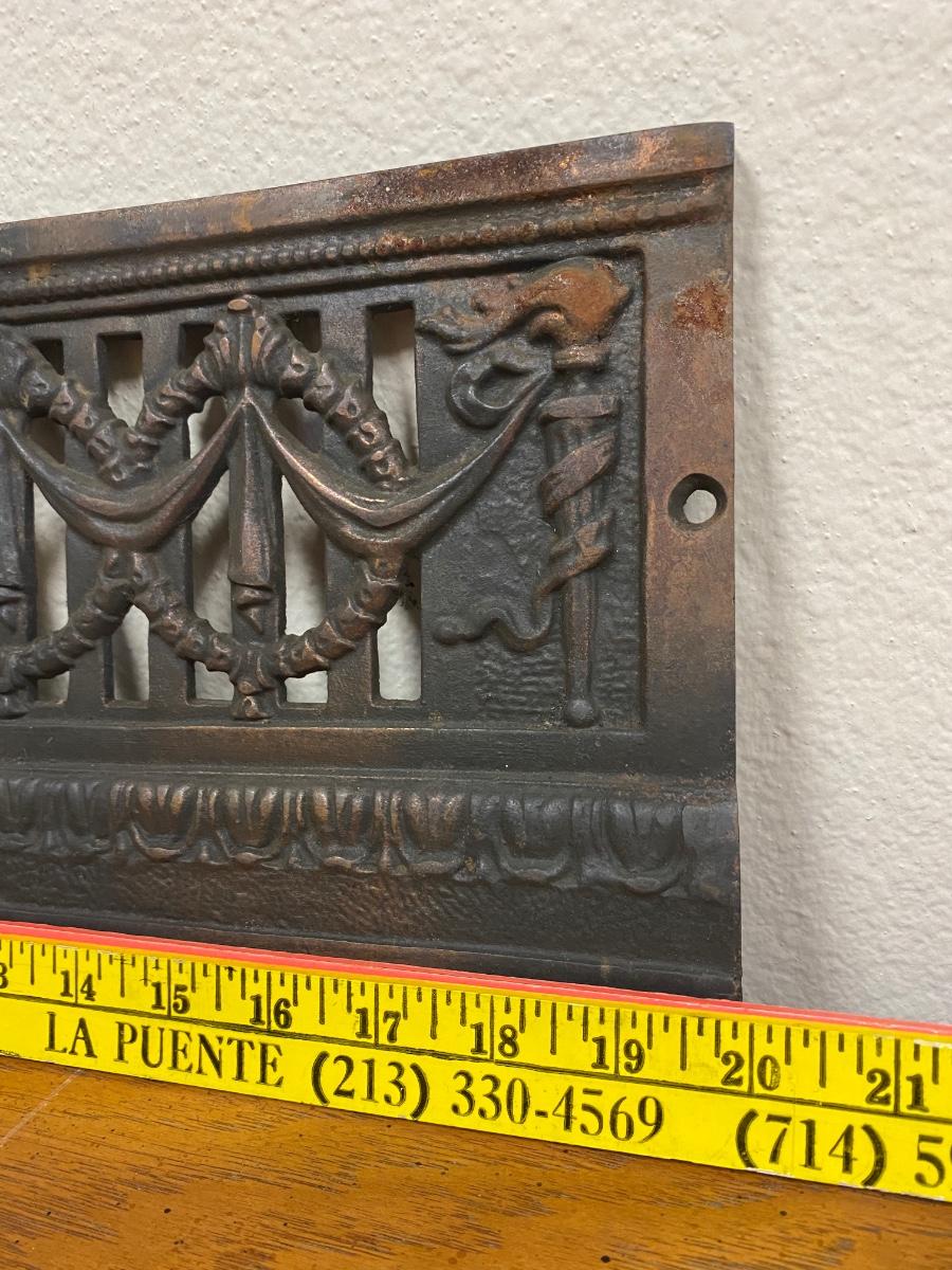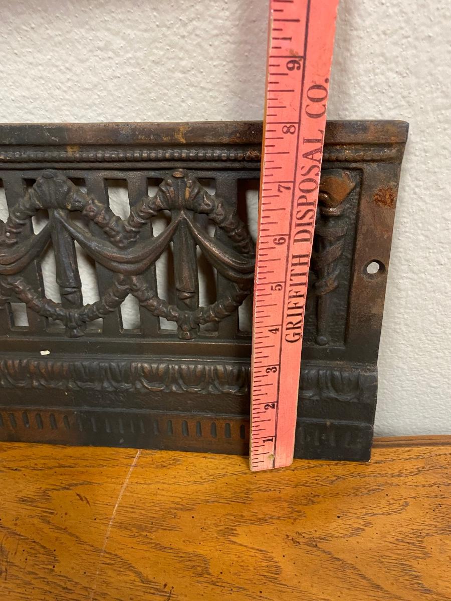 Vintage Wreath Patterned Cast Iron Fireplace Grill. Believe it goes at the front of fireplace, may have had more parts originally. Heavy and soot covered.