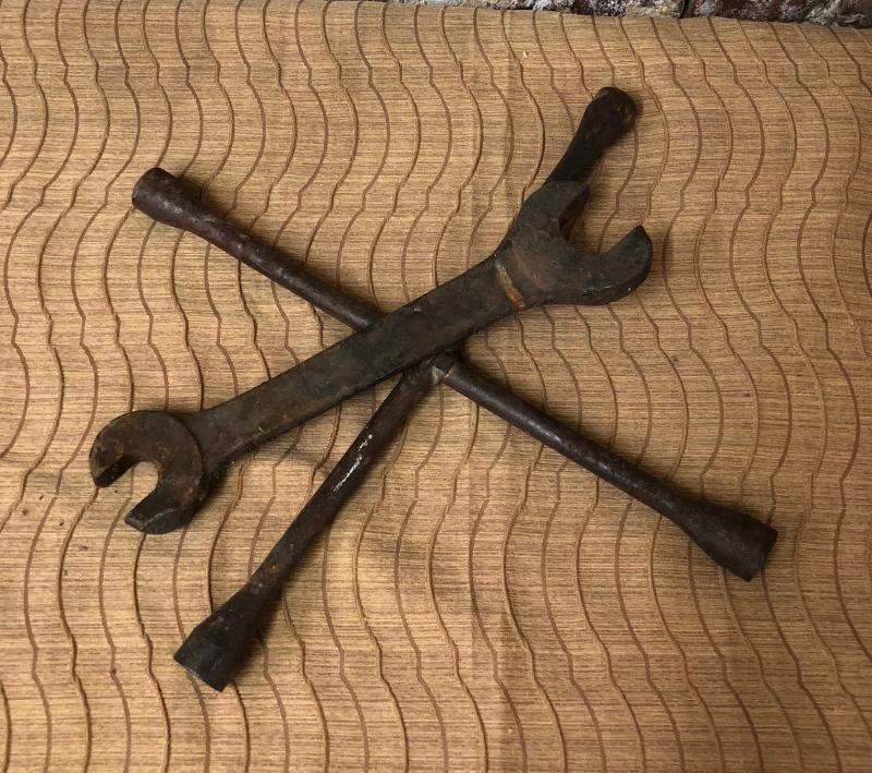 As shown a couple of vintage wrenches a star tire and a large open end...