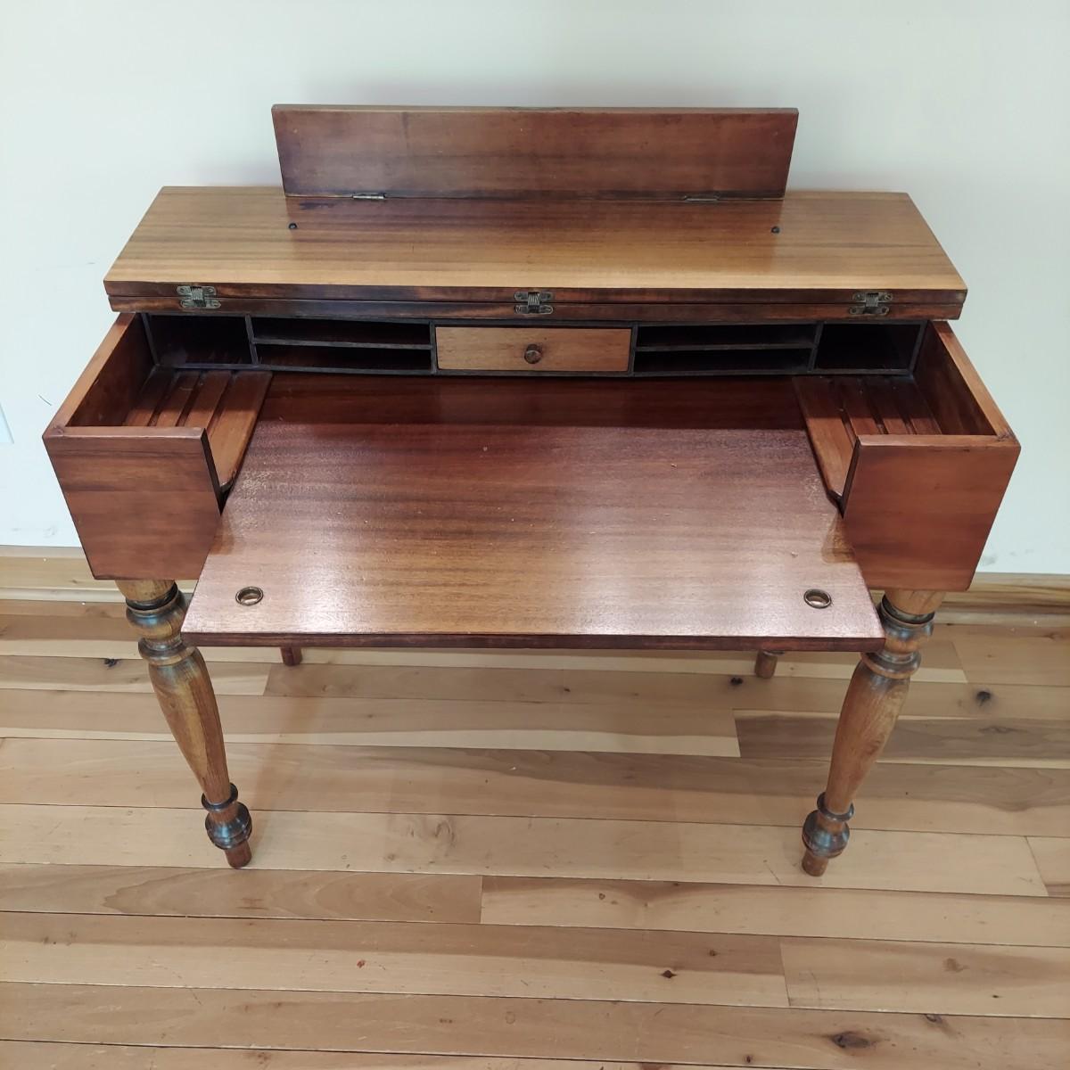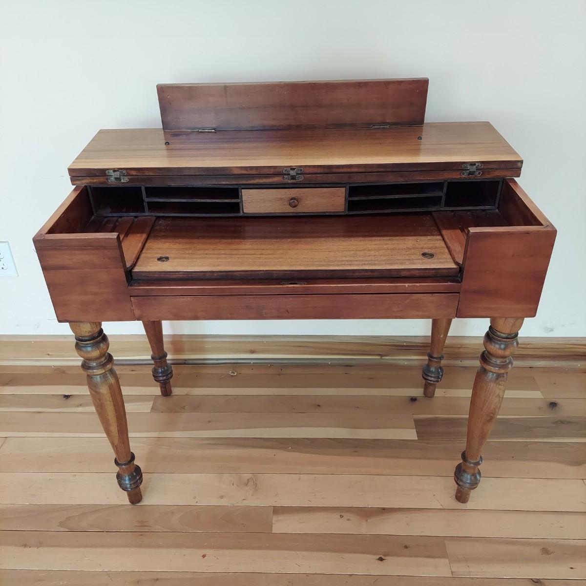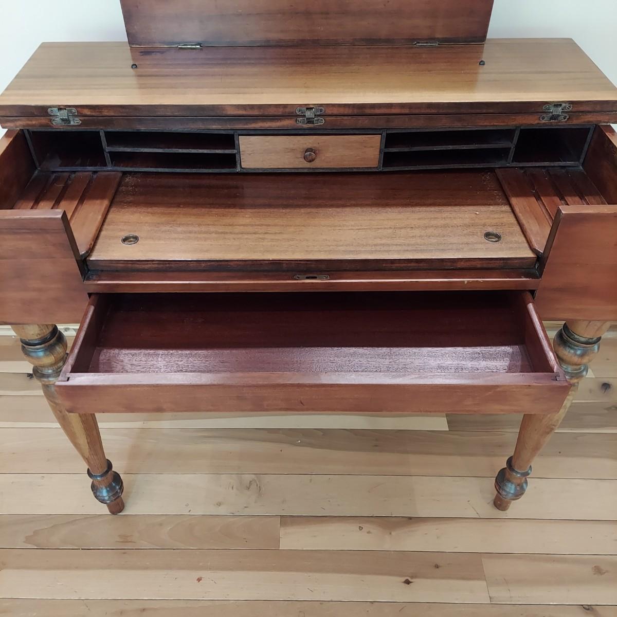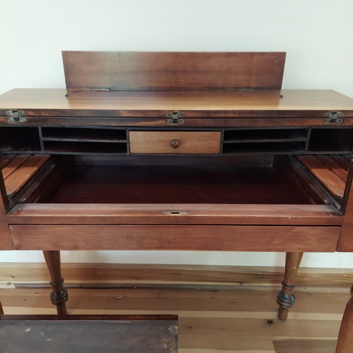 Vintage writing desk. Petite flip top style with many pull outs, drawers and shelves. Appears to be walnut. Please note minor blemishes on front right of desk, as well as front right foot. See photos for more details. Item measures 38”x 20” x 32.5”. Local Pickup Only