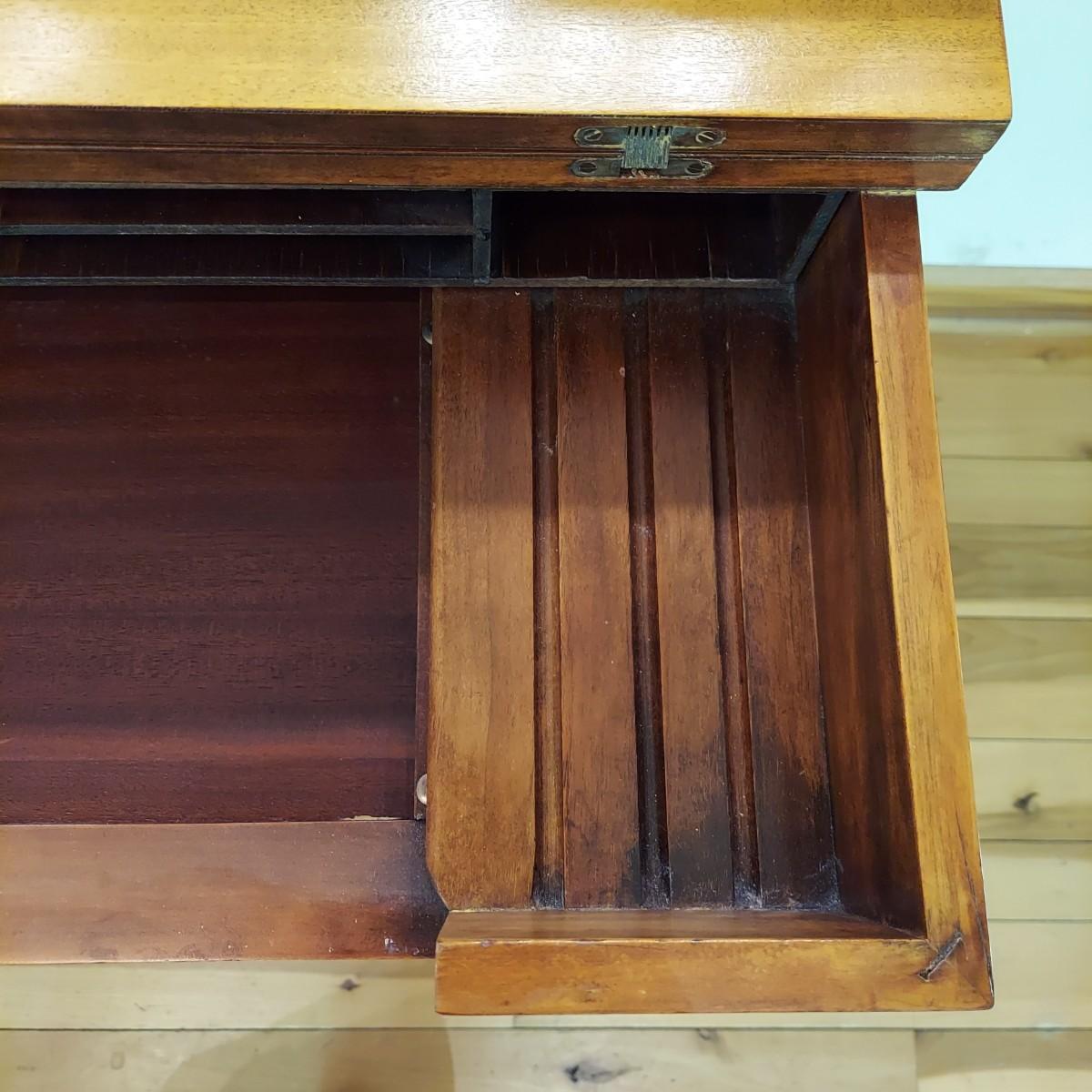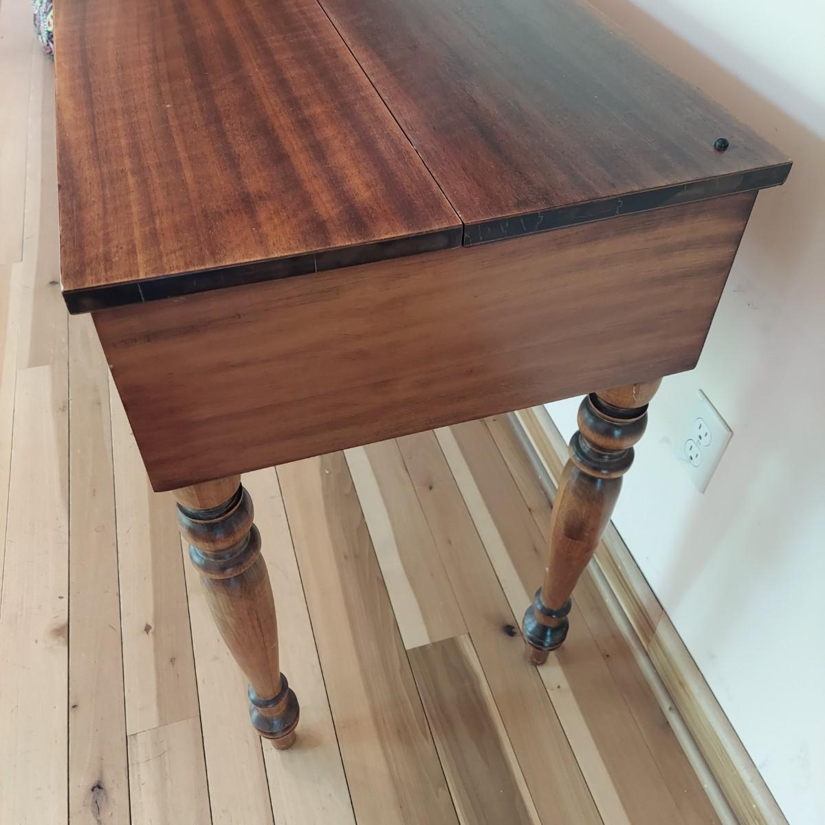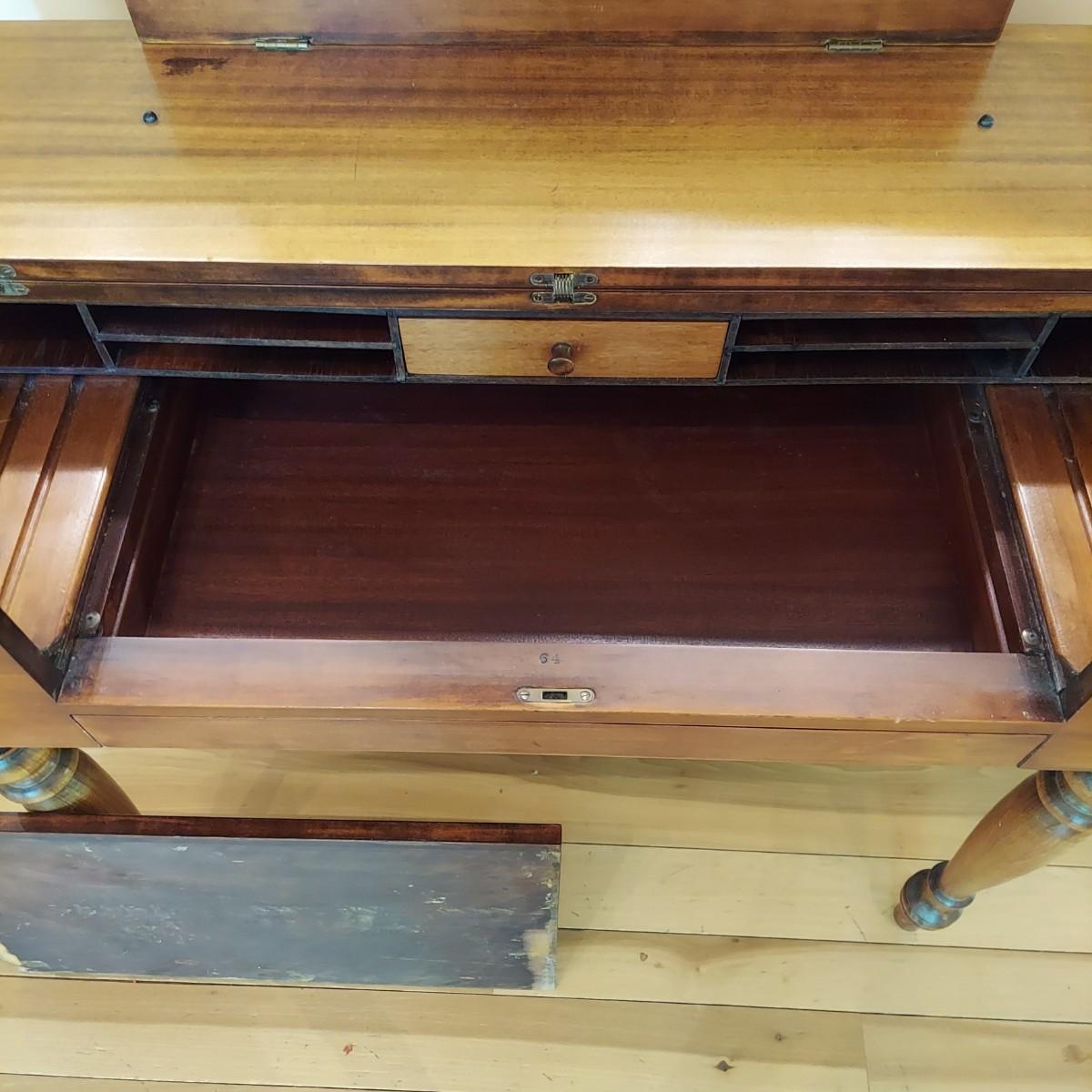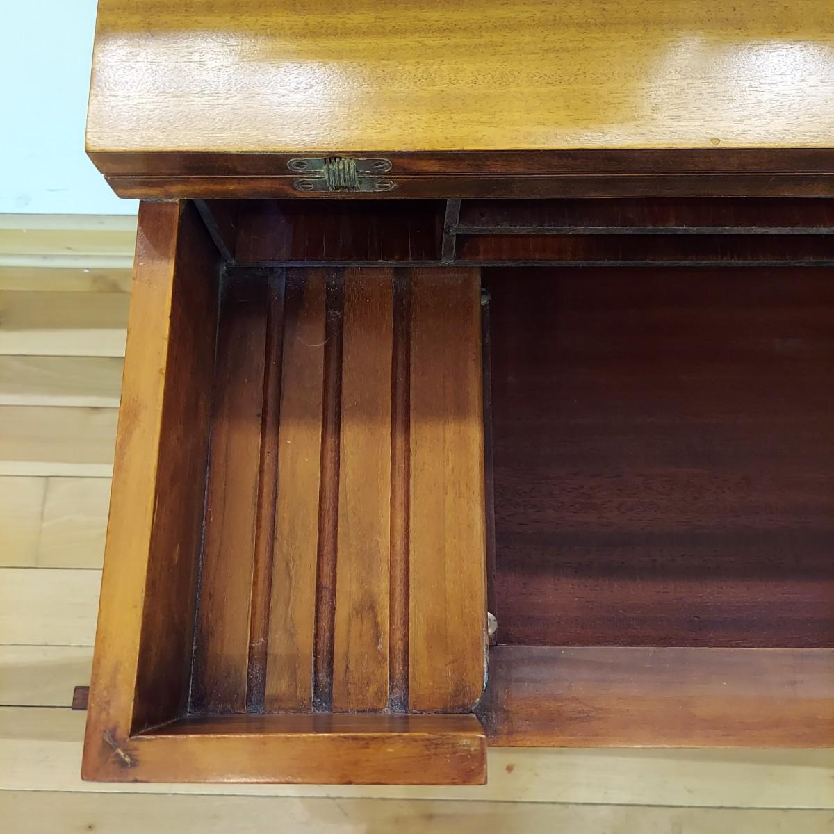 Vintage writing desk. Petite flip top style with many pull outs, drawers and shelves. Appears to be walnut. Please note minor blemishes on front right of desk, as well as front right foot. See photos for more details. Item measures 38”x 20” x 32.5”. Local Pickup Only