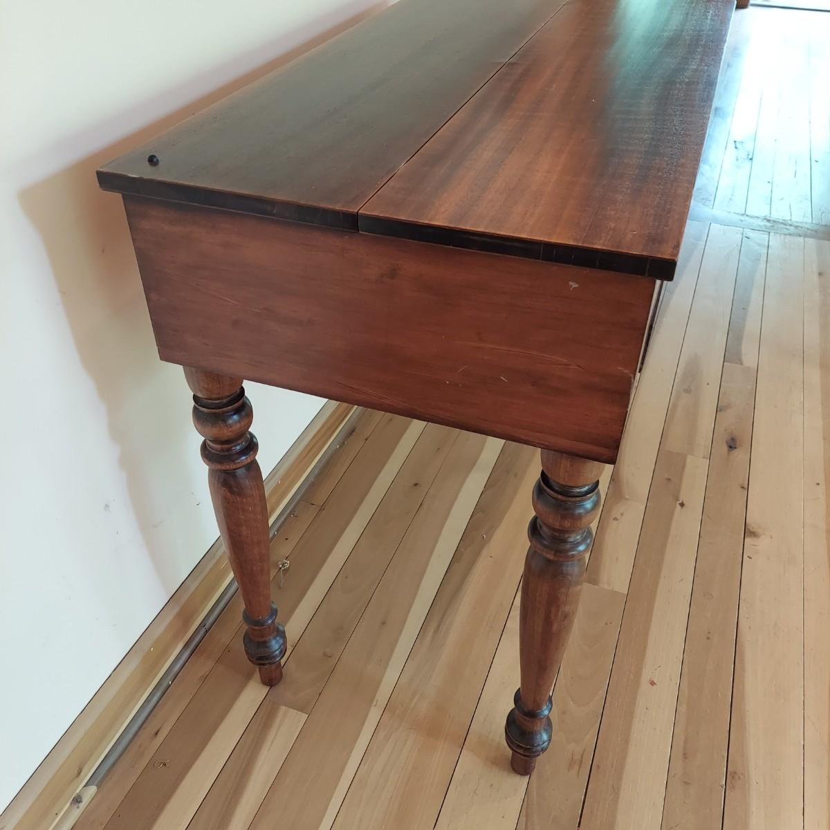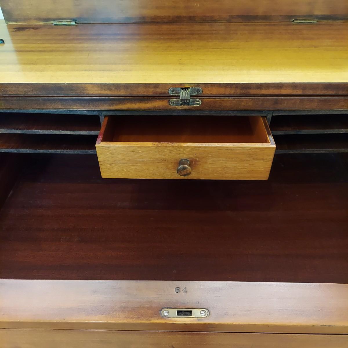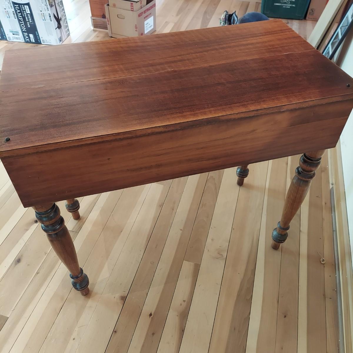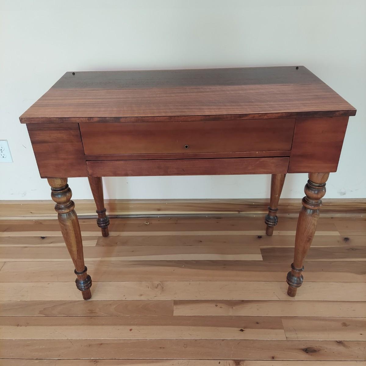 Vintage writing desk. Petite flip top style with many pull outs, drawers and shelves. Appears to be walnut. Please note minor blemishes on front right of desk, as well as front right foot. See photos for more details. Item measures 38”x 20” x 32.5”. Local Pickup Only
