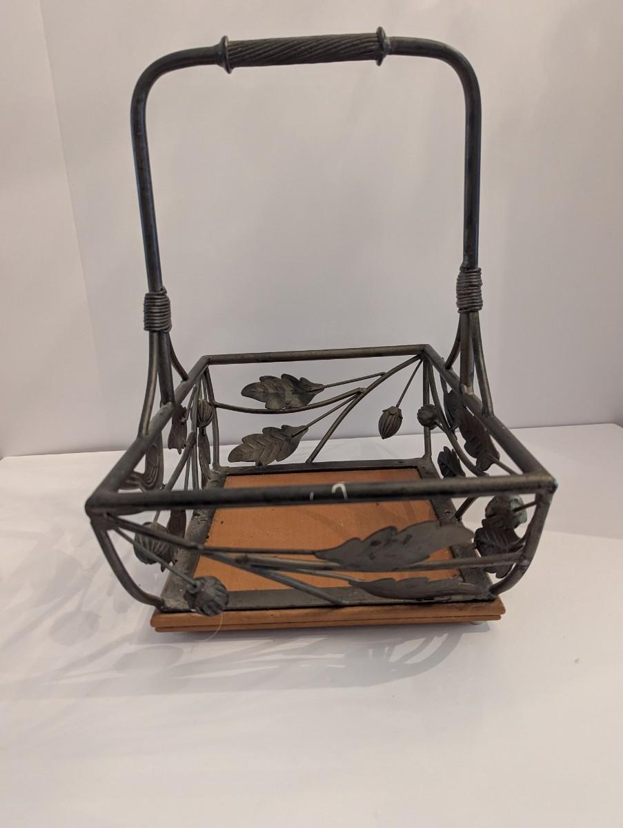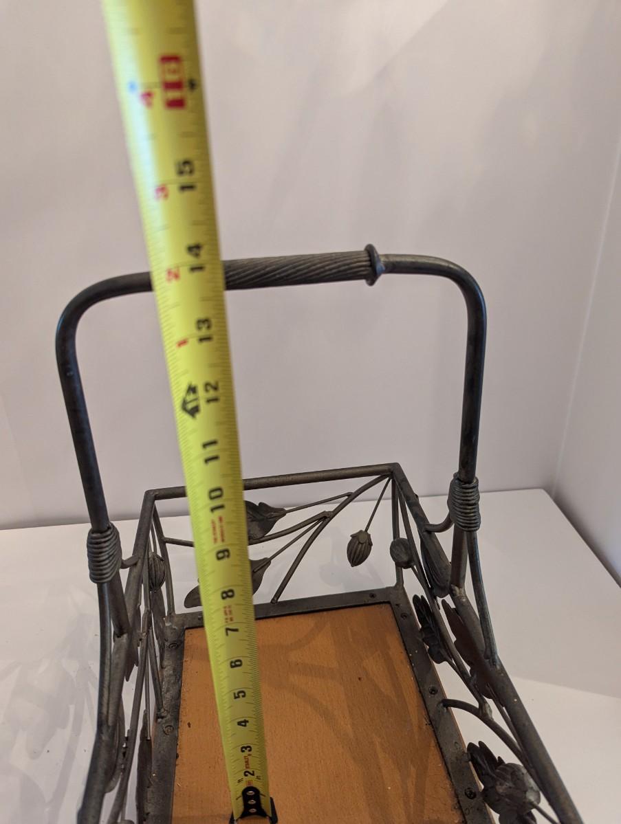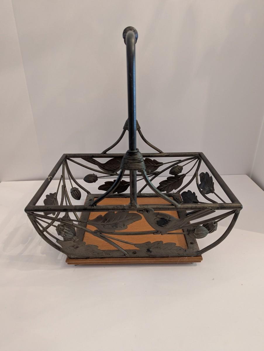 Vintage Wrought Iron Basket Flowers Fruit Garden Birds Leaves Handle Wooden Bottom
