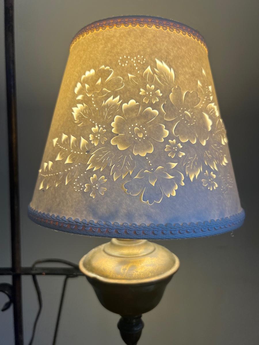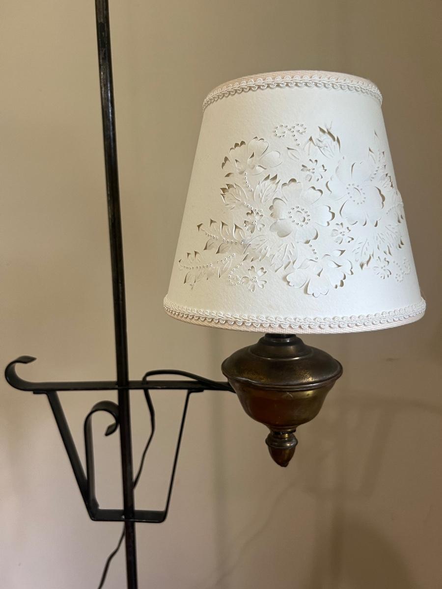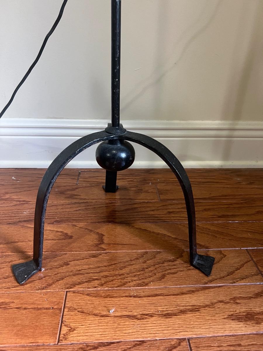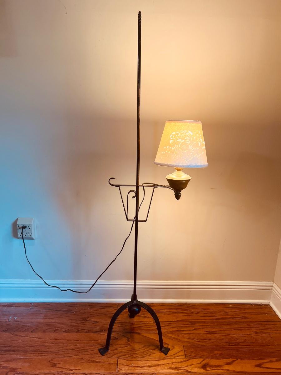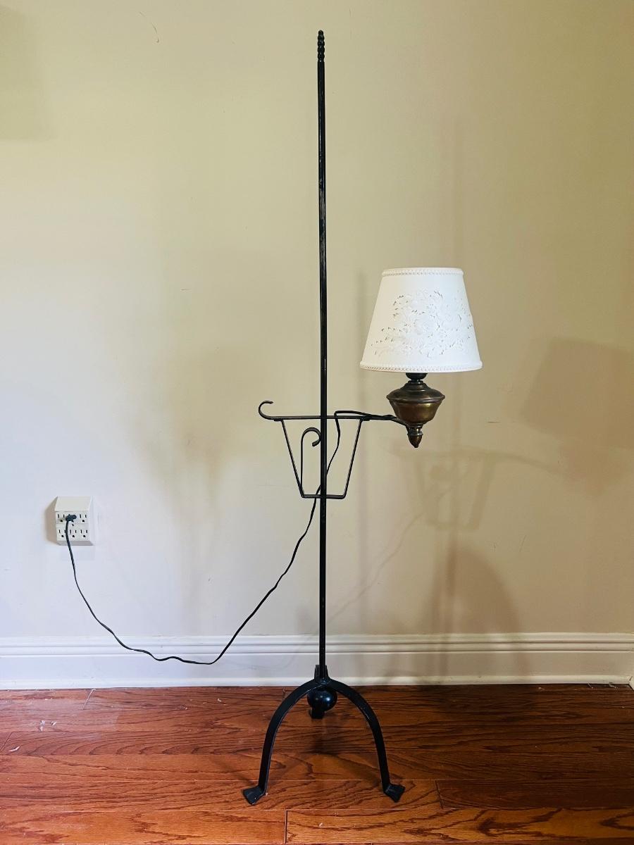One Vintage Wrought Iron Floor Lamp. Black post with brass lamp. Measures 57 inches tall and 18 inches at its widest. Lamp portion is adjustable.
