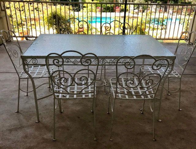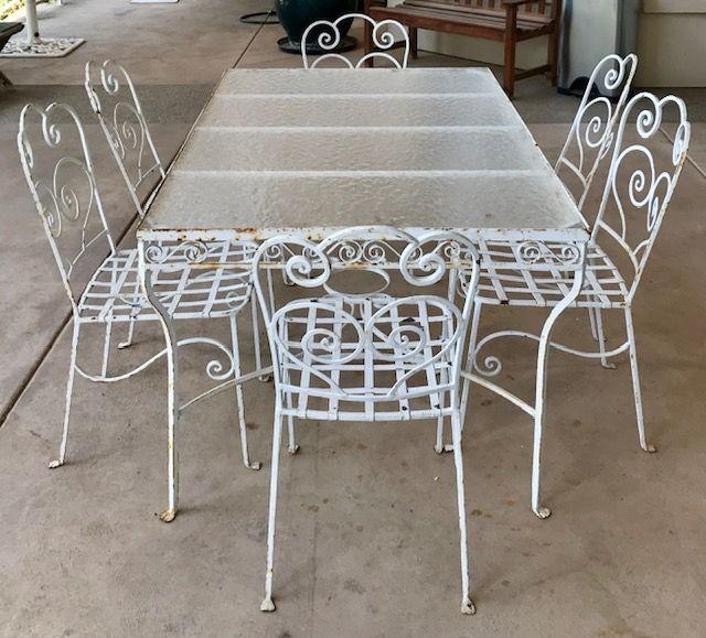 Measures 54 inches long, 36 inches wide and 28 inches tall. Plastic table top. Fair condition, rust throughout, needs to be restored.