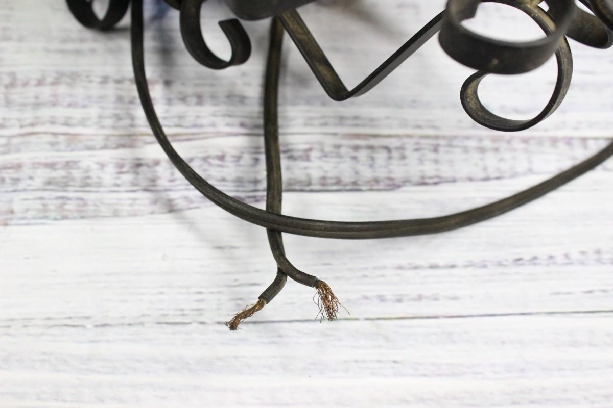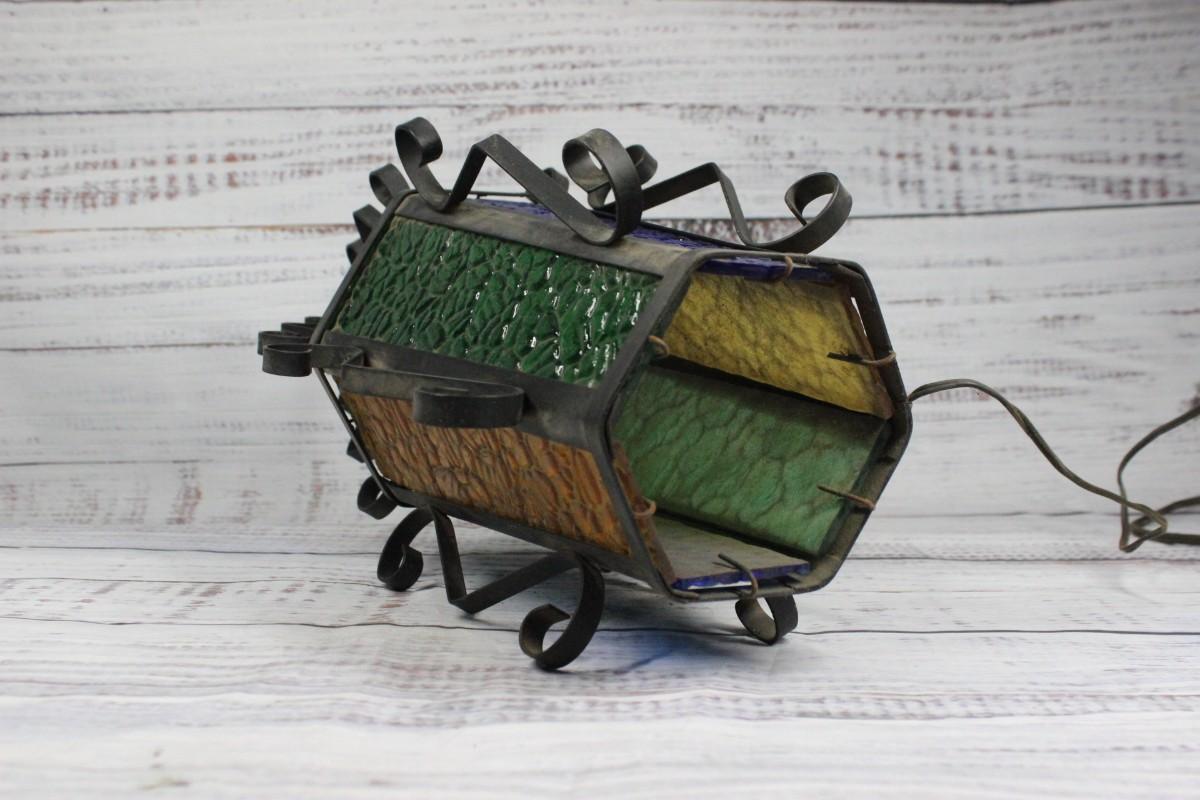 14.5" vintage wrought iron stained-glass lamp. There are no chips or cracks on the glass panels, there is also no significant damage to the iron frame. This was not tested as the cord needs repair.